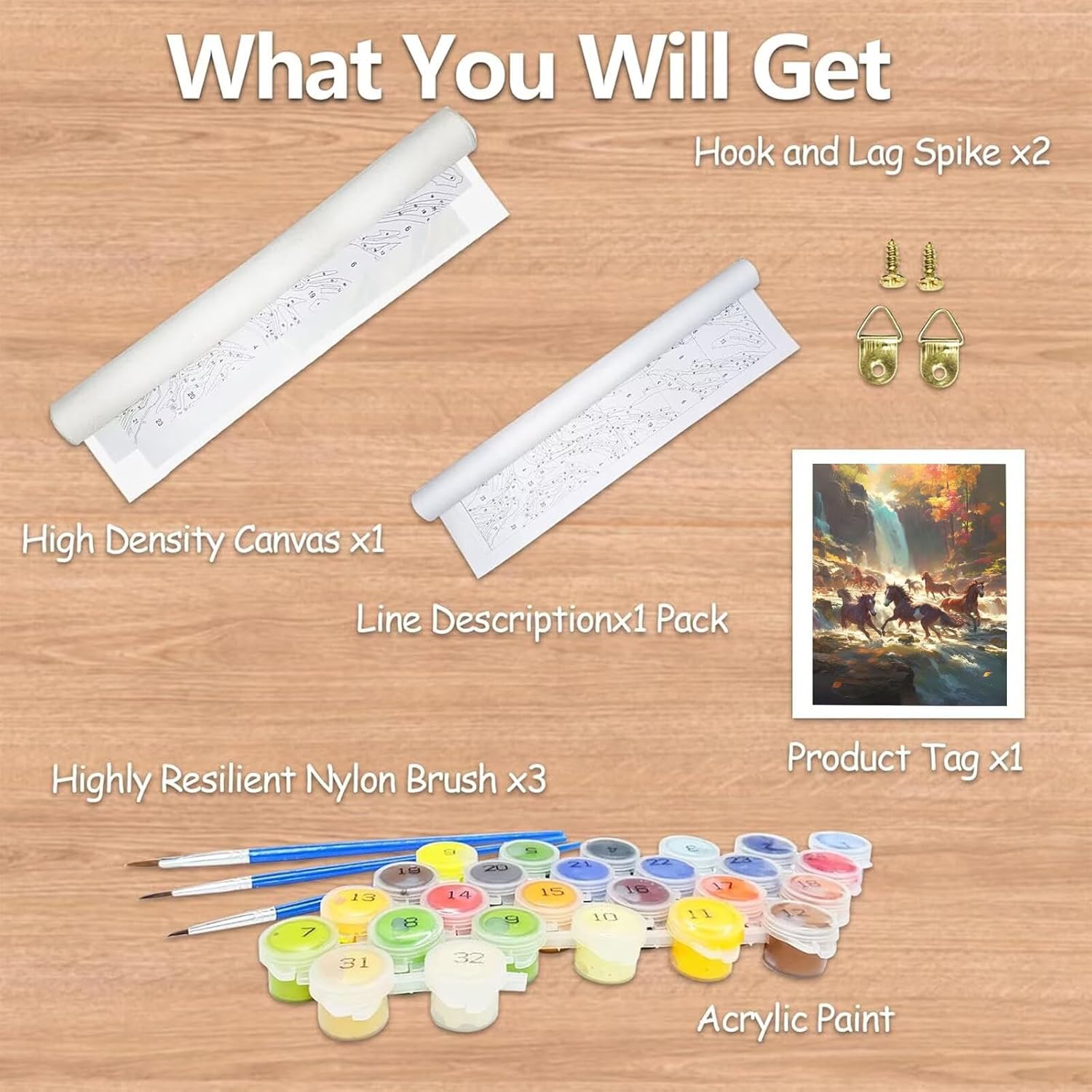 【DIPINGERE CON I NUMERI】:Include una tela (con frame), 3 pennelli da pittura, 1 set di colori di pigmento acrilico e un campione di immagine. Siamo pronti per tutto, aspettando solo che tu dipingi la pittura su tela. 【MATERIALI DI ALTA QUALITÀ】:Realizzato con vernici acriliche di alta qualità e resistenti alla sbiadida e tela spessa e strutturata, questo kit garantisce colori vibranti e opere d'arte di lunga durata. Materiali Superiore lo rendono sicuro per bambini e adulti. La tela in cotone puro, ha buon assorbimento d'acqua e capacità di respirazione, facile da conservare per un lungo periodo di tempo. 【FACILE DA DIPINGERE】:Design senza stress per tutte le età: grandi zone numerate, vernici ad asciugatura rapida e una tela leggera che rimane piatta durante il lavoro. Include istruzioni dettagliate passo dopo passo con aiuti visivi per un progresso semplice. 【REGALI PERFETTI】:Un regalo pensato per compleanni, vacanze o vari giorni di commemorazione. Viene elegantemente scatolato con un design pronto per regali. Ideale per gli amanti dell'arte, gli appassionati di fai da te o chiunque cerchi relax. I pezzi finiti possono essere incorniciati per splendidi arredi domestici! 【SERVIZIO POST-VENDITA】:Godetevi un supporto senza preoccupazioni con il nostro team di assistenza clienti dedicato. Se incontri problemi con il tuo kit, sia che mancano pezzi o preoccupazioni di qualità, contattaci, risolveremo attivamente per te. La tua soddisfazione è la nostra priorità!