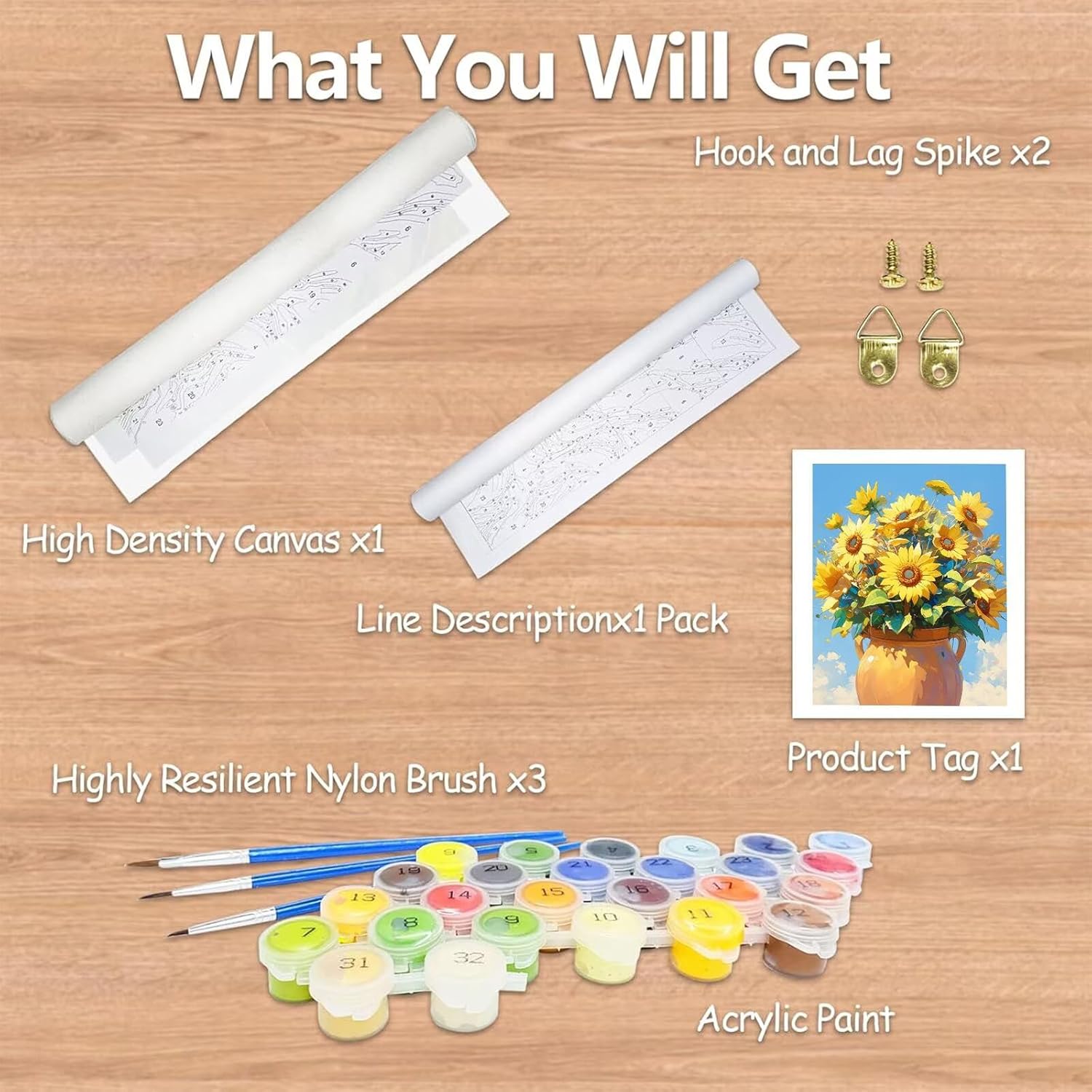 【DIPINGERE CON I NUMERI】:Include una tela (con frame), 3 pennelli da pittura, 1 set di colori di pigmento acrilico e un campione di immagine. Siamo pronti per tutto, aspettando solo che tu dipingi la pittura su tela. 【MATERIALI DI ALTA QUALITÀ】:Realizzato con vernici acriliche di alta qualità e resistenti alla sbiadida e tela spessa e strutturata, questo kit garantisce colori vibranti e opere d'arte di lunga durata. Materiali Superiore lo rendono sicuro per bambini e adulti. La tela in cotone puro, ha buon assorbimento d'acqua e capacità di respirazione, facile da conservare per un lungo periodo di tempo. 【FACILE DA DIPINGERE】:Design senza stress per tutte le età: grandi zone numerate, vernici ad asciugatura rapida e una tela leggera che rimane piatta durante il lavoro. Include istruzioni dettagliate passo dopo passo con aiuti visivi per un progresso semplice. 【REGALI PERFETTI】:Un regalo pensato per compleanni, vacanze o vari giorni di commemorazione. Viene elegantemente scatolato con un design pronto per regali. Ideale per gli amanti dell'arte, gli appassionati di fai da te o chiunque cerchi relax. I pezzi finiti possono essere incorniciati per splendidi arredi domestici! 【SERVIZIO POST-VENDITA】:Godetevi un supporto senza preoccupazioni con il nostro team di assistenza clienti dedicato. Se incontri problemi con il tuo kit, sia che mancano pezzi o preoccupazioni di qualità, contattaci, risolveremo attivamente per te. La tua soddisfazione è la nostra priorità!