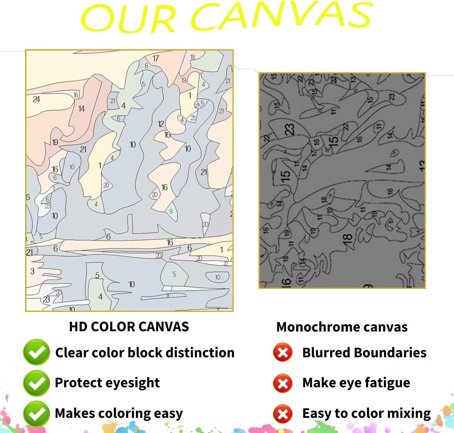 【KIT PER DIPINGERE CON I NUMERI】La nostra bellissima pittura a olio digitale viene fornita con un set completo di strumenti che comprende: 1x tela pre-stampata ad alta definizione (escluso il telaio), 3x pennelli di diverse dimensioni, ampia vernice acrilica, 1x tavolo di riferimento e 1 set di ganci e chiodi. 【TELA A COLORI PRE-STAMPATA HD】 A differenza di altri kit per dipingere con i numeri, la nostra pittura di animali con i numeri utilizza una tela a colori ad alta definizione. L'area dei numeri è più facile da distinguere, previene l'affaticamento degli occhi e rende la pittura più facile, la tela ad alta densità e impermeabile, non sbiadisce anche dopo molti anni. 【AMPIA APPLICAZIONE】La pittura a olio digitale completata può essere utilizzata per decorare le pareti, come camere da letto, soggiorni, cucine, uffici, ecc, aggiungendo colore a questi luoghi. Allo stesso tempo, la pittura a olio digitale è anche un regalo unico per la famiglia, gli amici, i bambini durante le festività come Natale e Pasqua. 【DIVERTIMENTO FAI-DA-TE】 La produzione di pittura per numero richiede una certa quantità di tempo. Quando si completano i kit di pittura per adulti, è possibile aumentare il senso di realizzazione, ridurre lo stress, regolare le emozioni, coltivare la pazienza. Chiunque può completare un'opera d'arte squisita in modo indipendente, il che è molto adatto ai principianti. 【SERVIZIO POST-VENDITA】Dopo aver ricevuto il prodotto, se avete domande su paint by numbers, vi preghiamo di contattarci e di inviarci un'e-mail su Amazon, lo risolveremo per voi il più presto possibile, Si prega di non preoccuparsi, saremo responsabili per il vostro ordine