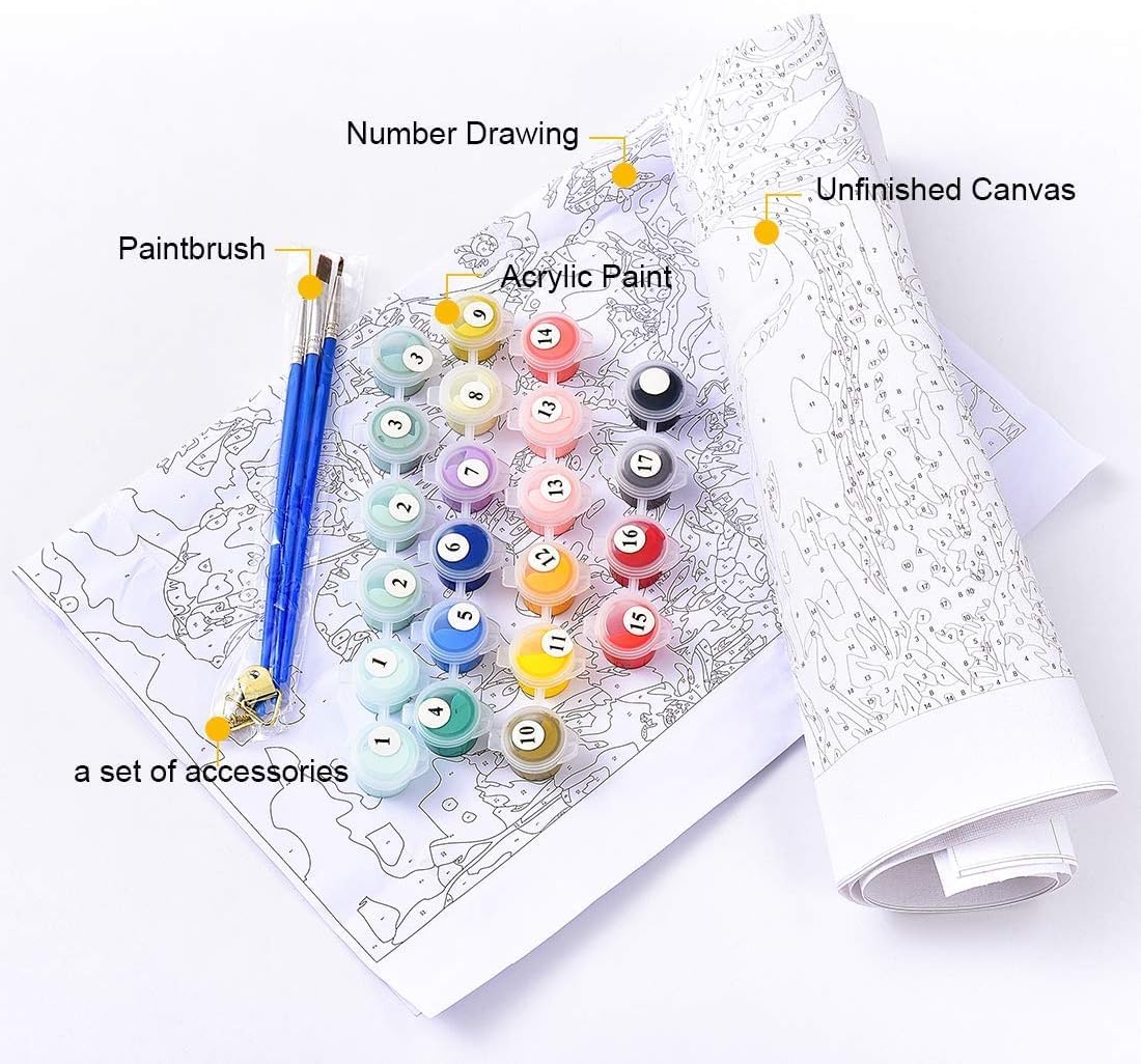 Kit di pittura a olio su tela per adulti Abbinamento: --Ovunque a casa di comfort. La tua stanza, soggiorno, cucina, garage e ovunque tu possa liberare la tua creatività. --Portalo al parco. Posiziona il cavalletto sotto il sole o l'albero. Immergi i pennelli nella vernice e segui i numeri. - Ideale per l'aula scolastica. Dare agli studenti un piacere. Questo è un progetto che li terrà occupati e promuoverà il team building poiché ogni set viene fornito con tre pennelli. - Fai qualcosa di divertente con la famiglia, un amico o un partner romantico. Attività incredibilmente facile a cui partecipare insieme per un sacco di divertimento. Dipingere con i numeri è adatto per --Principianti. Novizio. Esperti. --Tutte le età (dai 3 anni in su). Che tu sia un campione di disegni di figure stilizzate, un eroe avanzato di libri da colorare o il prossimo Van Gogh; Paint by Numbers è per te. La confezione include: 1 tela di puro cotone. 1* Foto per riferimento 3 pennelli (piccolo, medio, grande). 2 ganci. 2 chiodi. 1 set di colori acrilici. Stampa personalizzata Il nostro Paint by Numbers può anche essere realizzato su misura per adattarsi alle proprie dimensioni, foto o immagini.