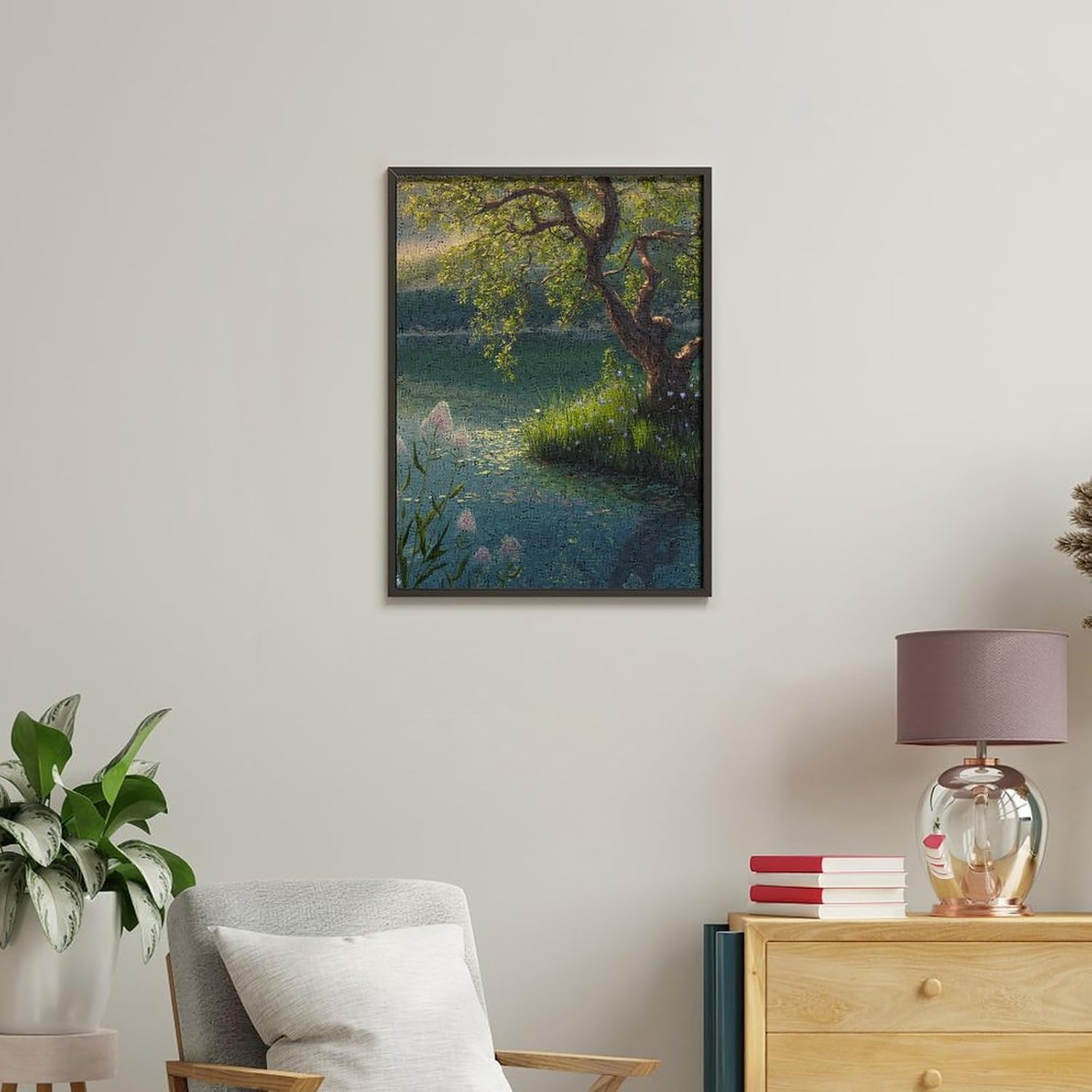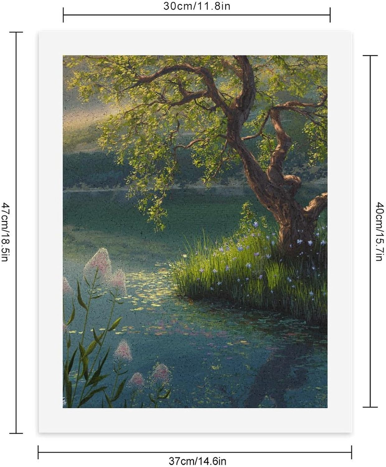 Dipingi coi numeri, un lago tranquillo con un albero nobilitato e fiori colorati al suo fianco, kit per pittura digitale per adulti, crea la tua scena magica forniture artistiche senza cornice, 40 x