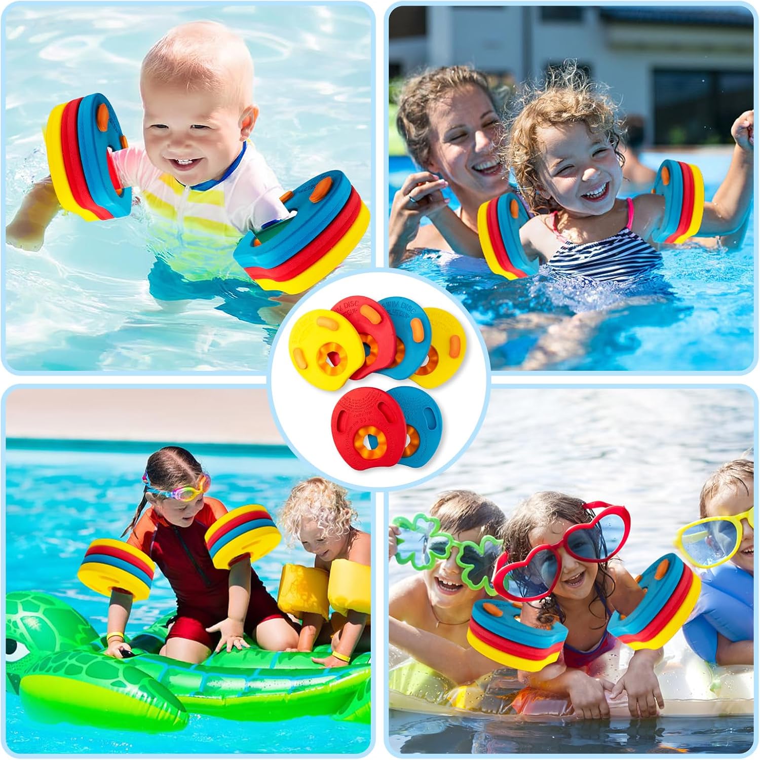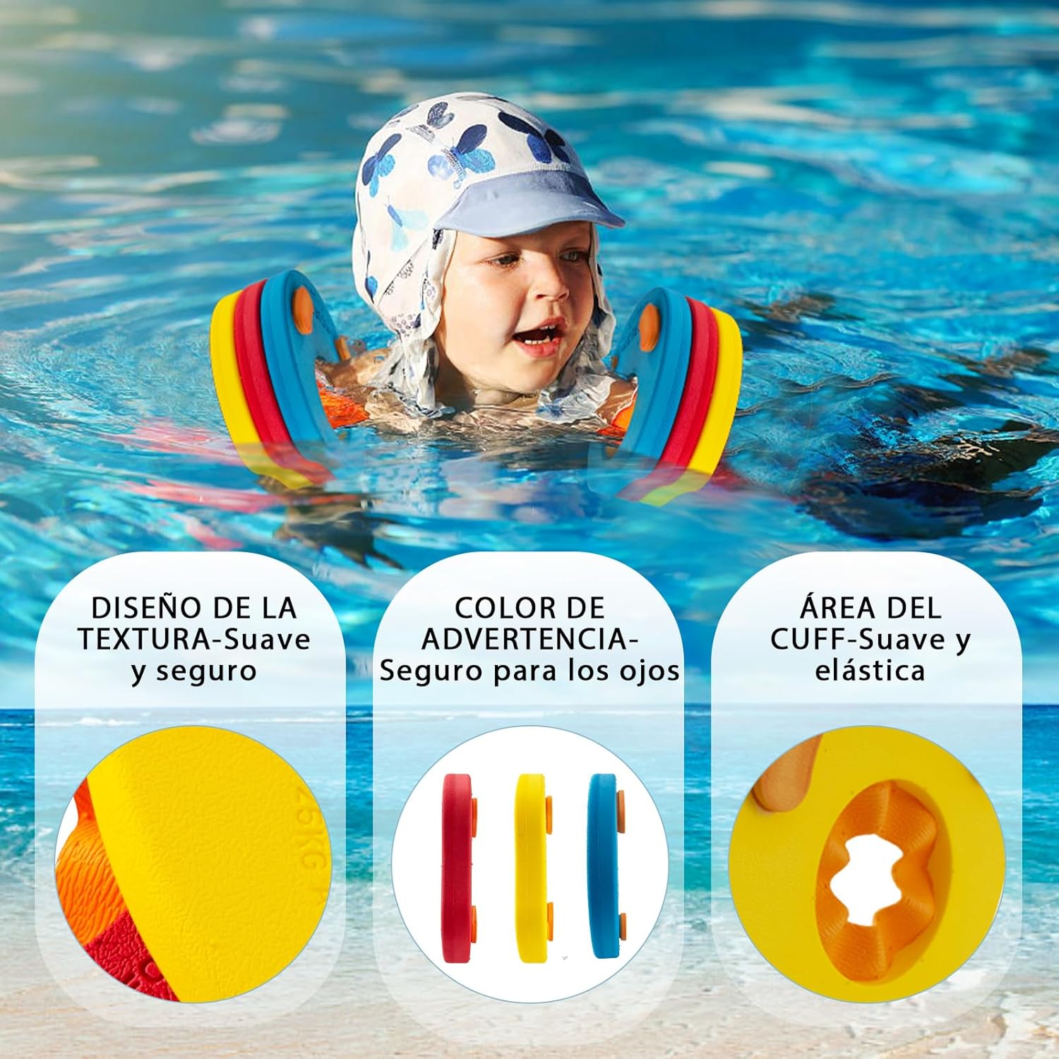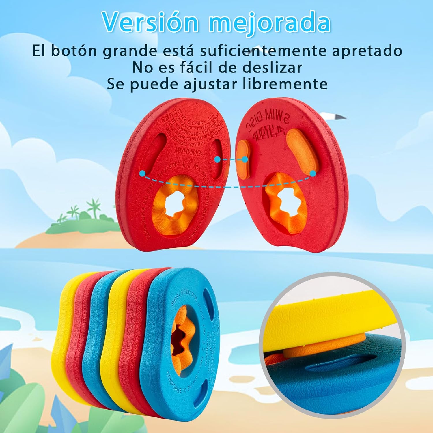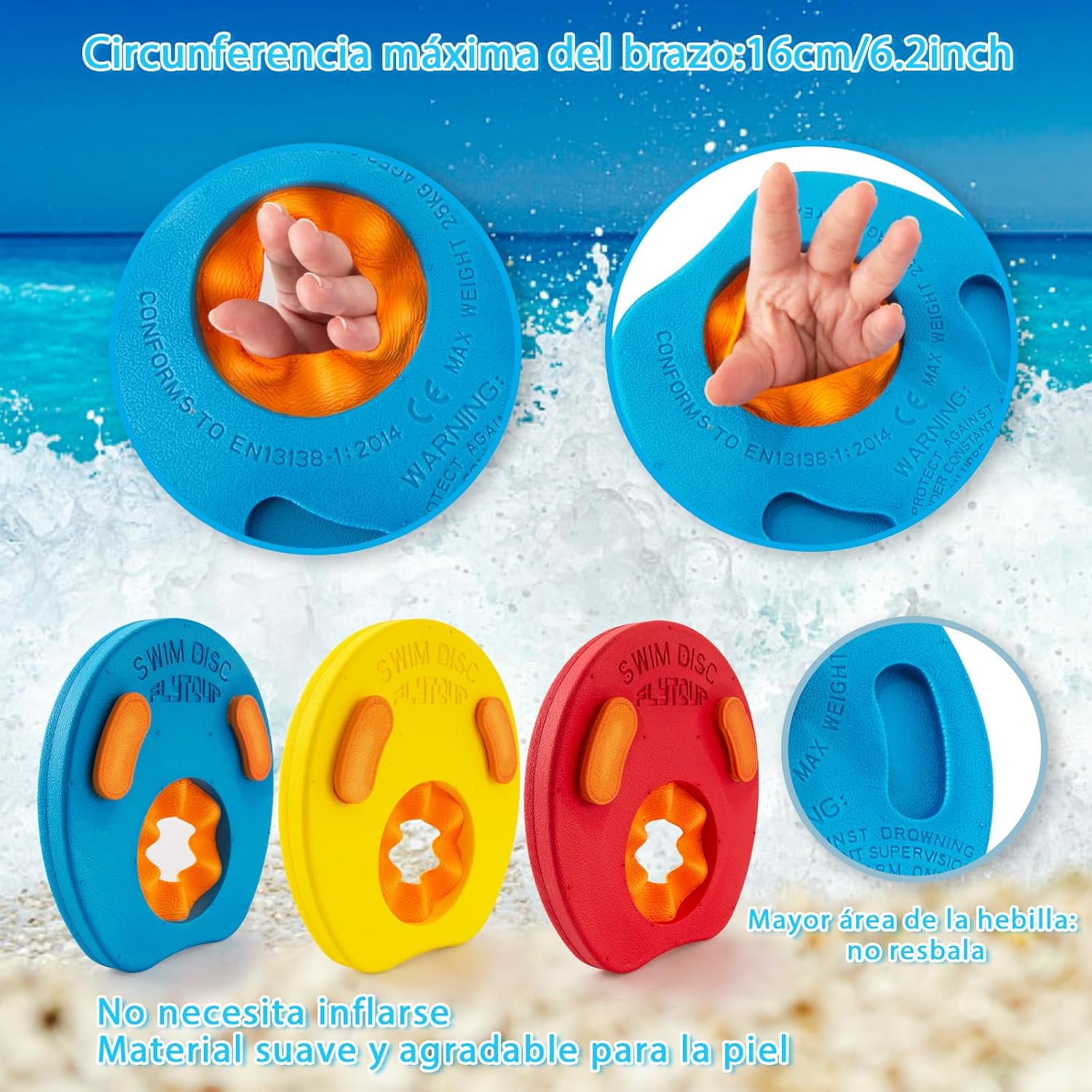Set da 6 pezzi con custodia: contiene 6 dischi galleggianti e una pratica custodia per bambini dai 18 mesi agli 8 anni con una capacità massima di 30 kg. Materiale EVA di alta qualità: i dischi da nuoto per bambini sono realizzati in schiuma EVA di alta qualità, che garantisce una durata e una sicurezza senza pari. Il materiale impermeabile e non adesivo è più sicuro e affidabile dei materiali gonfiabili. Visibilità confortevole: il comfort del vostro bambino è la nostra massima priorità. I materiali morbidi e ipoallergenici garantiscono il massimo comfort sulla pelle, mentre il design ultraleggero non limita la libertà di movimento. Inoltre, i colori vivaci rosso, giallo e blu assicurano che il bambino sia ben visibile in piscina, aumentando la sicurezza. Pannello in schiuma rimovibile: il nostro disco in schiuma rimovibile consente un utilizzo graduale. Quando le capacità di nuoto del tuo bambino migliorano, basta rimuovere un disco dopo l'altro per creare gradualmente fiducia. Questo design innovativo rende il nostro braccialetto da nuoto lo strumento perfetto per i principianti per imparare a nuotare. Prima di tutto: ricorda sempre che questo galleggiante è pensato solo per l'allenamento di nuoto dei bambini. Deve essere sempre utilizzato sotto la supervisione di un adulto. Non permettere mai a tuo figlio di usare questi braccioli incustoditi.