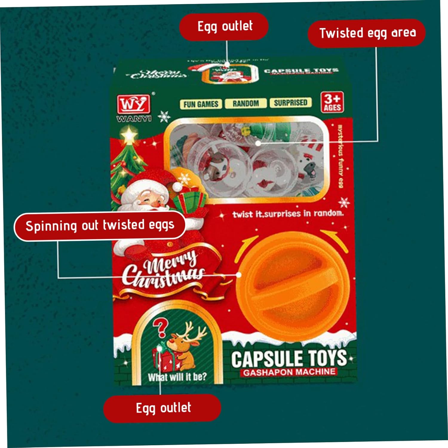 Portatile e pronto per la casa: compatto e leggero, questa macchina artiglio è ideale per l'uso domestico o le piccole feste, creando ore di divertimento senza occupare molto spazio Include uova a sorpresa: viene fornito con 6 uova a sorpresa piene di divertenti giocattoli a capsula, aggiungendo elementi di mistero e gioia che mantengono i bambini eccitati e intrattenuti Tema natalizio festivo: questa mini macchina da artigli presenta un vivace design natalizio perfetto per feste natalizie e celebrazioni dell'asilo, migliorando il divertimento e l'eccitazione festive Funzionamento per bambini: i controlli di artigli di facile utilizzo sono progettati specificamente per i bambini, garantendo un gioco pratico sicuro e pratico che sviluppa coordinamento occhio-mano e capacità motorie sottili Vendending per capsule giocattolo multifunzione: combina la gioia di un distributore automatico della capsula giocattolo con una macchina per artigli interattiva, rendendolo un giocattolo per bambini unico che promuove il coinvolgimento e la creatività del gioco