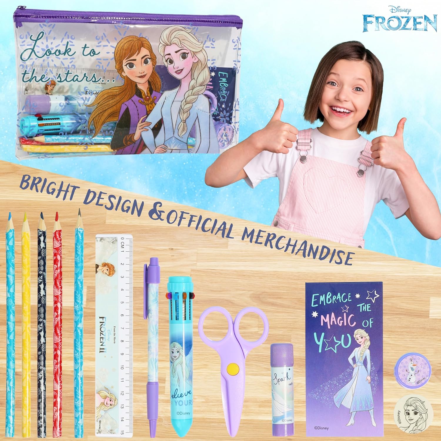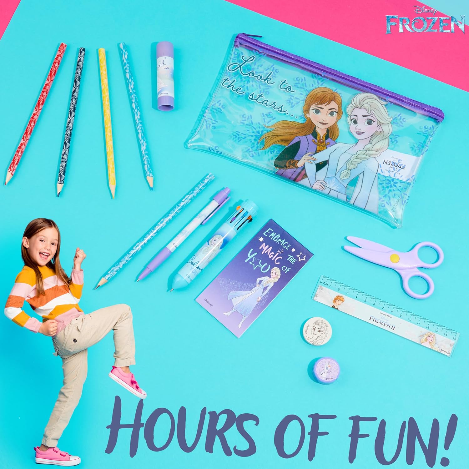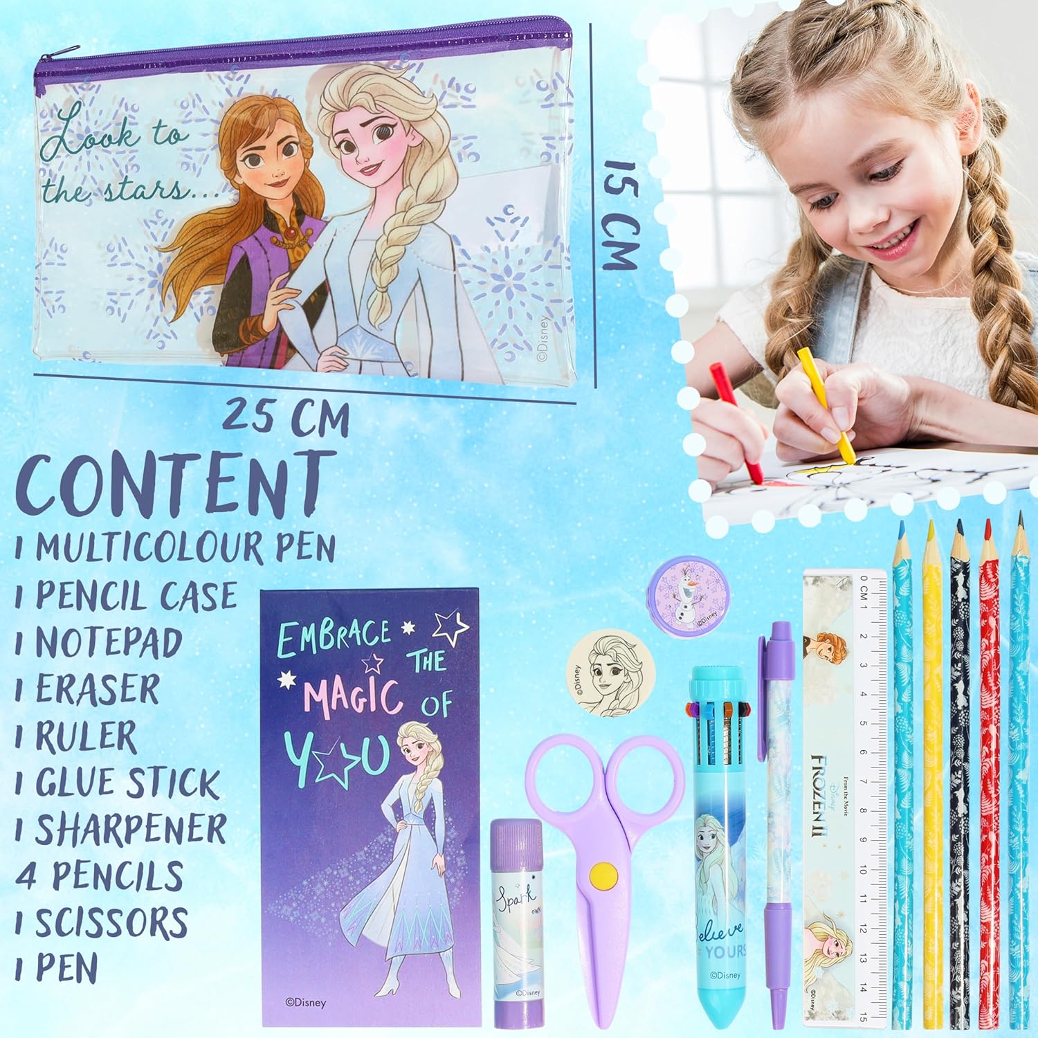 Incoraggia la Creatività con le Disney - Promuovi l'immaginazione di tua figlia con le sue amate Disney al suo fianco con questo affascinante set cancelleria scuola, ideale sia per l'uso a casa che a scuola. Kit Scuola Cancelleria Compete - All'interno del set scuola bambina troverai una varietà di elementi essenziali come matite colorate, pennarelli, forbici di sicurezza, un quaderno e oggetti aggiuntivi. Fai riferimento alle immagini per uno sguardo dettagliato su cosa è incluso in questo delizioso astuccio per bambini. Spaziosi e Versatili - Questi amati astuccio Disney, misurano 25 x 15 cm, offrono ampio spazio per salvaguardare la scuola cancelleria e le forniture artistiche di tuo figlio. La loro grande capacità garantisce una facile conservazione di una vasta gamma di articoli. Ideale Disney Regalo Bambina - Stai cercando un regalo adorabile per un'appassionata Disney o per una bambina che adora la cancelleria? Questo set di cancelleria completamente attrezzato è la scelta ideale per le ragazze che amano liberare la propria creatività. Che si tratti dell'inizio della scuola, dell'asilo, di un compleanno o di Natale, questo regalo piacerà sicuramente. Prodotto Ufficiale Disney - Questo adorabile accessori scuola, completo di articoli di cancelleria essenziali, è ufficialmente approvato da Disney. Caratterizzato da un design vivace che mette in mostra tutte le loro Principesse e Frozen preferite, è una deliziosa aggiunta alla collezione di ogni giovane fan Disney.