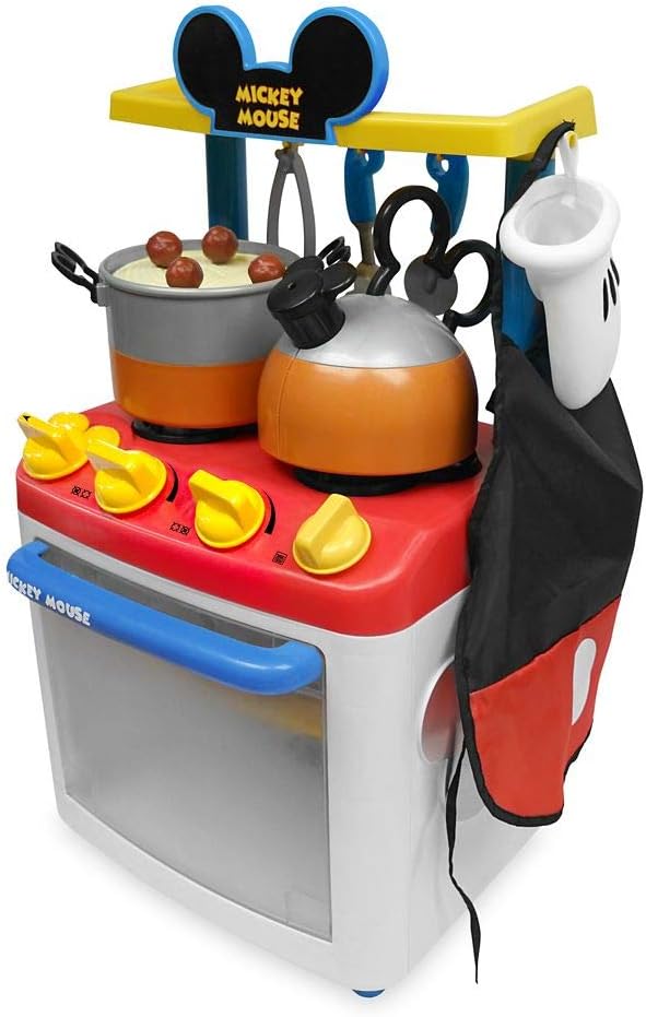 Autentico, Originale, Autentico Disney Store I pezzi da gioco includono fornello, pentola, teiera, spaghetti e polpette, pizza, piatto, tre utensili, guanto da forno e grembiule Include: timer di funzionamento, luci e suoni della stufa, forno si accende Fischietti per teiera; la pentola emette un suono bollente; la pizza si illumina sotto la luce del forno Richiede 3 batterie AAA incluse