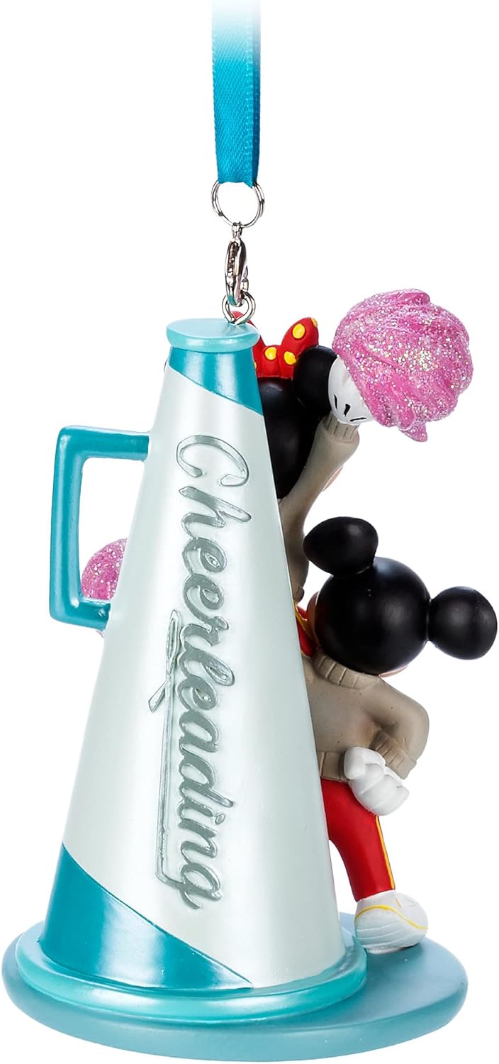 Genuino, originale, autentico negozio Disney Ornamento completamente scolpito con Topolino e Minnie con dettagliato megafono con "Cheerleading" in lettere rialzate su entrambi i lati Pompon di Minnie accentati con glitter autoportante per scrivania o esposizione di alberi e nastro staccabile per appendere Parte della collezione Celebration Ornament