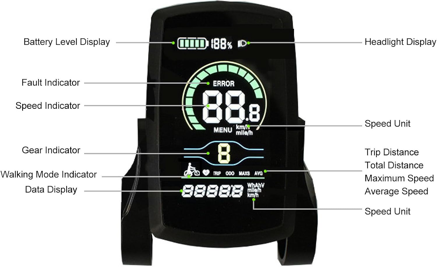 Compatibilità perfetta: progettato semplice installazione, questo pannello dello schermo è compatibile con una varietà di bici elettriche, garantendo una perfetta integrazione nella tua configurazione attuale. Caratteristiche di visualizzazione versatili: lo schermo LCD offre un design multifunzionale con display per il livello della batteria, la regolazione 'assistenza, la velocità e il chilometraggio, soddisfacendo tutte le tue esigenze di ciclismo. Squisita fattura: costruito per resistere a condizioni estreme, questo display mantiene prestazioni e affidabilità elevate, supportando un'esperienza di guida affidabile indipendentemente da fattori esterni. Materiale ABS: il nostro display LCD per bici elettrica è realizzato in materiale ABS di alta qualità, garantendo funzionalità complete, inclusi i messaggi di codice di errore. Impostazioni personalizzabili: personalizza la tua esperienza ciclistica con parametri completamente regolabili, che ti consentono di creare un viaggio personalizzato che si adatta alle tue preferenze individuali.