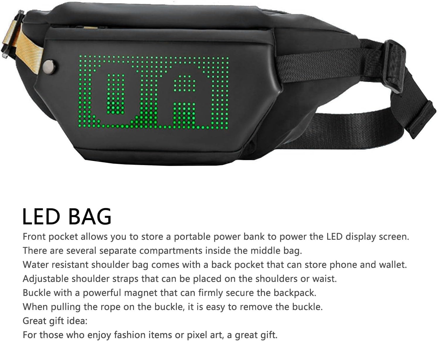 [Distinguere con stile] Lo schermo del display a LED 5,1x2,1 pollici garantisce una delizia visiva, attirando l'attenzione di tutti. [Organized Storage] Dispone di una tasca anteriore per Power Bank, più scomparti per l'organizzazione e una tasca posteriore per telefono e portafoglio. [Facile indossare] spallacci regolabili consentono l'usura versatile, con una fibbia magnetica per una chiusura . [Divertimento infinito] Personalizzabile con opere d'arte pixel usando Spotled App, offrendo una vasta gamma di raccolte di immagini o design unici. [Ottima idea ] Un fantastico per le spalle per individui alla mo o appassionati di arte dei pixel, per design animati.