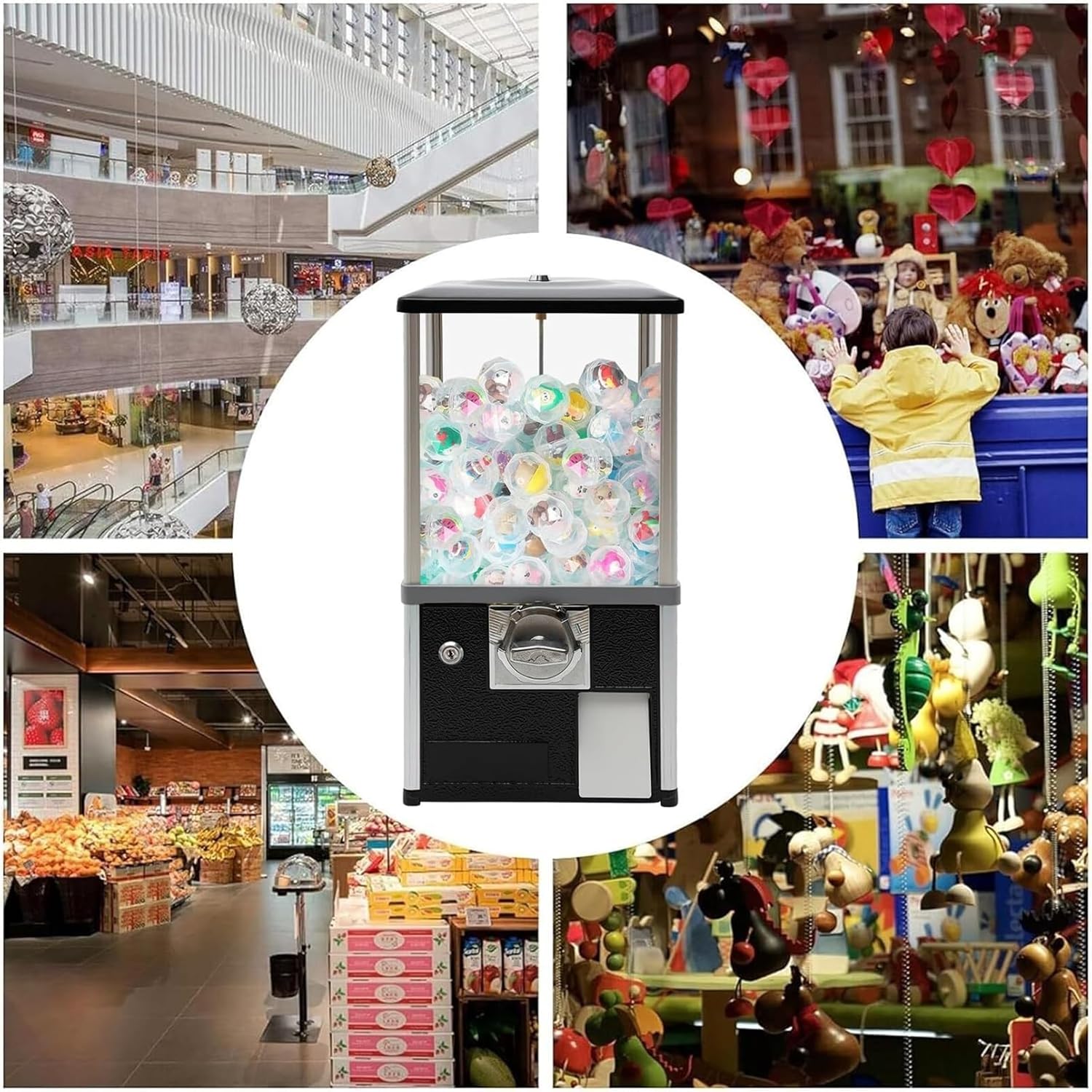 [Grande capacità] Grandi dimensioni 26 x 29 x 53 cm, può contenere circa 800-1000 pezzi, 200 Gashapon (4,3 cm) o 150 Gashapon (4,8 cm). Evitare di aggiungere gashapon o rimuovere parti frequentemente. Soddisfa le esigenze di intrattenimento della maggior parte dei visitatori di centri commerciali e parchi di divertimento. [Materiale] La nostra macchina per caramelle è realizzata in lega di alluminio e lega di zinco di alta qualità. Inoltre, ABS e PS sono resistenti agli urti, alla rottura e alla deformazione, garantendo una buona durata. La struttura rettangolare garantisce una buona stabilità e una forte capacità di carico, così puoi usarlo senza preoccuparti che traballi o si ribalti, anche quando è pieno di giocattoli e ci sono molti bambini nelle vicinanze. [Alta sicurezza] Il distributore automatico è dotato di serratura sulla parte superiore ed esterna del salvadanaio. Solo la nostra chiave corrispondente può aprirlo, il che può impedire il furto di giocattoli e parti. L'alloggiamento è girevole, consentendo ai clienti di vedere facilmente la posizione degli oggetti all'interno della macchina [Bellissimo aspetto] Il prodotto utilizza giallo/verde/rosso/nero/bianco/blu brillante come colore di base del prodotto, che può creare un'atmosfera da sogno e da favola con capsule di giocattoli colorati e caramelle. [Macchina multifunzionale] Con questo prodotto non è necessario rimanere accanto alla macchina tutto il giorno. Tutto quello che devi fare è aggiungere elementi e rimuovere parti regolarmente, il che può farti risparmiare molto tempo ed energia. Il design divertente gli conferisce un aspetto unico ed elegante ed è un ottimo pezzo decorativo che si fonde con diversi stili di interni e aggiunge colore alla stanza.