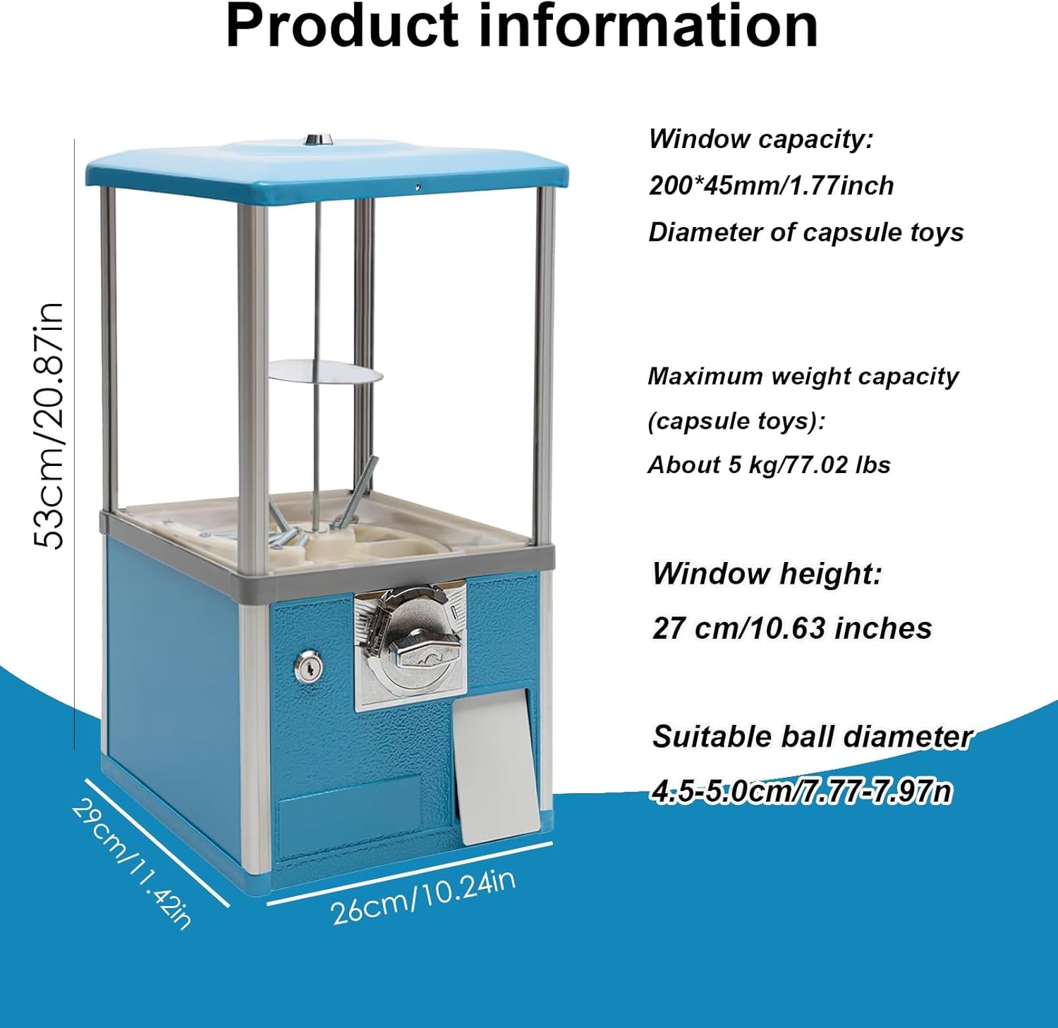 [Grande capacità] Grandi dimensioni 26 x 29 x 53 cm, può contenere circa 800-1000 pezzi, 200 Gashapon (4,3 cm) o 150 Gashapon (4,8 cm). Evitare di aggiungere gashapon o rimuovere parti frequentemente. Soddisfa le esigenze di intrattenimento della maggior parte dei visitatori di centri commerciali e parchi di divertimento. [Materiale] La nostra macchina per caramelle è realizzata in lega di alluminio e lega di zinco di alta qualità. Inoltre, ABS e PS sono resistenti agli urti, alla rottura e alla deformazione, garantendo una buona durata. La struttura rettangolare garantisce una buona stabilità e una forte capacità di carico, così puoi usarlo senza preoccuparti che traballi o si ribalti, anche quando è pieno di giocattoli e ci sono molti bambini nelle vicinanze. [Alta sicurezza] Il distributore automatico è dotato di serratura sulla parte superiore ed esterna del salvadanaio. Solo la nostra chiave corrispondente può aprirlo, il che può impedire il furto di giocattoli e parti. L'alloggiamento è girevole, consentendo ai clienti di vedere facilmente la posizione degli oggetti all'interno della macchina [Bellissimo aspetto] Il prodotto utilizza giallo/verde/rosso/nero/bianco/blu brillante come colore di base del prodotto, che può creare un'atmosfera da sogno e da favola con capsule di giocattoli colorati e caramelle. [Macchina multifunzionale] Con questo prodotto non è necessario rimanere accanto alla macchina tutto il giorno. Tutto quello che devi fare è aggiungere elementi e rimuovere parti regolarmente, il che può farti risparmiare molto tempo ed energia. Il design divertente gli conferisce un aspetto unico ed elegante ed è un ottimo pezzo decorativo che si fonde con diversi stili di interni e aggiunge colore alla stanza.