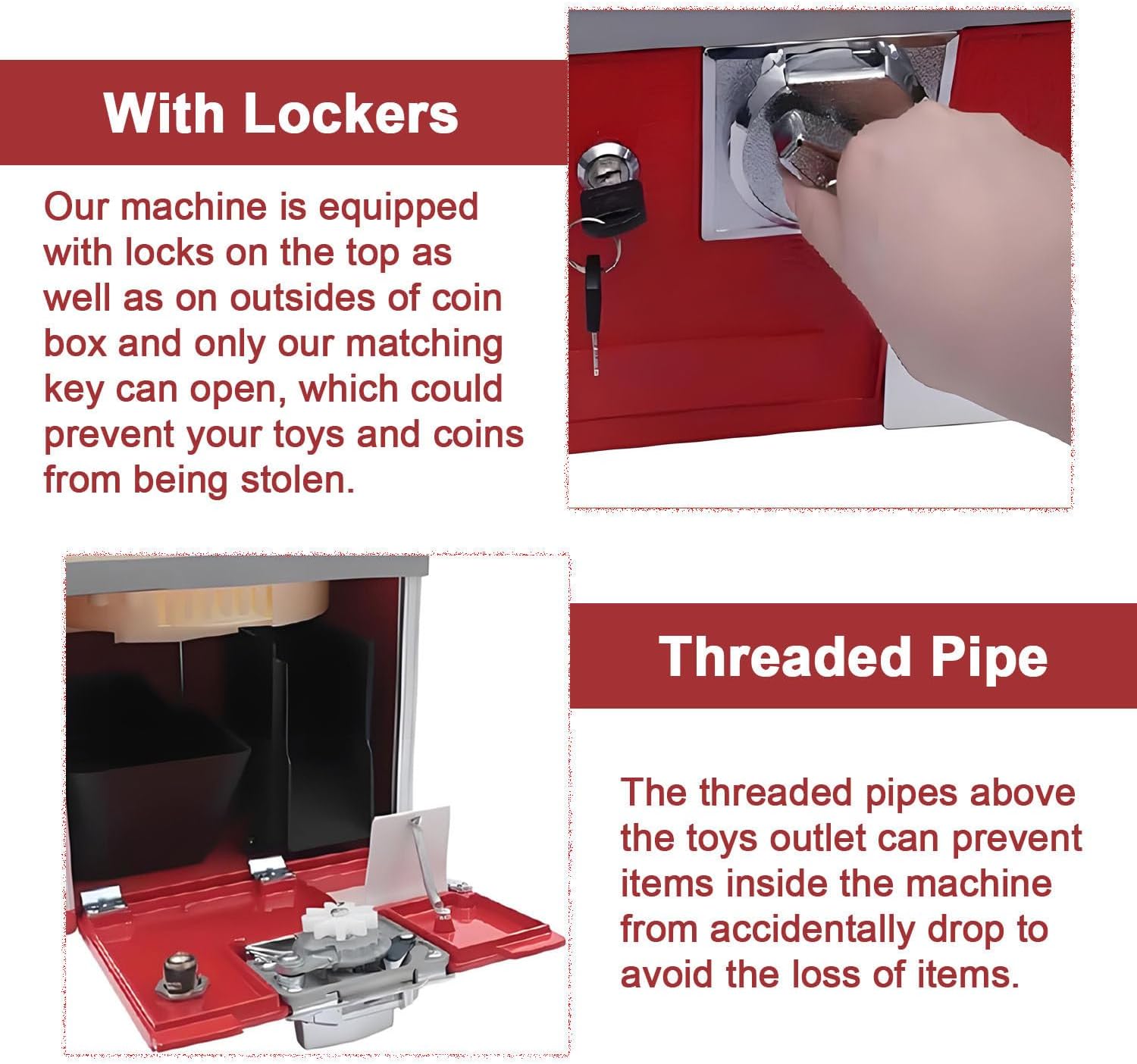 【FACILE DA USARE】 Basta inserire due monete in ciascun lato della fessura per le monete del distributore automatico di capsule (ovvero 2 monete a sinistra e 2 monete a destra, per un totale di 4 fessure per monete) e ruotare la manopola di 360° in senso orario per far cadere gli oggetti. Questo processo è facile da imparare e richiede solo pochi minuti. 【AMPIA CAPACITÀ】Il grande distributore automatico di capsule con dimensioni di 26*29*53 cm, 200 uova intrecciate (4,3 cm) o 150 uova intrecciate (4,8 cm), può evitare di aggiungere frequentemente uova intrecciate o rimuovere monete, soddisfacendo al contempo le esigenze di intrattenimento dei visitatori nella maggior parte dei centri commerciali e parchi di divertimento. 【ELEVATA SICUREZZA】 Il distributore automatico è dotato di un lucchetto sulla parte superiore e esterna del salvadanaio. Solo la nostra chiave abbinata può aprirlo, impedendo il furto di giocattoli e monete. Il telaio è girevole, facilitando la visualizzazione degli oggetti all'interno del distributore. 【COSTRUITO PER DURARE】 Il distributore automatico di gomme da masticare commerciale è realizzato in ABS di alta qualità e lega di alluminio, lega di zinco e acciaio con processi di pressofusione e stampaggio, che lo rendono resistente all'usura, alla corrosione e indeformabile, consentendone l'utilizzo a lungo. La struttura rettangolare lo rende molto stabile e gli consente di sostenere carichi di 6-7 kg. 【ASPETTO INCANTEVOLE】 Questo distributore di capsule giocattolo attirerà l'attenzione di molti bambini e adolescenti grazie al suo aspetto accattivante. È un fantastico regalo per bambini grazie alla sua facile manipolazione e al fatto che non sia un regalo sconosciuto. Inoltre, il prodotto è già parzialmente preinstallato, quindi è sufficiente assemblarlo e metterlo in funzione dopo averlo ricevuto.