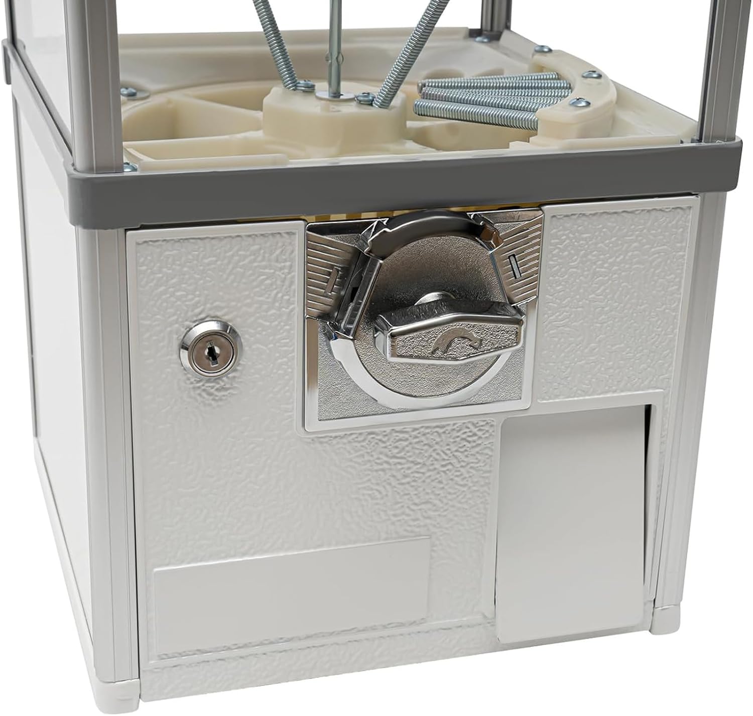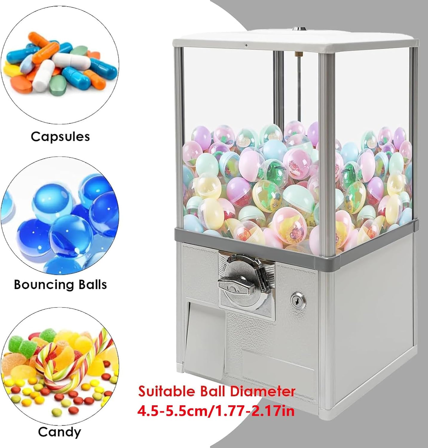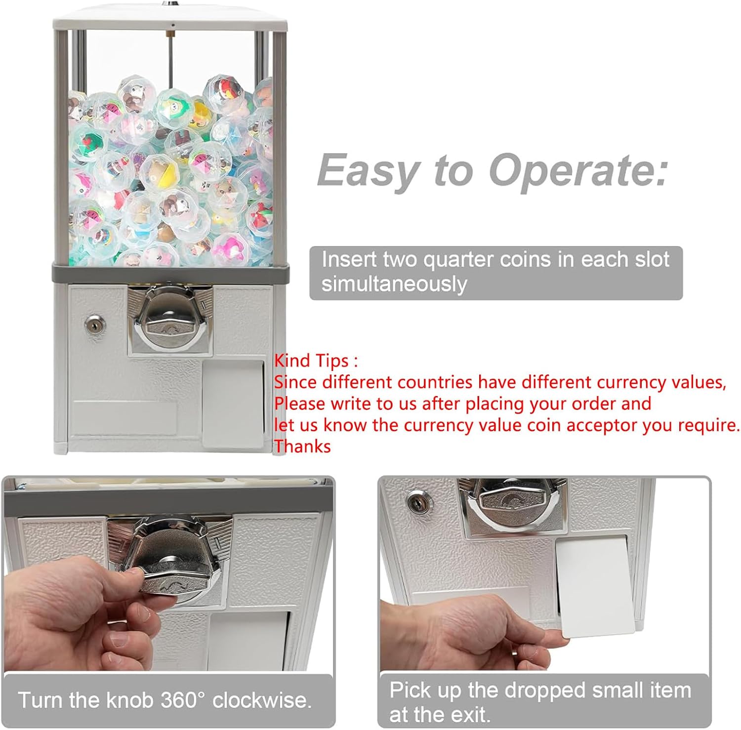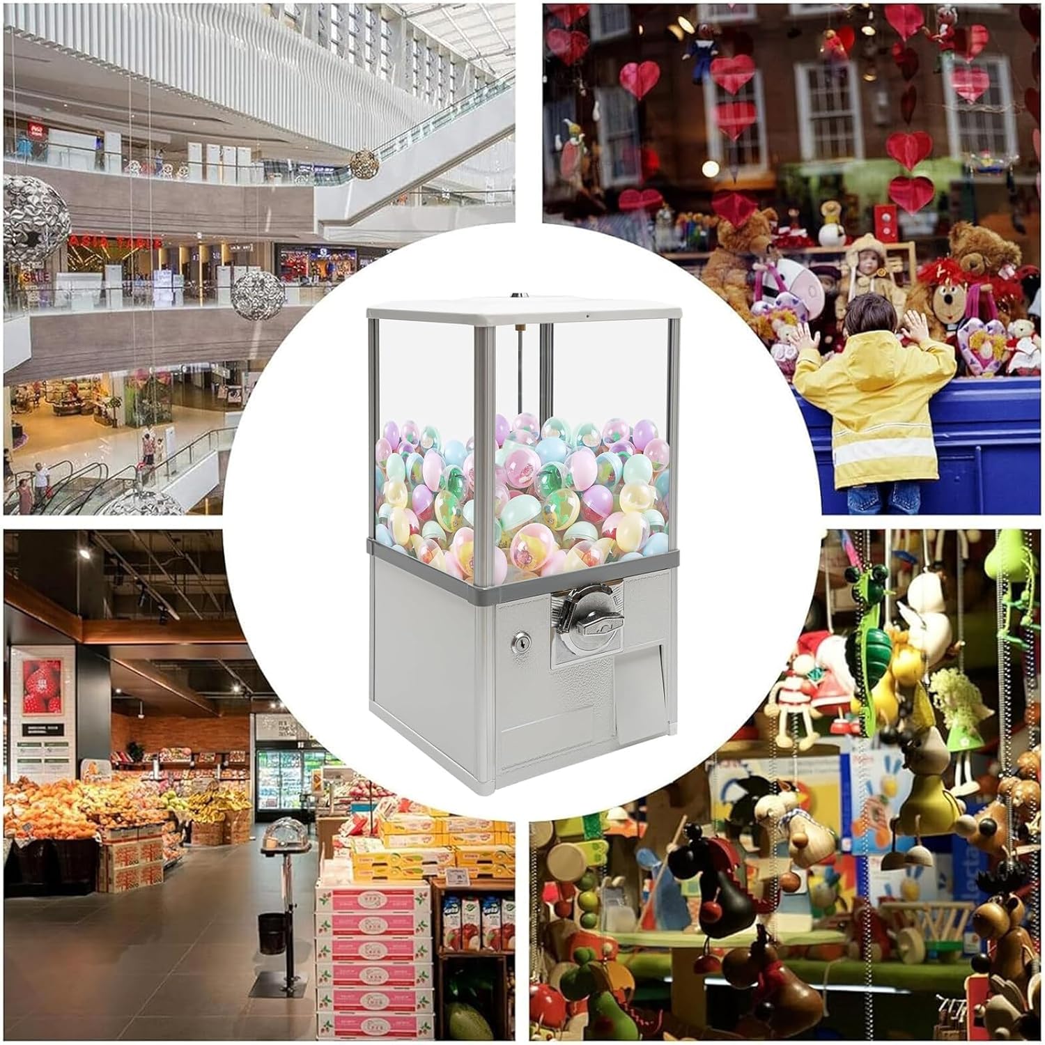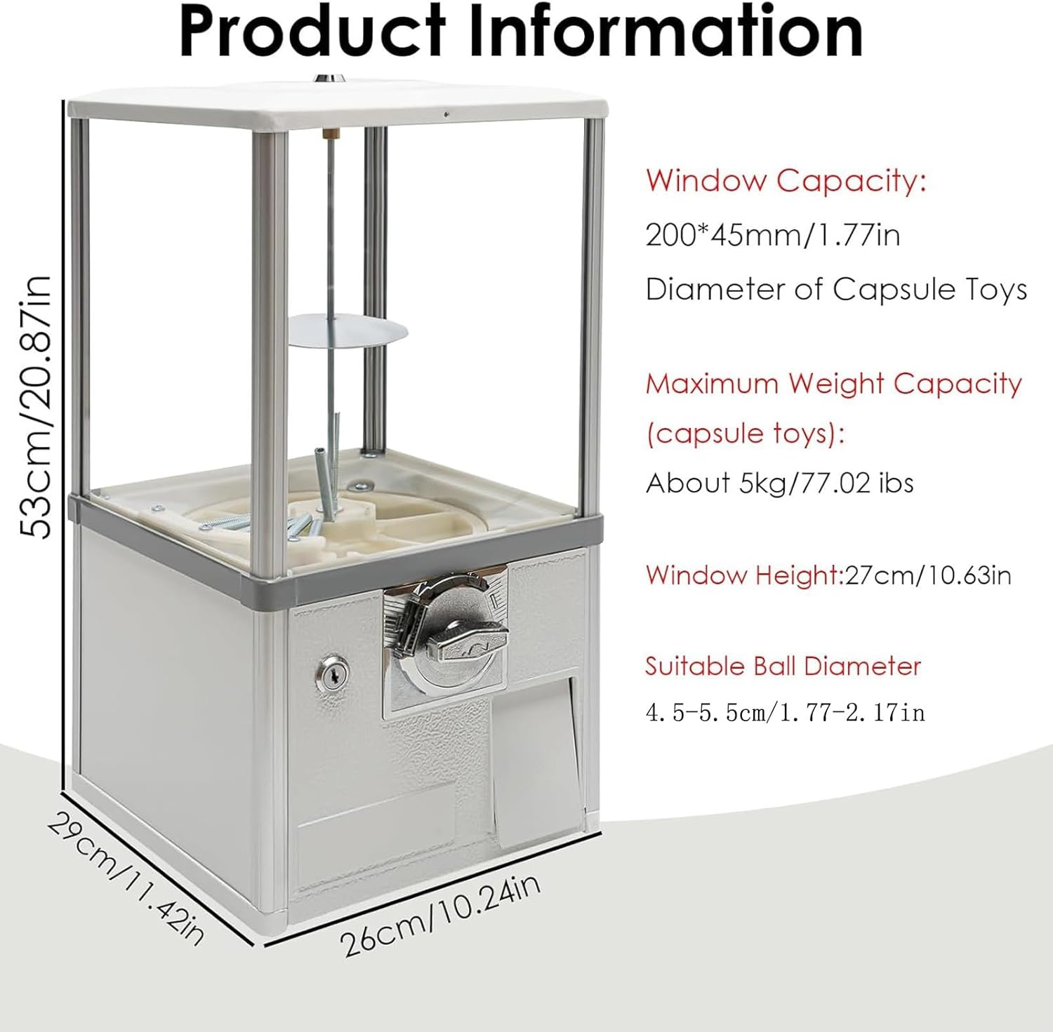 Grande capacità: con una grande dimensione di 26 x 29 x 53 cm, può ospitare circa 800-1000 monete, 200 uova attorcigliate (4,3 cm) o 150 (4,8 cm), che evitano di aggiungere frequentemente monete rimuovendo al contempo le esigenze di intrattenimento dei visitatori nella maggior parte dei centri commerciali e dei parchi di divertimento. Questo dispenser di caramelle è perfetto per l'utilizzo di giocattoli a capsule, caramelle, flipper, ecc. [ALTA SICUREZZA] Il distributore automatico dotato