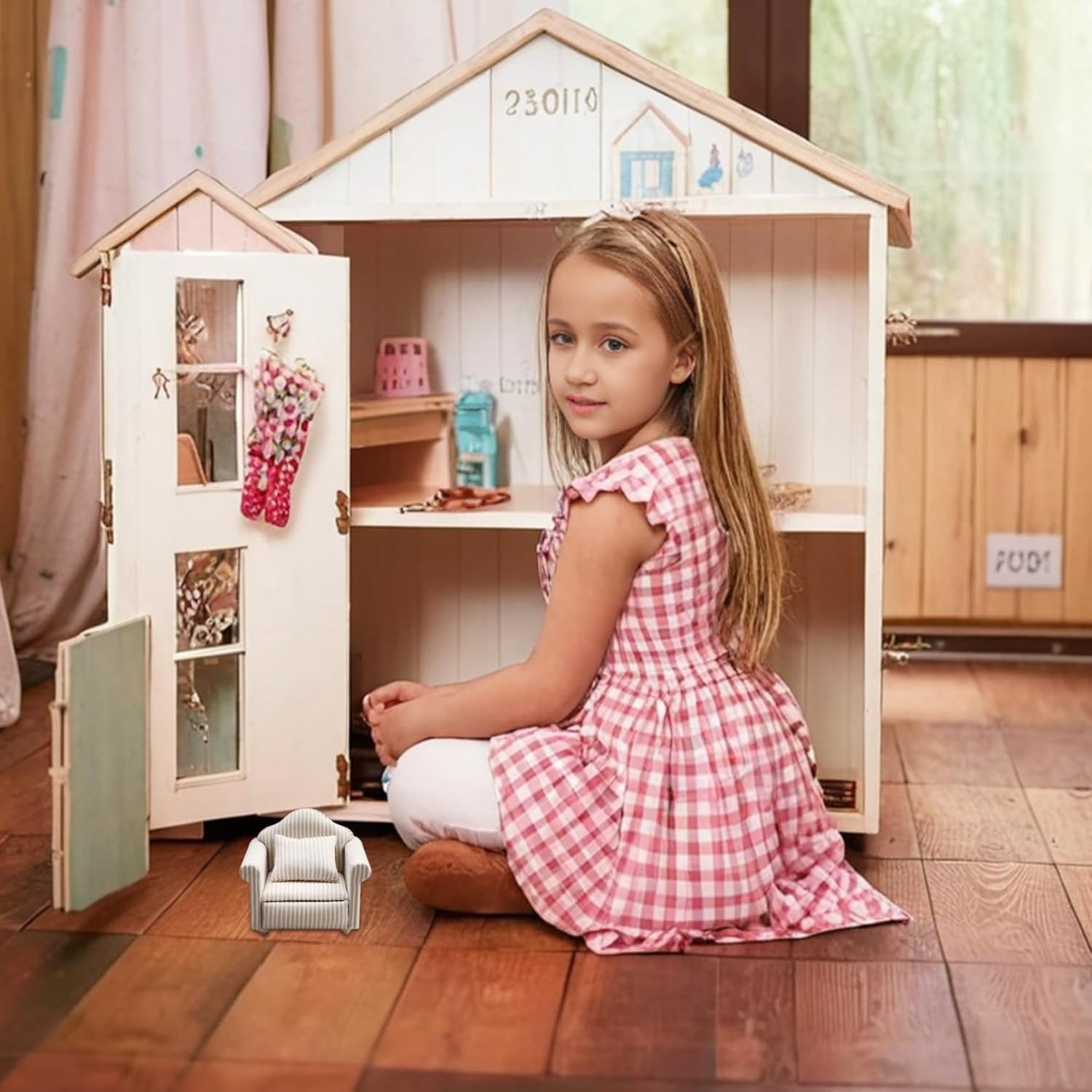 Elegante tessuto a strisce beige: il divano presenta un elegante tessuto a strisce beige che aggiungerà un tocco sofisticato a qualsiasi ambiente della casa delle bambole. I suoi toni neutri lo rendono facile da coordinare con altri mobili e accessori della tua collezione. Affascinante design in scala 1/12: realizzato in una perfetta scala 1/12, il nostro divano per casa delle bambole è un'aggiunta squisita al tuo soggiorno o camera da letto in miniatura, fornendo un tocco realistico che migliora l'arredamento della tua casa delle bambole. Uso multifunzionale: questo versatile divano per casa delle bambole può essere utilizzato perfettamente sia in soggiorno che in camera da letto in una varietà di ambienti per consentire arrangiamenti creativi e narrazioni uniche nelle scene della tua casa delle bambole. Robusto e ben costruito: realizzato con materiali in legno, il nostro divano in miniatura è progettato per durare e stabilità. Resisterà alla prova del tempo, assicurando che la tua casa delle bambole rimanga bella attraverso innumerevoli sessioni di gioco. Cuscini decorativi inclusi: ogni divano della casa delle bambole viene fornito con un cuscino decorativo, che aggiunge un ulteriore livello di fascino e comfort. Questo dettaglio accurato migliorerà l'atmosfera accogliente della tua stanza in miniatura.