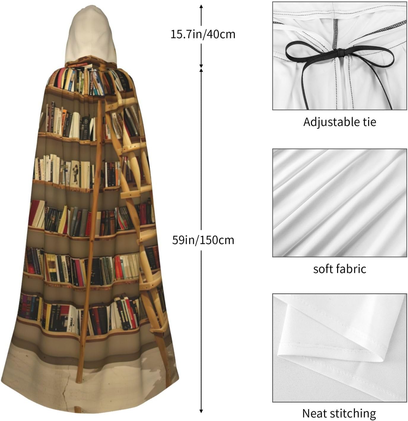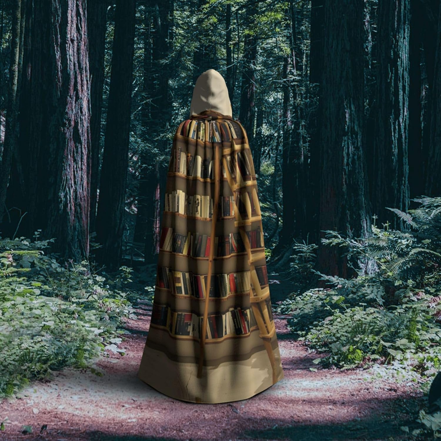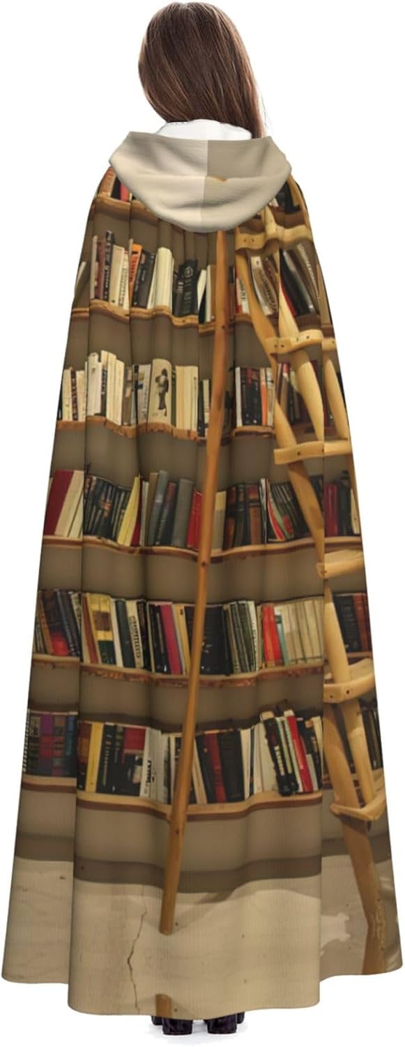 Divertente libro scaffali collezione e scala stampa mantello con cappuccio unisex per adulti Halloween lunghezza intera mantello da uomo con cappuccio costume