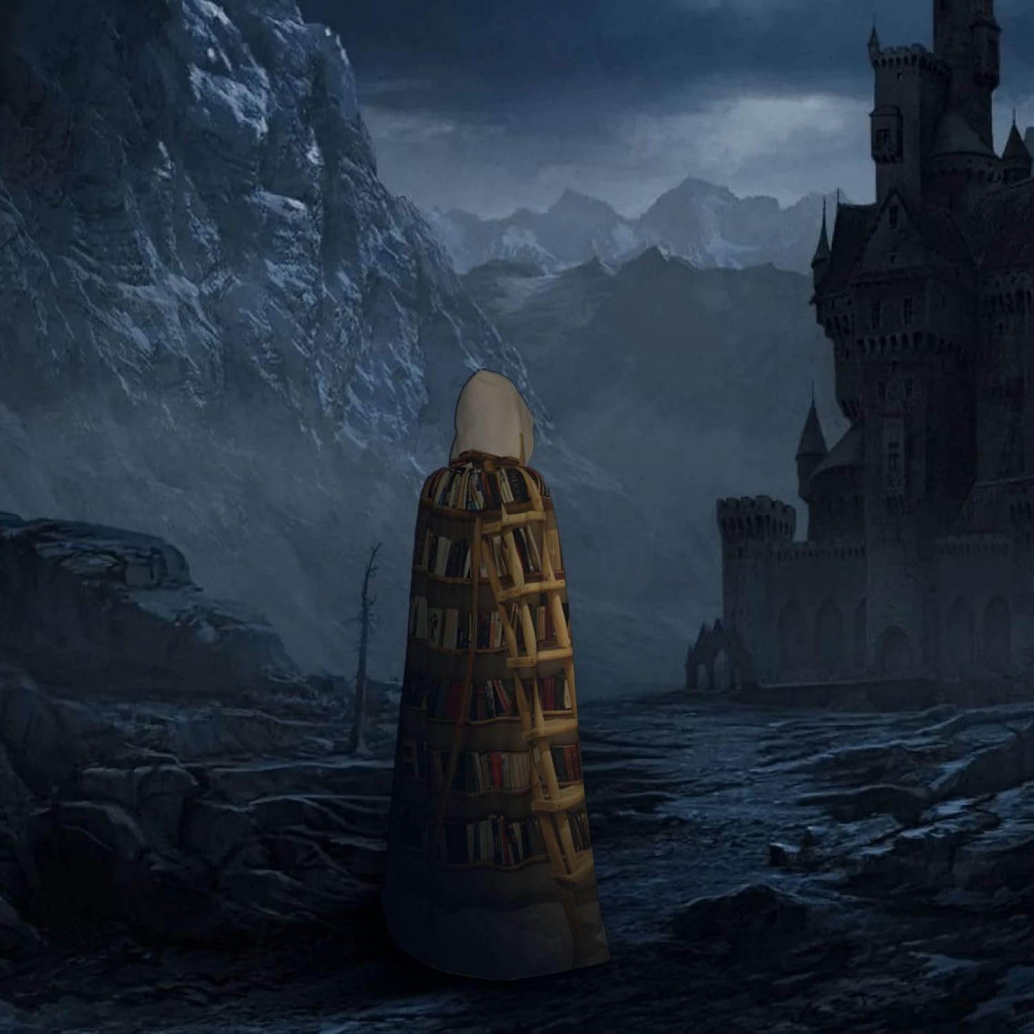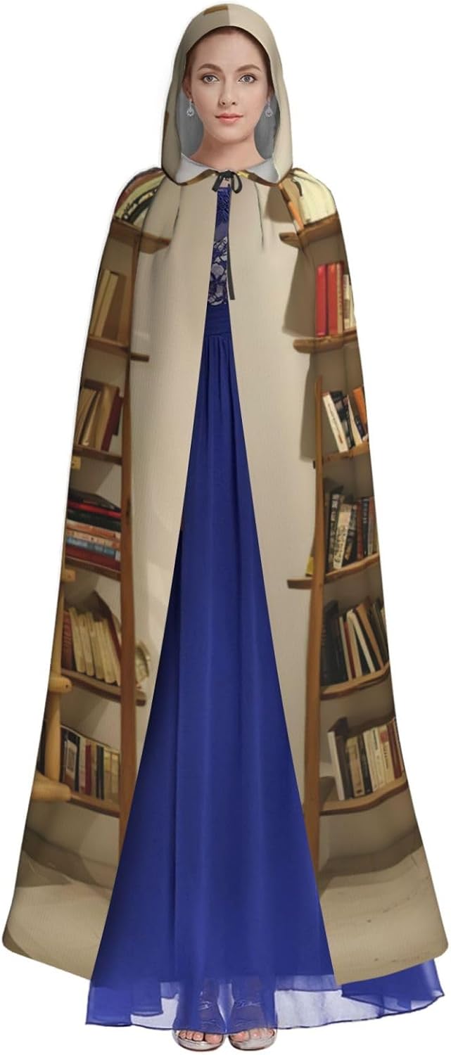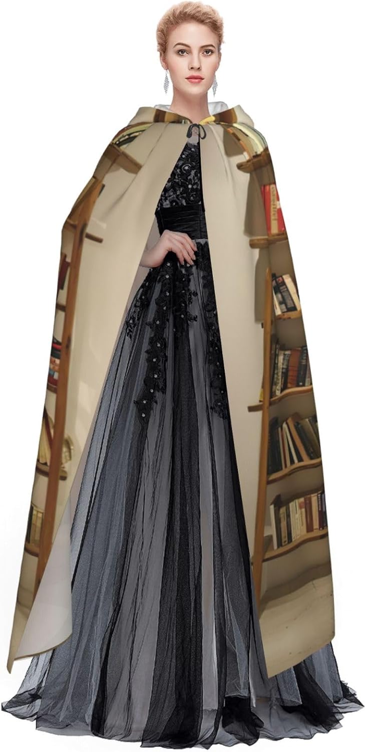 Divertente libro scaffali collezione e scala stampa mantello con cappuccio unisex per adulti Halloween lunghezza intera mantello da uomo con cappuccio costume