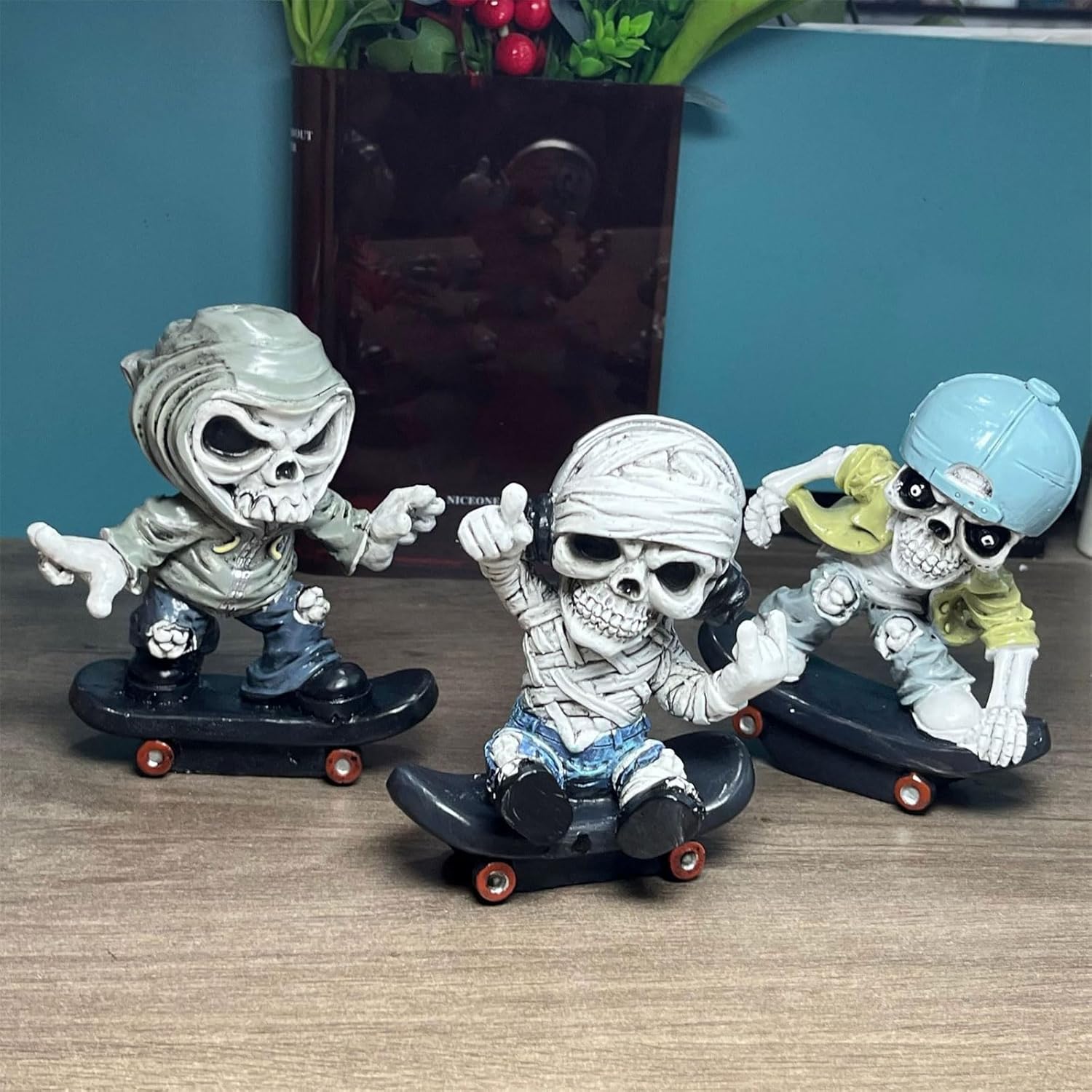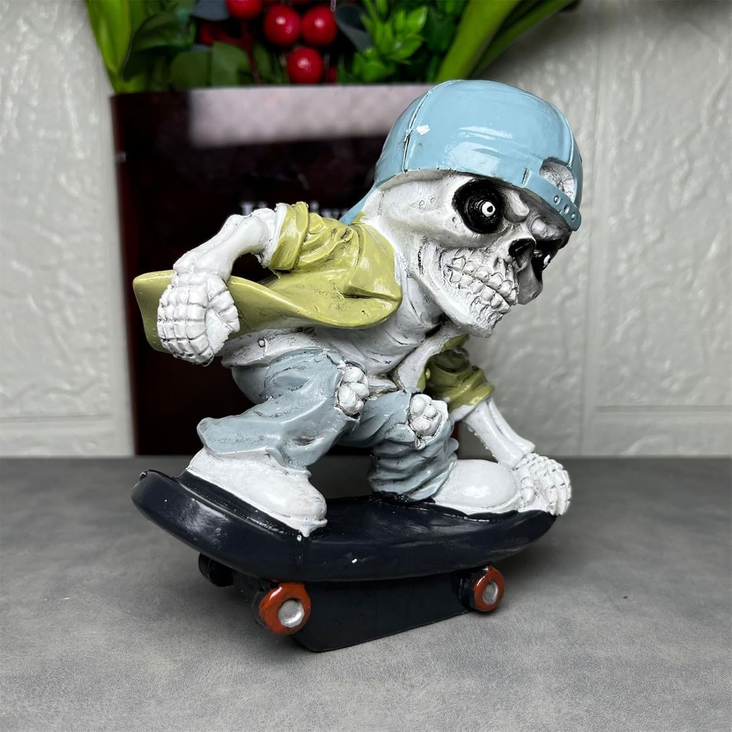 Divertente skateboarder scheletro statua Halloween resine a tema cranio figurina decorazioni vacanza libro ornamento da collezione personaggi