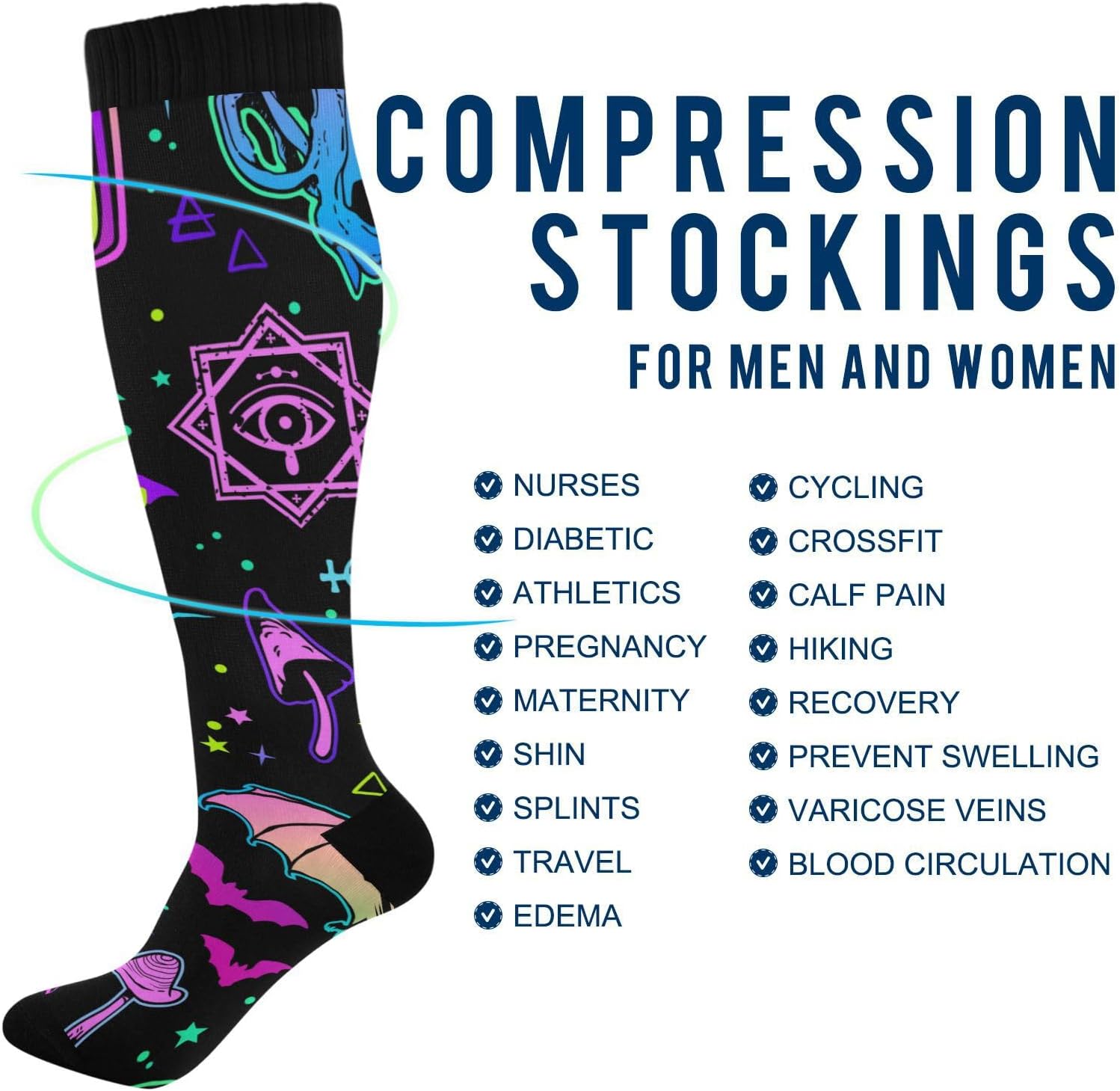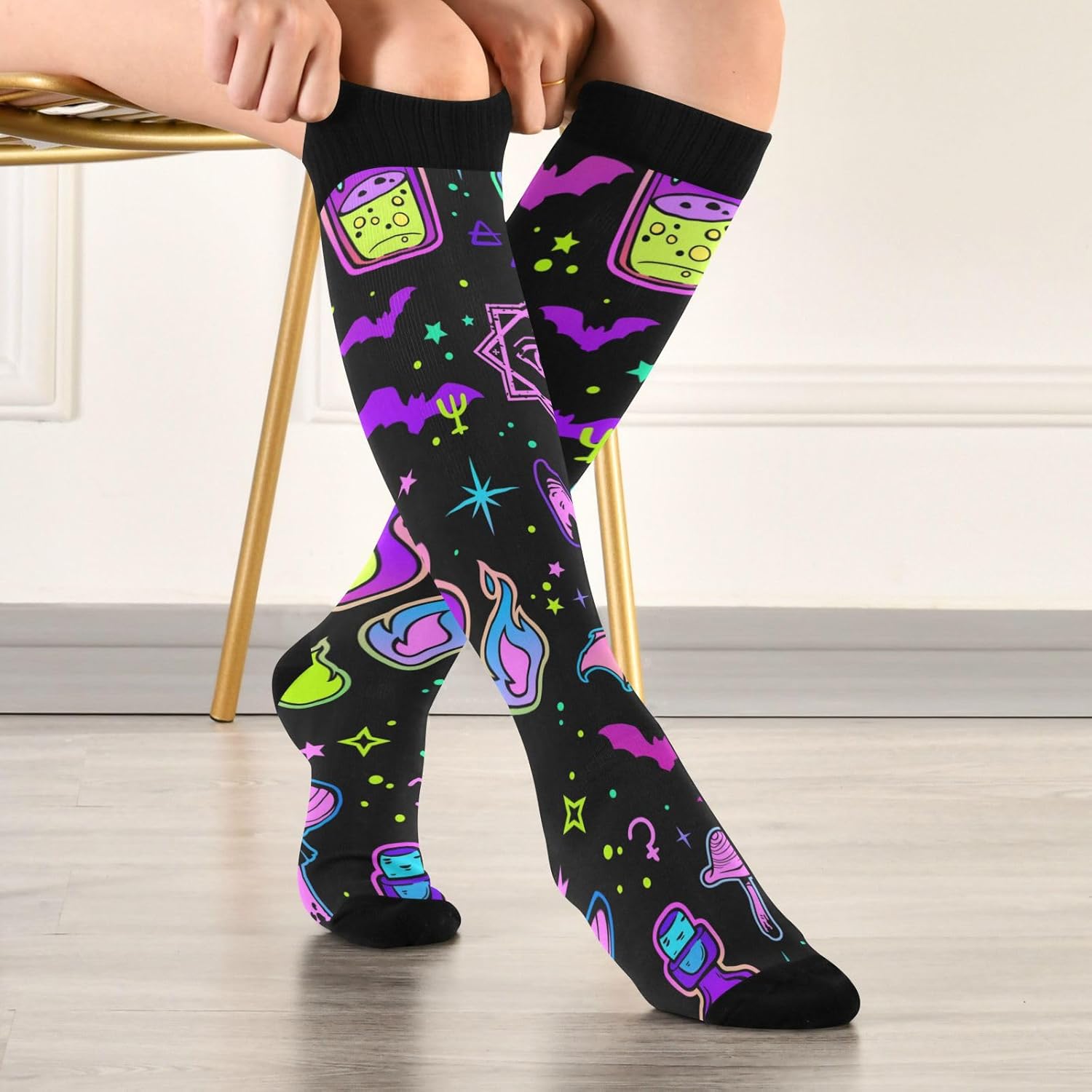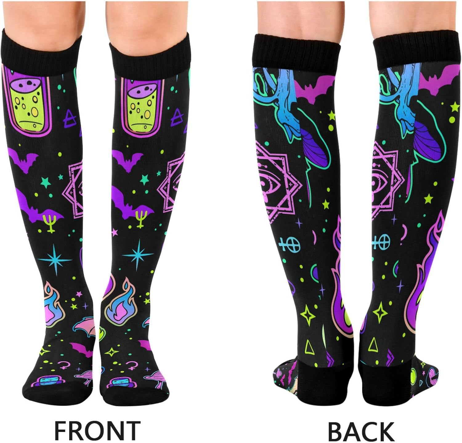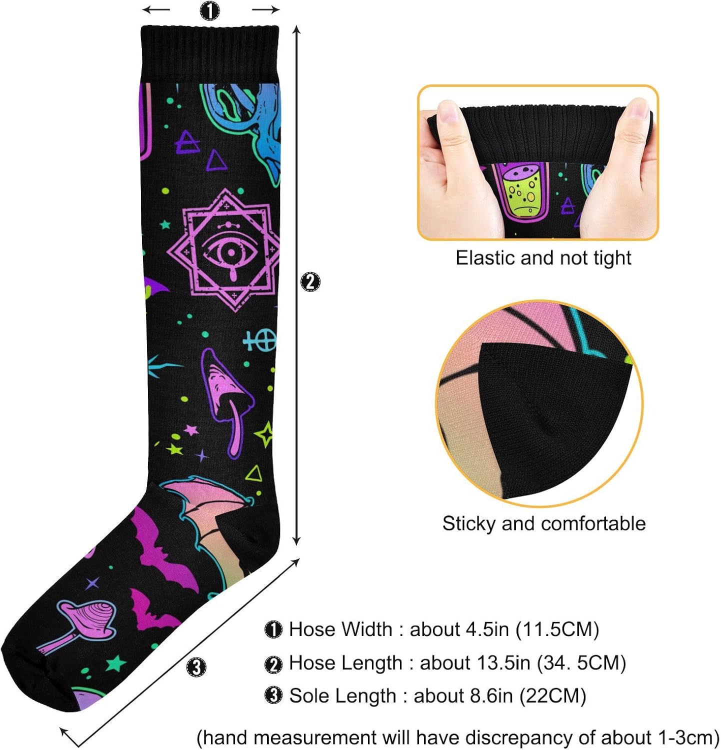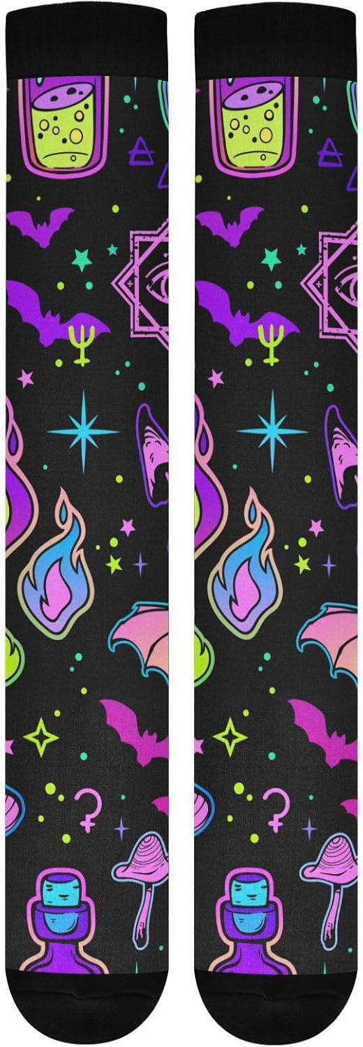 Dimensioni della calza: larghezza del tubo: 11,5 cm. Lunghezza del tubo: 34,5 cm. Lunghezza suola: 22 cm. Si prega di considerare un margine di errore di 1-3 cm dovuto alla misurazione manuale. (Nota: il colore della punta del piede, del tallone, della bocca del piede è nero). Calze alte al ginocchio: questo calzino ha uno stile di taglia uniforme, ad alta elasticità e la maggior parte delle persone può indossarlo alla posizione del ginocchio. Materiale morbido: poliestere. Le calze sono realizzate in tessuto di poliestere, spesso e morbido, con elevata resistenza all'usura. Le calze sono adatte per corsa, ciclismo, fitness o abbinamento quotidiano. Nota: le calze devono essere lavate in acqua convenzionale o in lavatrice. Mantiene il calore e allevia la fatica: i vantaggi del tessuto e della lunghezza rendono questa calza estremamente calda. Promuovendo la circolazione sanguigna, allevia anche la sensazione di affaticamento dei piedi quando si è in piedi. Ottima scelta di regali: la calza ha una varietà di motivi e può essere regalata a te stesso, alla tua famiglia, agli amici e ai colleghi per compleanno, Natale, Halloween, Ringraziamento, ecc.