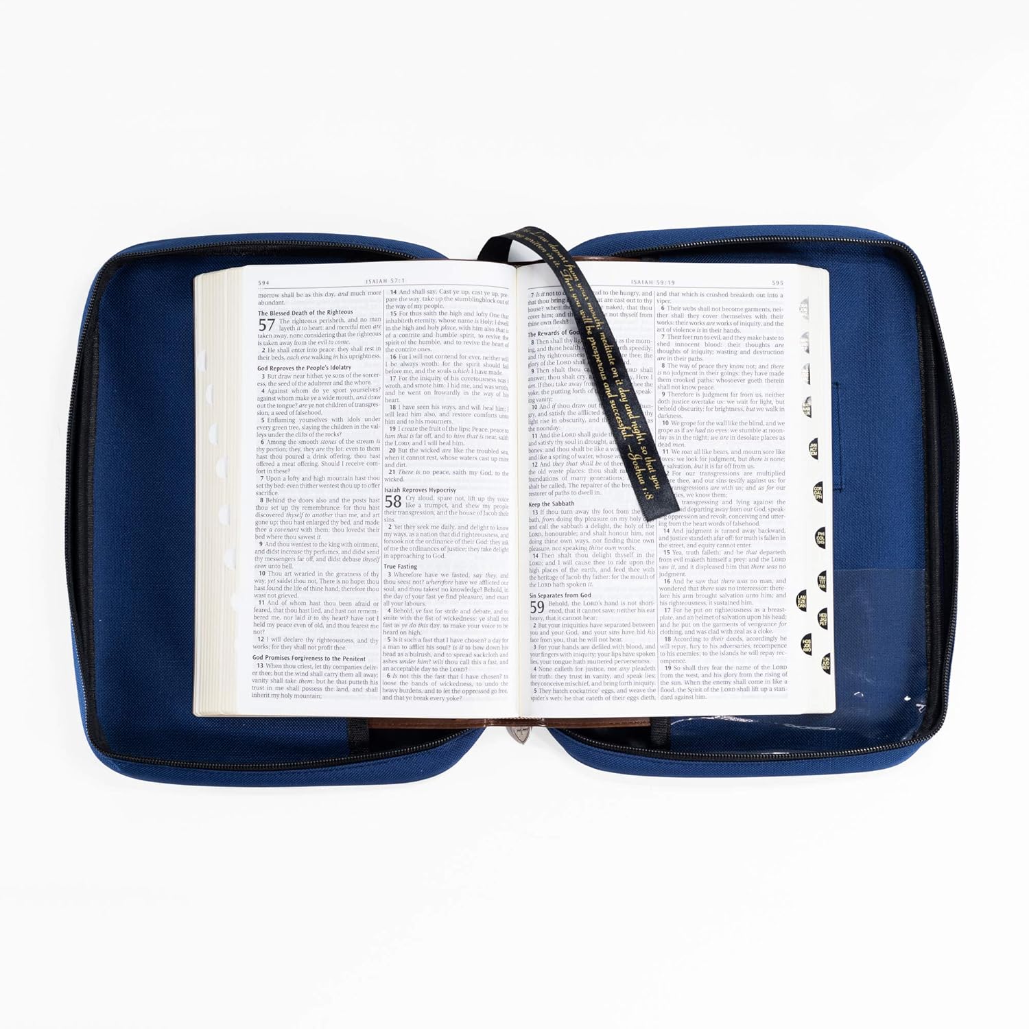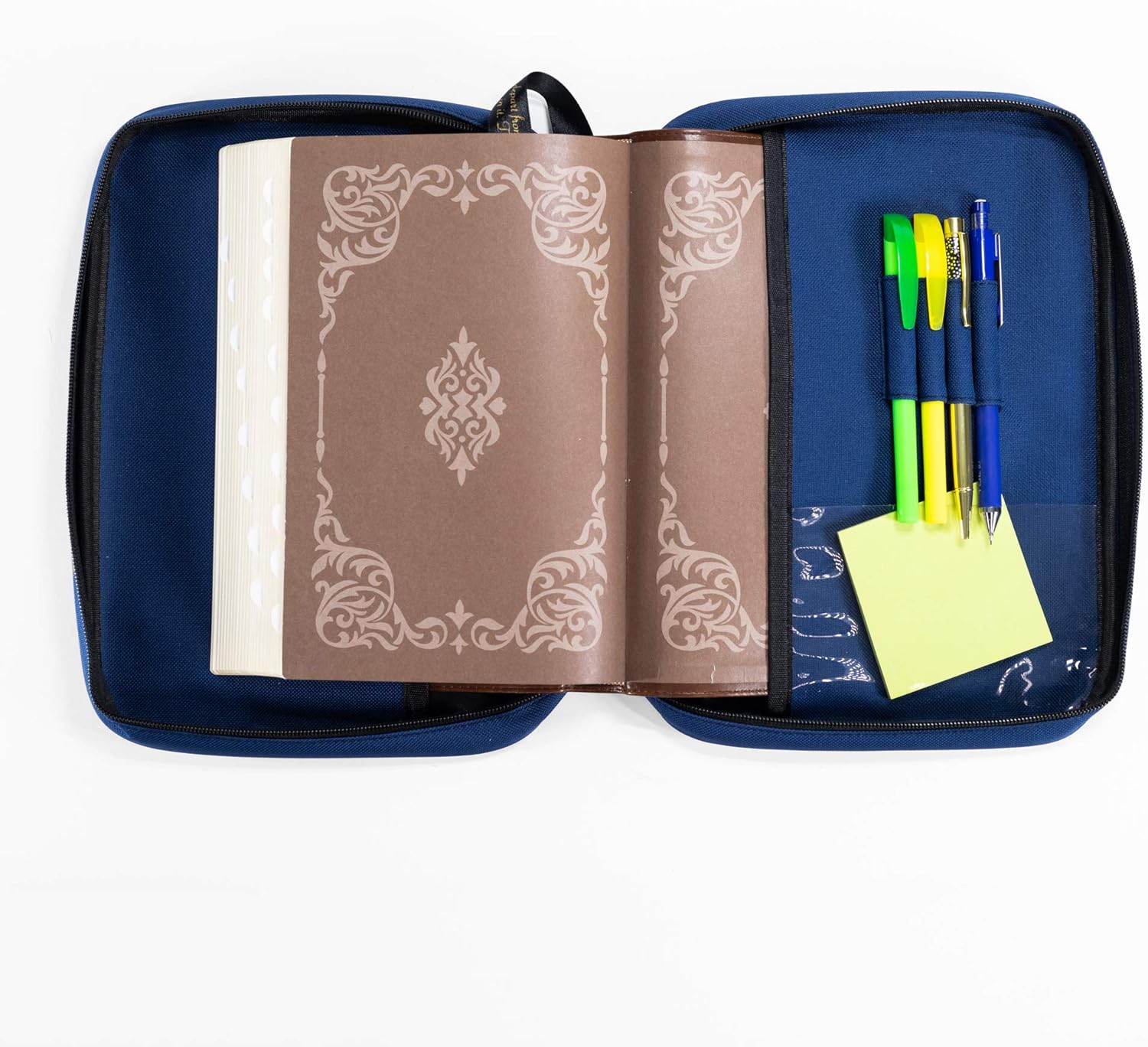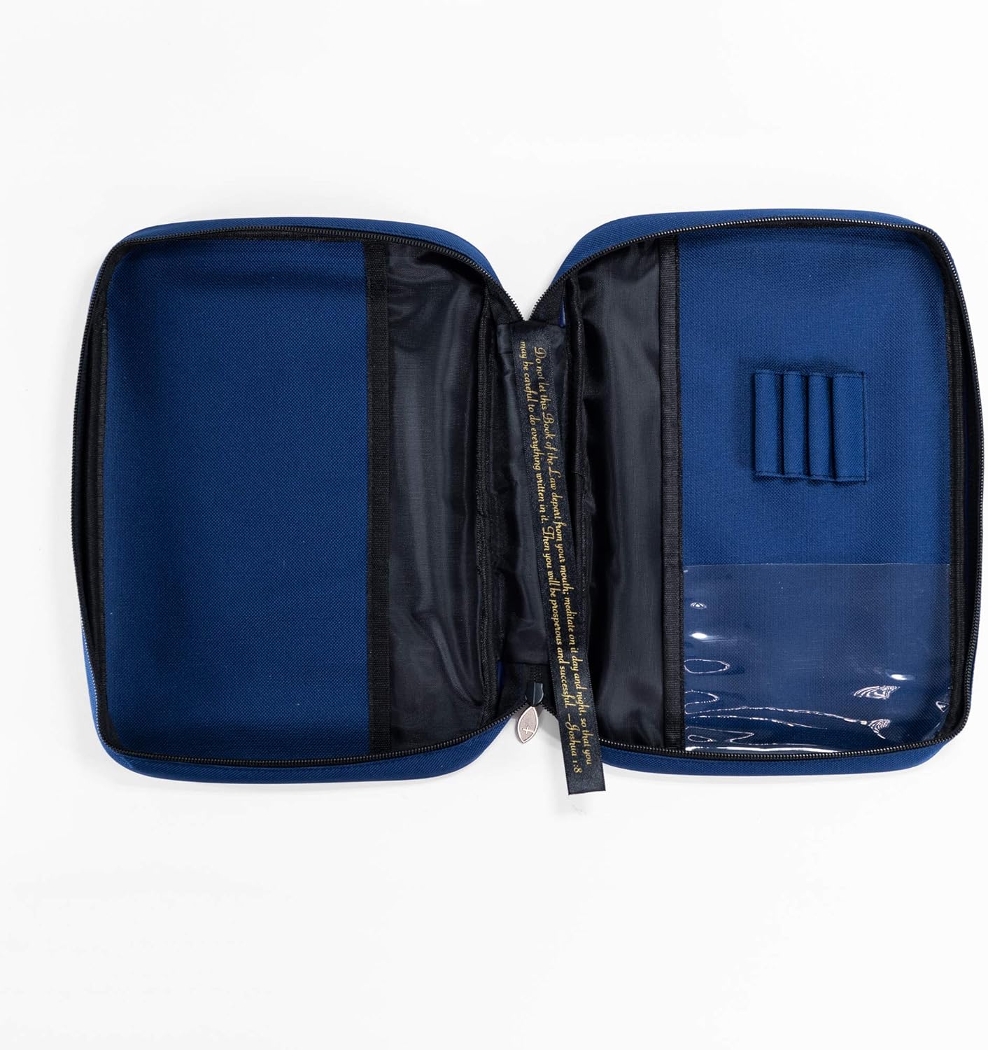 Elegante copertina per Bibbia di base in colore blu navy. Tela di qualità 600 denari. Presenta una cerniera personalizzata, una tasca interna trasparente e 4 anelli per penna/evidenziatore. Segnalibro a nastro cucito con Giosuè 1:8. Dimensioni compatte: 12,7 x 19,1 x 5,1 cm