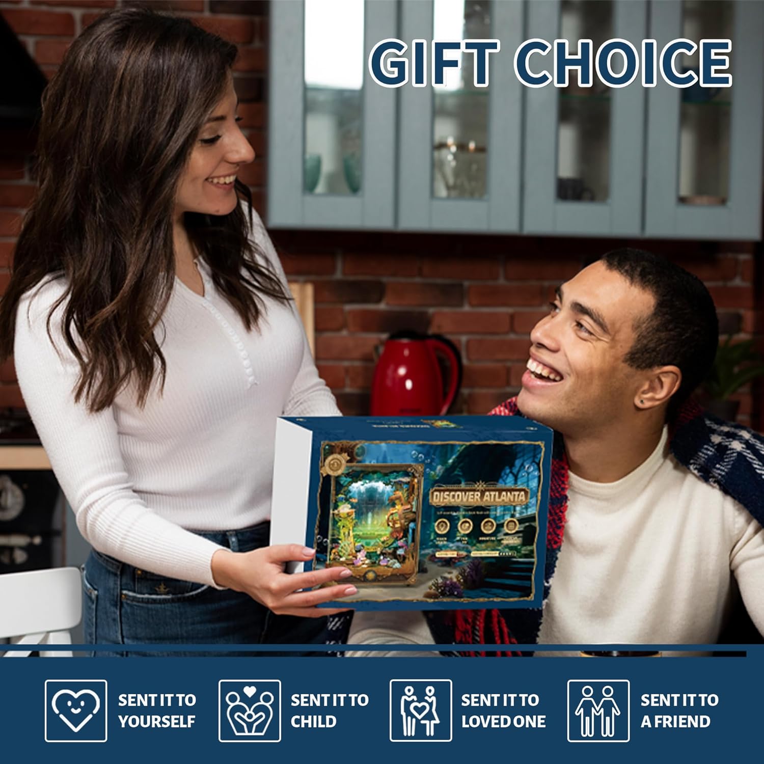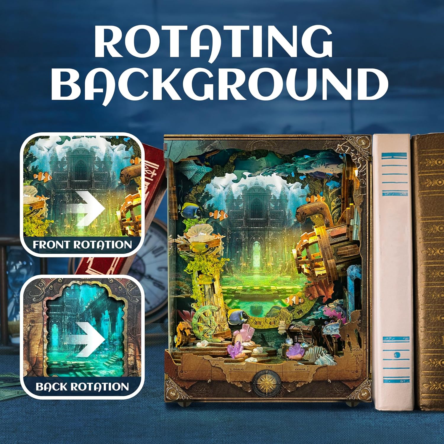Kit casa in miniatura fai da te: trasforma la tua libreria in un regno sottomarino ispirato ad Atlantide! Questo angolo del libro non è solo un modello, è una porta d'accesso alle mitiche avventure in acque profonde, perfetto per gli amanti del fantasy e i narratori 3 modalità touch per immergersi: scegli tra tre impostazioni atmosferiche: luci sottomarine + scenario rotante + paesaggi sonori oceanici, modalità luci e movimento o oscurità totale. Le luci LED multicolore a risparmio energetico imitano il bagliore delle profondità marine, creando un'atmosfera incantevole che è allo stesso tempo ecologica e ipnotizzante Caratteristiche dinamiche: uno sfondo di mare profondo rotante, design con retro scavato e copertura antipolvere scorrevole rivelano segreti sott'acqua. Aggiungi LED multicolore a basso consumo e una luce sottomarina incandescente: questo kit per libri trasforma il tuo scaffale in un oceano vivente Più di un kit: un gioiello versatile: questo angolo sottomarino stupisce come regalo, schiaccia lo stress con edifici mirati, adorna scaffali/cene/uffici e alimenta l'orgoglio per gli artigiani. Non è solo una decorazione, è un antipasto di conversazione! Costruzione premium da 315 pezzi: realizzato in legno resistente e tagliato con precisione, questo kit di casa in miniatura garantisce una vestibilità impeccabile e una costruzione robusta. Il processo di assemblaggio soddisfacente combina l'eccitazione da risolvere enigmi con risultati artistici, risultando in un angolo del libro tanto robusto quanto bello Consigli caldi: STRUCWOOD fornisce la sostituzione gratuita di parti rotte. È necessario preparare 3 batterie AA. Se avete domande o dubbi, vi assisteremo e offriremo soluzioni