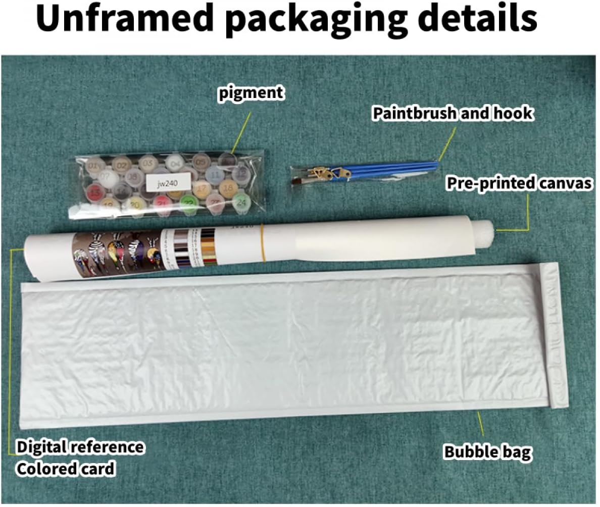 Il set include: tela prestampata colorata, 1 set di colori acrilici, 3 pennelli, 1 immagine colorata, 1 immagine di riferimento digitale, 2 ganci metallici e viti Materiali sani: le nostre vernici sono vernici acriliche con elevata riproduzione dei colori, colori brillanti, forte copertura, durevoli e non sbiadiscono, atossiche e inodori, quindi non devi preoccuparti che la vernice ti danneggi il corpo quando dipingi. Facile da dipingere: devi solo abbinare i numeri della vernice e la grafica sulla tela per riempire la vernice. Dipingi in base ai numeri dei colori e finisci uno per uno. Adatto ad anziani, adulti, bambini e principianti, è facile creare opere d'arte classiche. Ampia applicazione: puoi regalare dipinti a olio digitali alla tua famiglia e ai tuoi amici e i dipinti a olio finiti possono anche essere usati come decorazioni per il tuo soggiorno, camera da letto, ufficio, ristorante, bar. Servizio post-vendita: se hai domande dopo aver ricevuto il set di pittura a olio digitale, puoi contattare il nostro servizio clienti inviando un'e-mail. Garantiamo di rispondere e risolvere i tuoi problemi entro 24 ore.