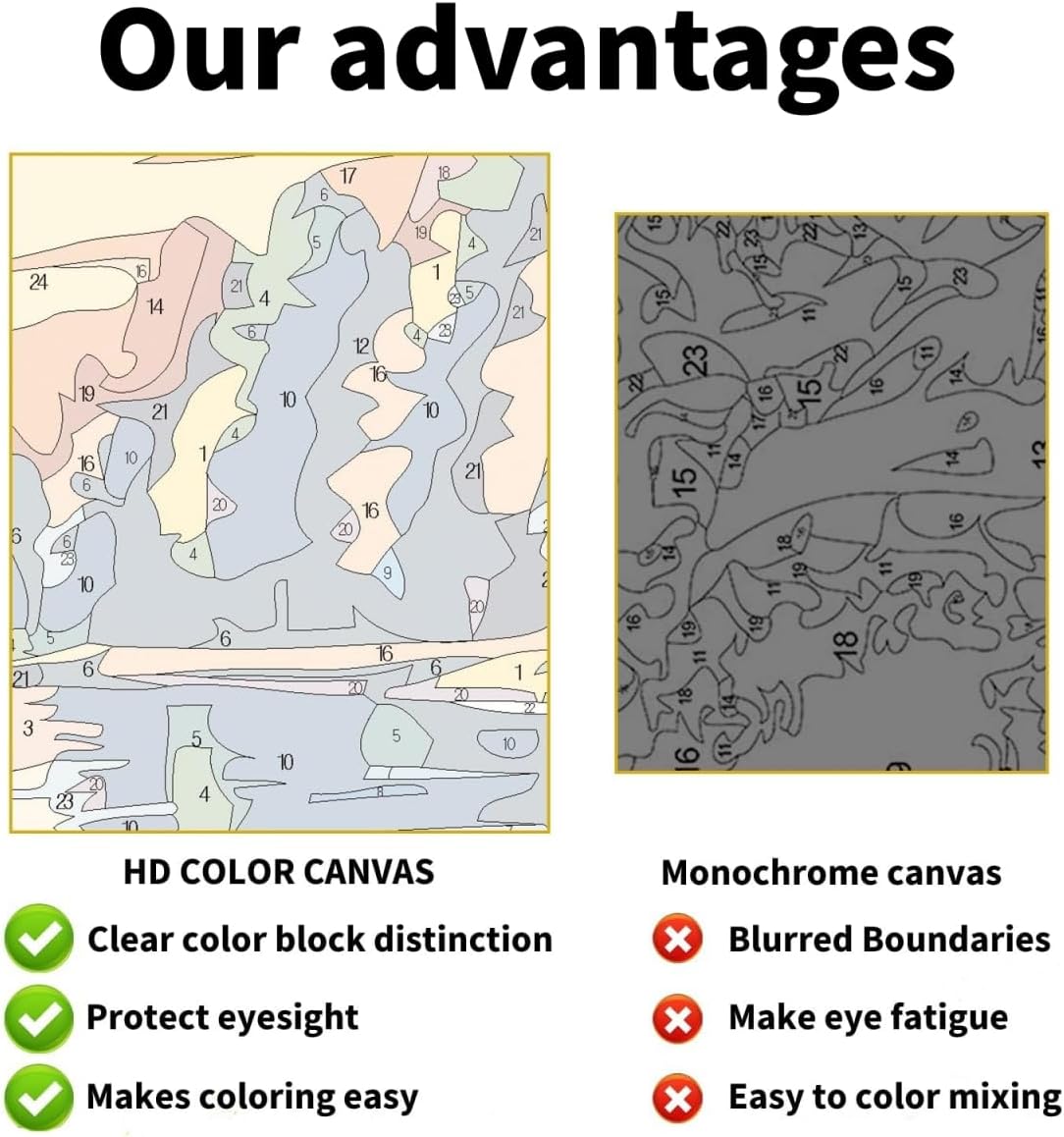 Il set include: tela prestampata colorata, 1 set di colori acrilici, 3 pennelli, 1 immagine colorata, 1 immagine di riferimento digitale, 2 ganci metallici e viti Materiali sani: le nostre vernici sono vernici acriliche con elevata riproduzione dei colori, colori brillanti, forte copertura, durevoli e non sbiadiscono, atossiche e inodori, quindi non devi preoccuparti che la vernice ti danneggi il corpo quando dipingi. Facile da dipingere: devi solo abbinare i numeri della vernice e la grafica sulla tela per riempire la vernice. Dipingi in base ai numeri dei colori e finisci uno per uno. Adatto ad anziani, adulti, bambini e principianti, è facile creare opere d'arte classiche. Ampia applicazione: puoi regalare dipinti a olio digitali alla tua famiglia e ai tuoi amici e i dipinti a olio finiti possono anche essere usati come decorazioni per il tuo soggiorno, camera da letto, ufficio, ristorante, bar. Servizio post-vendita: se hai domande dopo aver ricevuto il set di pittura a olio digitale, puoi contattare il nostro servizio clienti inviando un'e-mail. Garantiamo di rispondere e risolvere i tuoi problemi entro 24 ore.