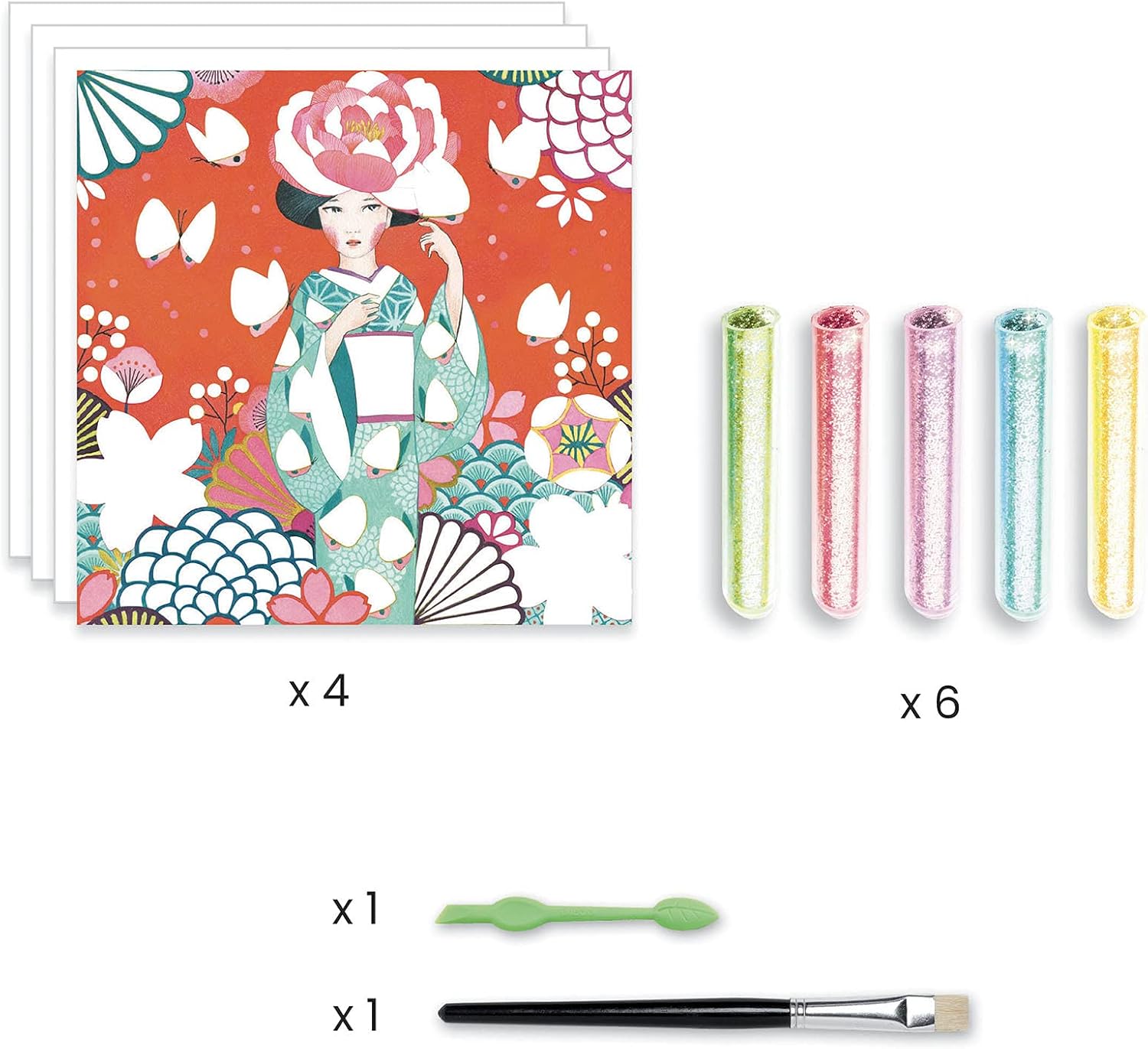 "Pittura" con glitter: staccare la carta fustellata sulla lavagna per esporre lo strato adesivo e versare e spazzolare i 6 tubi glitter. A tema principessa: con una sensazione di vernice per numero, crea le 4 principesse parzialmente illustrate con i 6 colori di glitter scintillanti, lavorano all'interno della scatola per mantenere le cose pulite e contenute. Imparare divertendosi - Sviluppa abilità motorie, creatività, immaginazione, design, composizione dei colori e narrazione; viene fornito in una scatola a forma di libro per tenere tutto insieme. Contenuto: 4 carte stampate e pre-incollate (20 x 20 cm), 6 tubi di glitter (giallo, blu, viola, rosa fluorescente, verde, fucsia), 1 strumento di plastica, 1 pennello e 1 libretto con spiegazioni passo-passo a colori. Consigliato per bambini dai 7 ai 12 anni