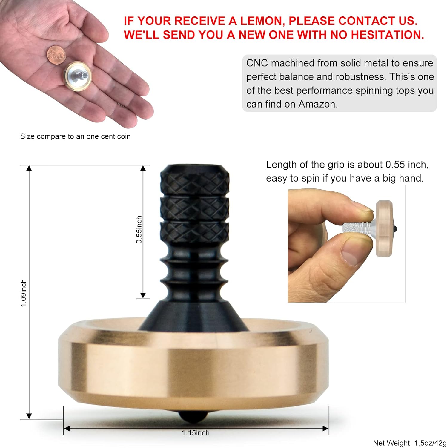 Lunga durata di rotazione: un adulto esperto può facilmente farlo girare per 5-8 minuti su un bicchiere concavo; se sei bravo a girare allora sono possibili 10 minuti. Lavorazione di precisione e materiale pregiato: lavorato a CNC in metallo solido per garantire un perfetto equilibrio e robustezza. Lo stelo in zirconio circondato da un collare in ottone; la punta in ceramica al nitruro di silicio offre un'eccezionale resistenza all'usura per un uso a lungo termine; parte superiore del corpo zigrinata per una migliore presa e giri più veloci; la lunghezza dell'impugnatura è di circa 1,4 cm, quindi se hai una mano grande sarà facile girare. Ha un bell'aspetto anche se semplicemente posizionato a tavola. Semplicemente un'opera d'arte. GRANDE TEMPO KILLER: il mio ex collega responsabile di questa linea di prodotti è stato licenziato perché ha trascorso troppo tempo a girare e cronometrare. Ogni volta che ti senti noioso (fare shopping con tua moglie o tua madre, aspettare all'aeroporto, correre per la presidenza degli Stati Uniti, ecc.) o quando vuoi fare una pausa al lavoro, o quando devi testare se sei ancora nel tuo sogno, questa è una buona scelta. Meraviglioso regalo per chi ami: questo piccolo top lucido è facile da giocare, facile da trasportare (dimensioni complessive è di circa 2,5 x 2,5 x 2,5 cm), difficile da rompere (lavorato a CNC da metallo solido) e, soprattutto, può essere giocato quasi sempre e ovunque; gioca con le tue famiglie per vedere chi può farlo girare più a lungo è una buona idea; può anche essere utilizzato nell'inseguimento di perfetto stato zen (NON FARE QUESTO AL LAVORO!!! ). Ottimo giocattolo da scrivania da aggiungere alla tua collezione. DjuiinoStar sta dietro i suoi prodotti, acquista con fiducia! Nota: tutte le nostre trottole condividono la stessa scatola esterna, è necessario aprire la scatola per vedere cos'è!