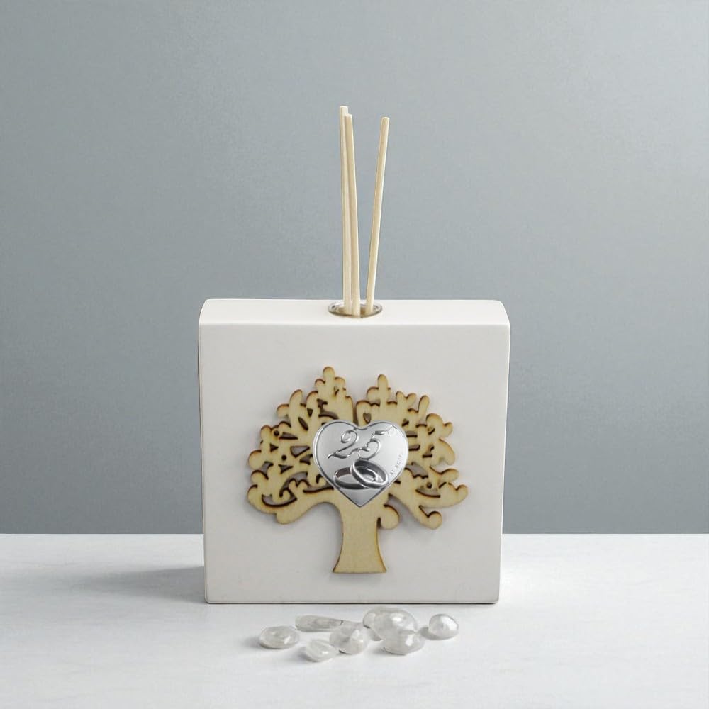 DESIGN ELEGANTE: Profumatore in ecopelle e legno con decorazione Albero della Vita e piastra a cuore con fedi per 25° anniversario, dimensioni 11x11x5 cm SET COMPLETO: Include diffusore in ecopelle bianca, essenza profumata 3 bacchettine certificato di garanzia e scatola decorativa, ideale come bomboniera per nozze d'argento MATERIALI PREGIATI: Realizzato in ecopelle di alta qualità con dettagli in legno naturale e piastra argentata, perfetto per arredamento interno DIMENSIONI COMPATTE: Misure contenute di 11x11x5 cm, ottimale per qualsiasi ambiente della casa o ufficio CONFEZIONE REGALO: Ogni profumatore viene fornito in elegante confezione regalo con essenza profumata inclusa, pronto per essere donato