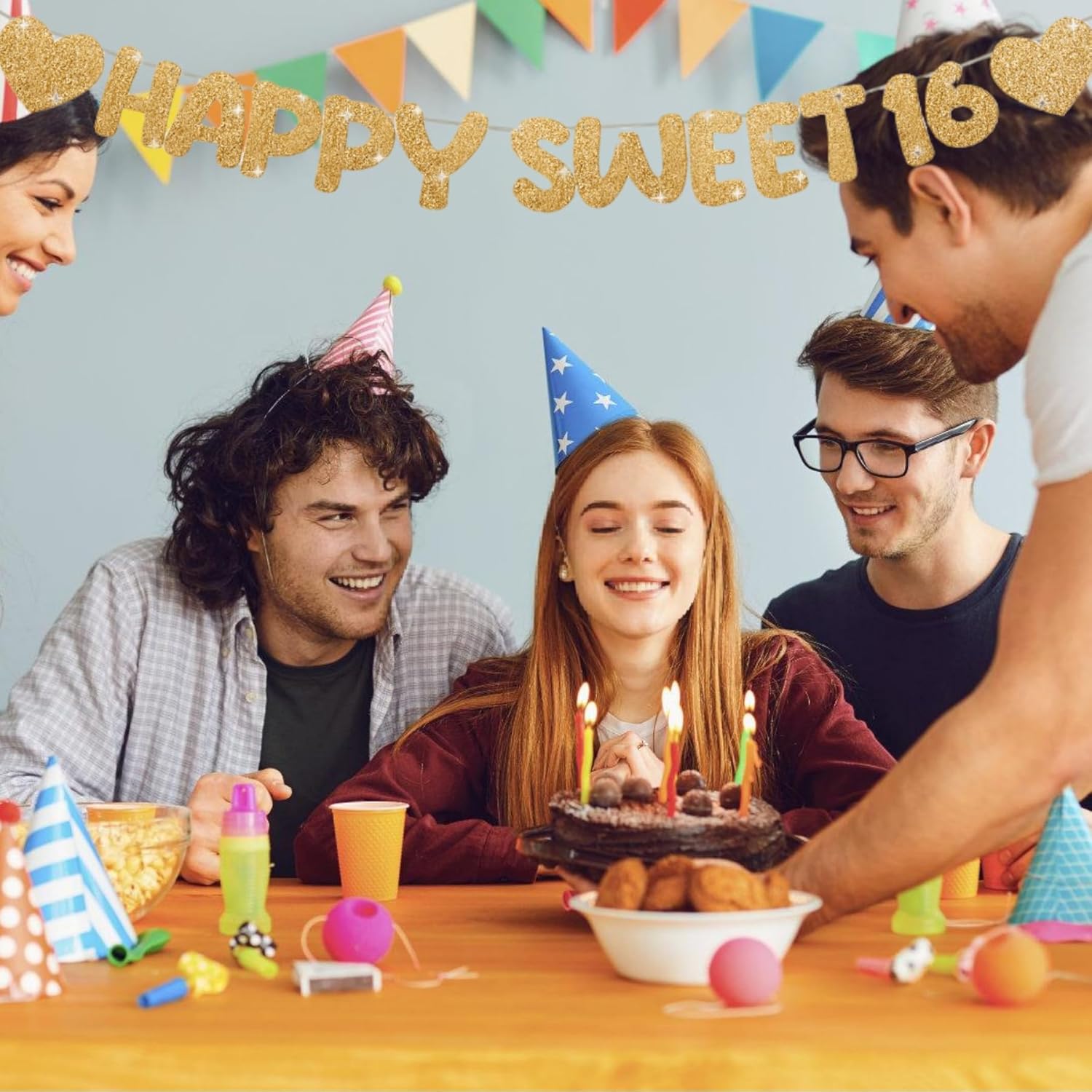 Dmnnlp Banner Happy Sweet 16 e bandiera triangolare glitterata da 15 piedi - Decorazioni per la festa del 16° compleanno - Accessori per foto (Oro)
