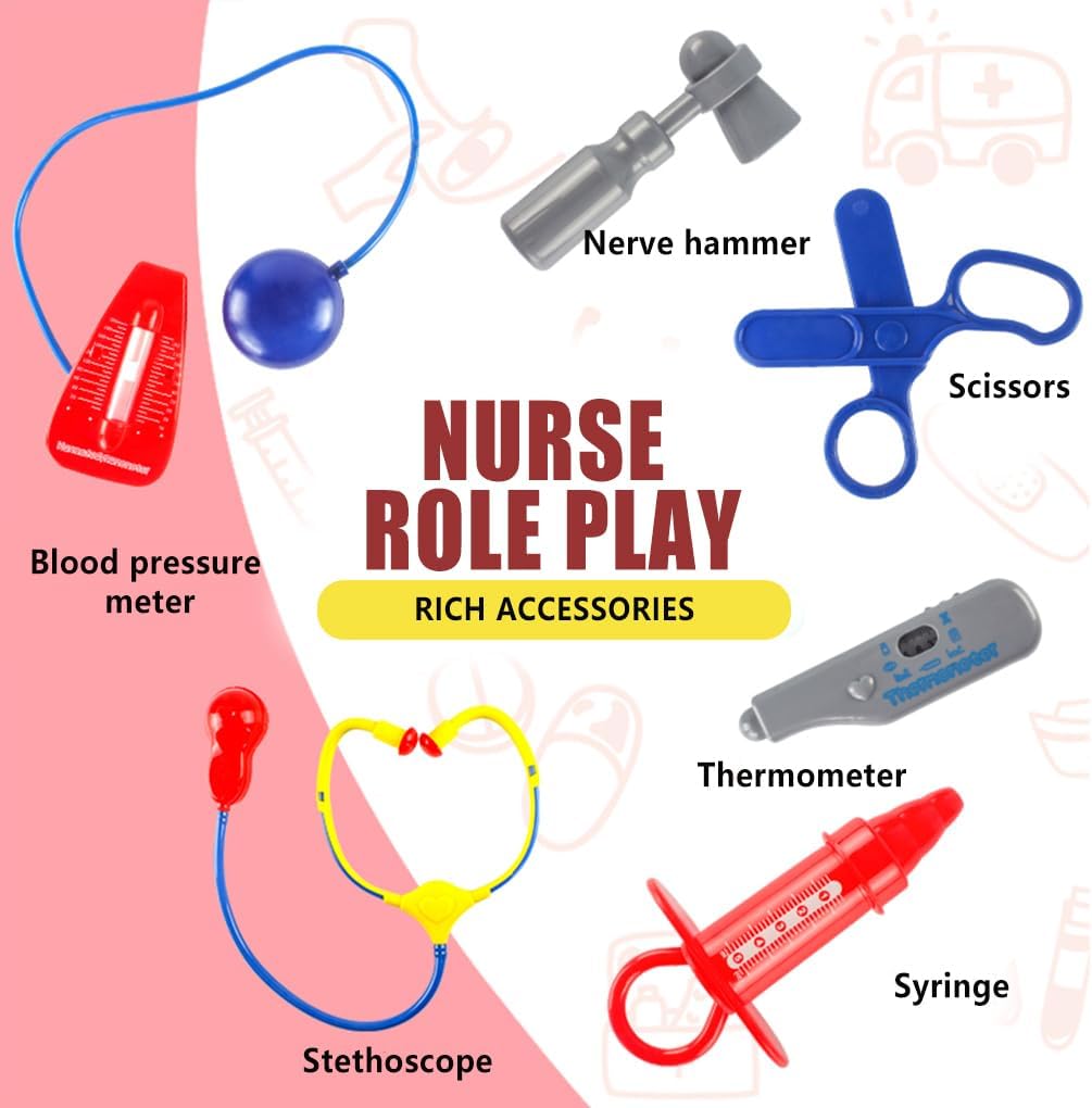 Materiale: il set da gioco del dottore è realizzato in resistente materiale plastico ABS, inodore, sicuro e durevole Caratteristiche: i kit medico sono progettati per mani piccole e sono facili da impugnare, alleviando la paura di andare dal medico Sicuro da giocare: il kit medico giocattolo non ha oggetti o bordi incisivi, quindi non devi preoccuparti che i bambini si facciano male mentre giocano Ruolo: i kit per i giochi di ruolo dell'infermiera non stimolano l'immaginazione e la creatività dei bambini, ma favoriscono anche la loro empatia e promuovono le loro abilità sociali Maggiore conoscenza del medico: i bambini possono anche comprendere l'uso di diversi strumenti infermieristici e conoscere le diverse parti del corpo