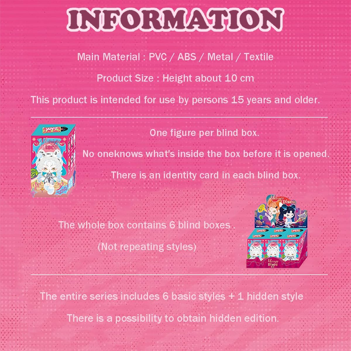 Regalo perfetto: regalo a sorpresa per gli amici per compleanno, Natale, Halloween, San Valentino e molto altro ancora. I personaggi sono carini e un regalo giocattolo da collezione. Da mostrare in casa, per feste, accessori da scrivania o all'interno dell'auto. Un'opera d'arte che esprime sentimenti ed emozioni. Materiale: la superficie è liscia e di alta qualità. Materiale PVC/ABS/metallo/tessile non tossico, innocuo e inodore. I simpatici personaggi Lucky Box giocattoli colori dei personaggi sono vivaci e non facili da sbiadire. Design casuale: ogni borsa è disposta in modo casuale. È possibile ottenere l'output nascosto in una singola scatola con una probabilità di 1/144. Quindi, se lo ottieni, congratulazioni, sei molto fortunato! Cute Size Toys: l'altezza di ogni personaggio è di circa 10 cm. Misuriamo manualmente la dimensione. Lievi variazioni sono considerate normali. Nome del prodotto: i giocattoli DODO NAMI Midnight Disco Serie Blind Box sono oggetti da collezione che vengono forniti in una scatola sigillata, con il contenuto sconosciuto agli acquirenti fino a quando non li apre. Questa collezione di serie include 6 personaggi regolari e 1 edizione nascosta.