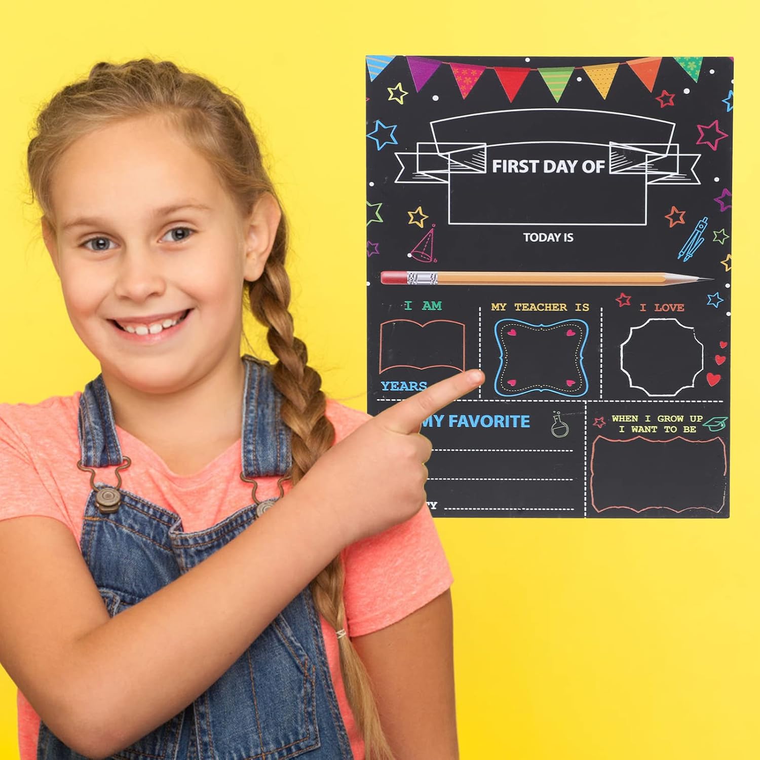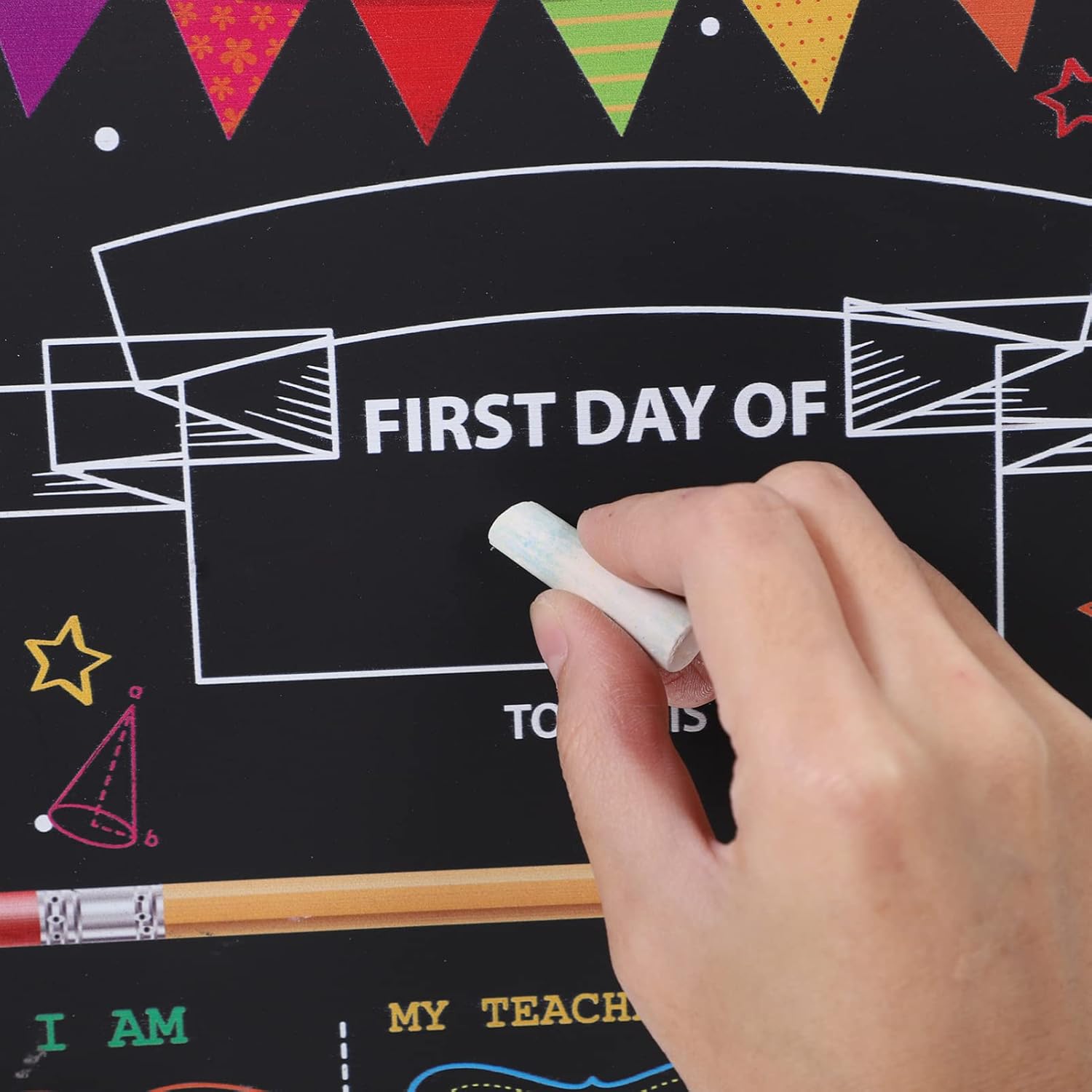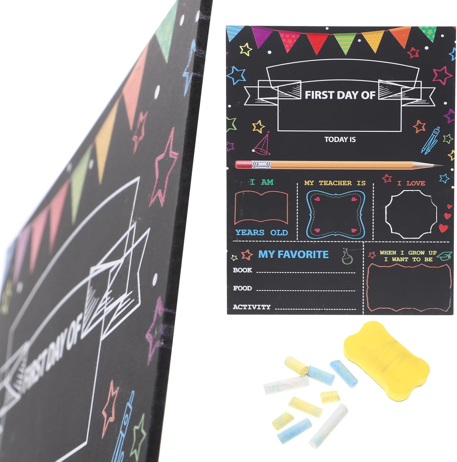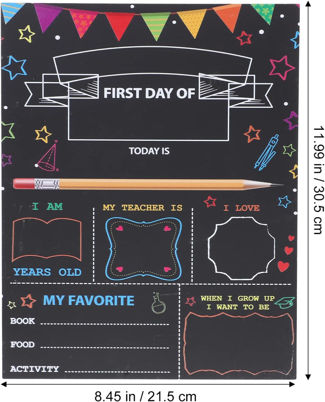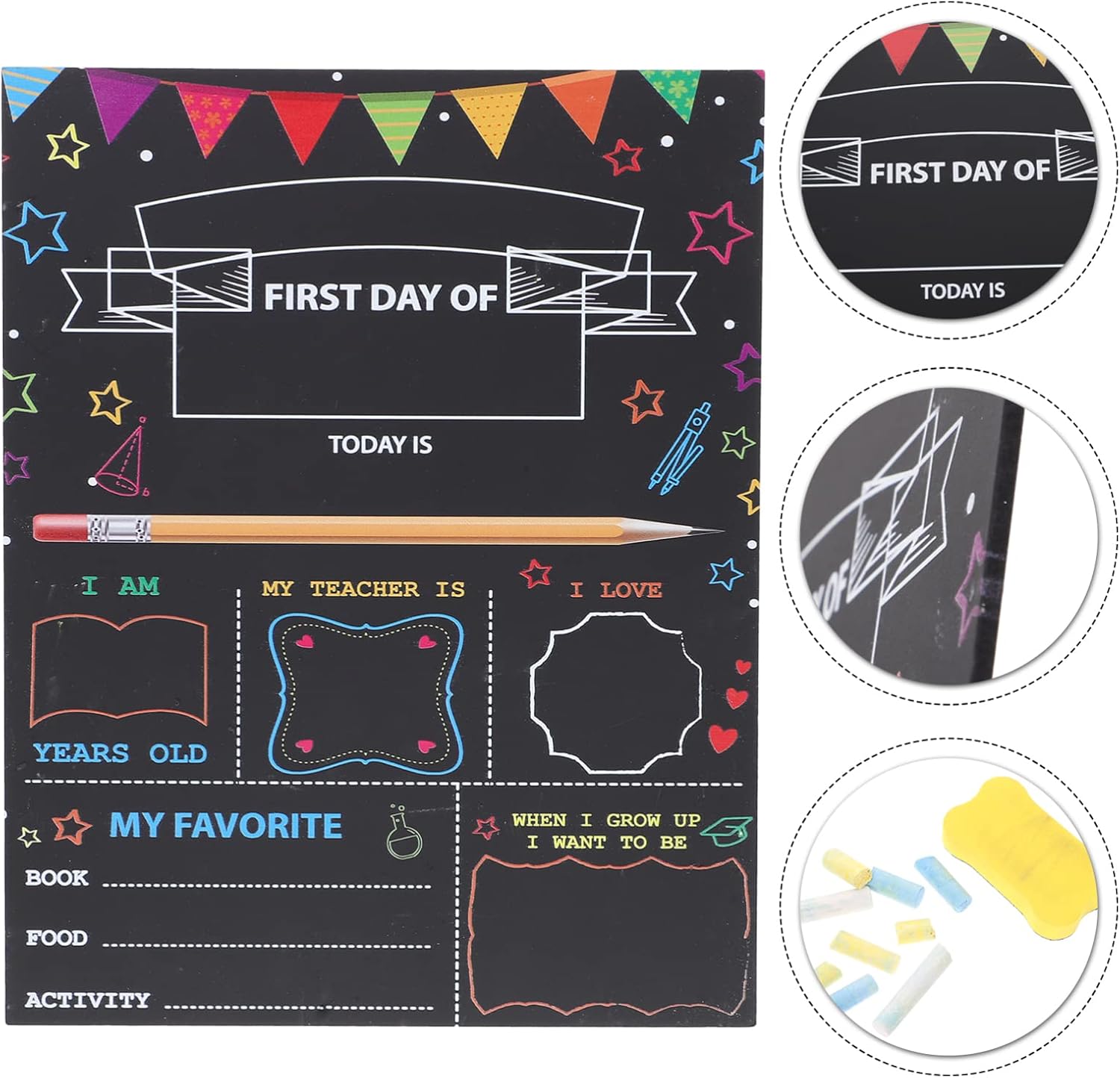 DIMENSIONI IDEALI PER LE FOTO: 12 x 8 pollici, generose, da tenere in mano bambini mentre mostrano il loro voto, il dell'insegnante e le loro aspirazioni. SET COMPLETO DI ACCESSORI PER LA FOTOGRAFIA: CONTIENE TUTTO L'ESSENZIALE: 1 LAVAGNA DECORATIVA BIFACCIALE, GESSETTI DI CASUALI E UNA PRATICA MINI GOMMA-spugna. DEL PRIMO : cattura i ricordi più preziosi con questa lavagna riutilizzabile, progettata appositamente per le foto del primo di scuola e per le tradizioni annuali. DESIGN BIFACCIALE: realizzata in materiale composito di plastica e legno, questa robusta tavola presenta due lati utilizzabili e pulisce facilmente, potendo essere riutilizzata ogni anno. GRAFICA VIVACE A TEMA SCOLASTICO: presenta allegri disegni stampati che lo rendono sia un funzionale accessorio fotografico che un'affascinante decorazione per l'aula.