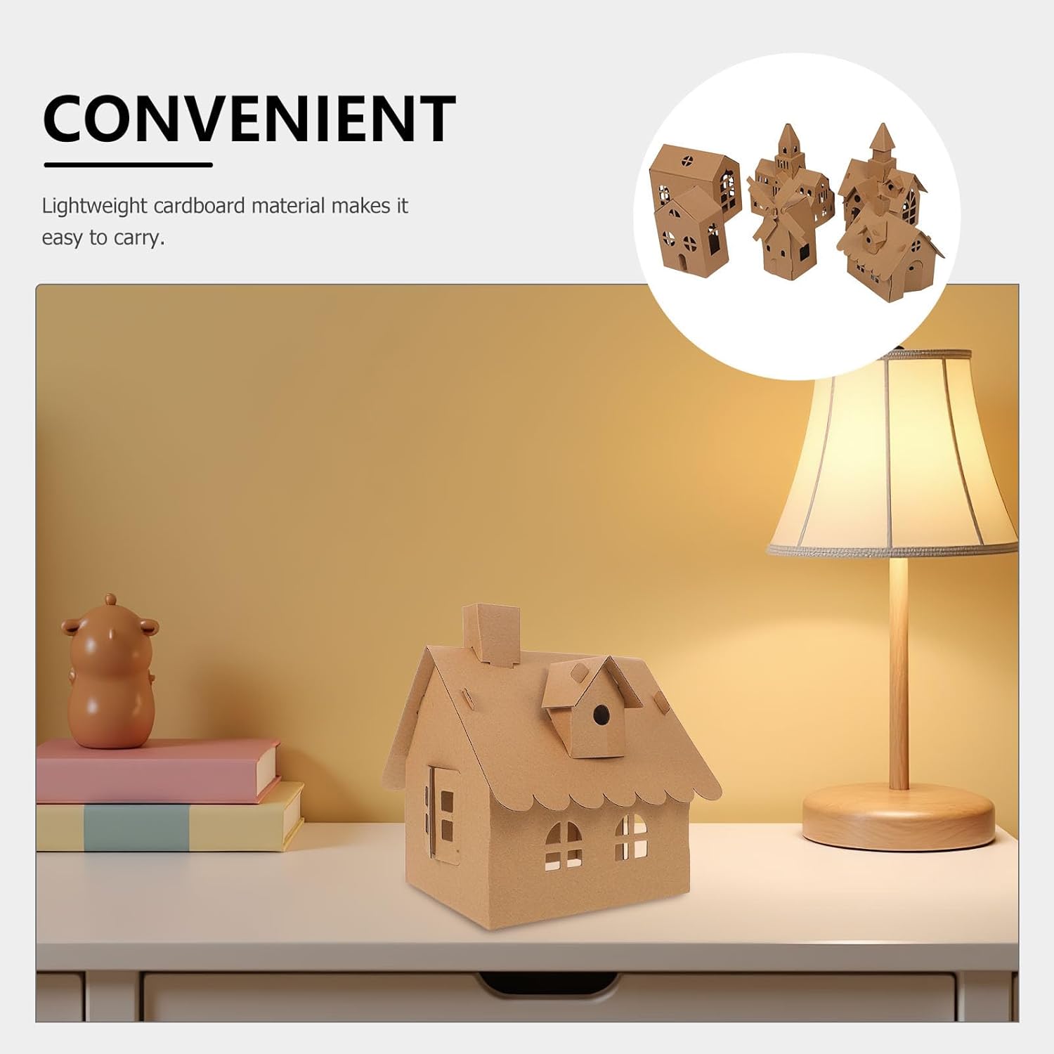 Libertà di progettazione: consente ai bambini di realizzare la propria casa di cartone con design unici, incoraggiando la creatività e il pensiero indipendente Avventura da colorare: presenta pannelli vuoti in cui i bambini possono esprimere i loro talenti artistici, migliorando la coordinazione e le capacità artistiche Tempo di divertimento in famiglia: crea opportunità per genitori e figli di legare attraverso un progetto fai da te condiviso, rafforzando i rapporti familiari Artigianato portatile: leggero e facile da trasportare, adatto per sessioni di artigianato a casa e a scuola Benefici educativi: introduce i bambini ai concetti di base dell'ingegneria e dell'architettura, migliorando la loro comprensione delle disposizioni spaziali
