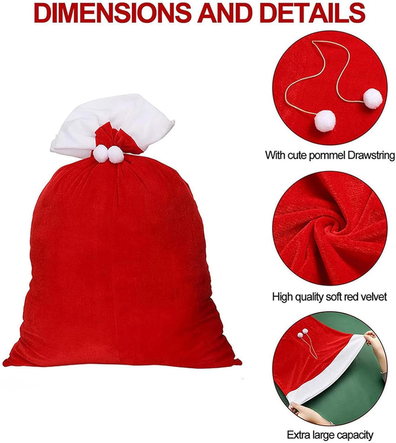 Sacchetti per le celebrazioni natalizie: progettati per celebrare l'arrivo del Natale e mantenere un'atmosfera festosa, questi sacchetti per dolcetti amplificano le celebrazioni e diffondono in modo naturale l'allegria tipica del periodo natalizio Utilità multifunzione: sapientemente progettati per organizzare cosmetici e calze, riporre giocattoli ingombranti e contenere snack, offrendo una versatilità senza pari per varie attività di organizzazione domestica Struttura robusta e sicura: progettati utilizzando tessuto antistrappo e materiali robusti, questi sacchetti per dolcetti per le celebrazioni natalizie offrono una durata affidabile e un impegno a essere sicuri e privi di odori indesiderati Affascinanti Aspetto: design adorabile con morbidi ornamenti di palline e ricco aspetto di velluto, esalta l'eleganza festosa, completata da delicati dettagli di rifinitura bianca per le borse natalizie. Ampia scelta di dimensioni: con varie opzioni tra cui 50x70 cm e 70x100 cm, queste borse natalizie offrono soluzioni di conservazione adattabili per soddisfare tutte le esigenze di conservazione di dolcetti e souvenir natalizi.