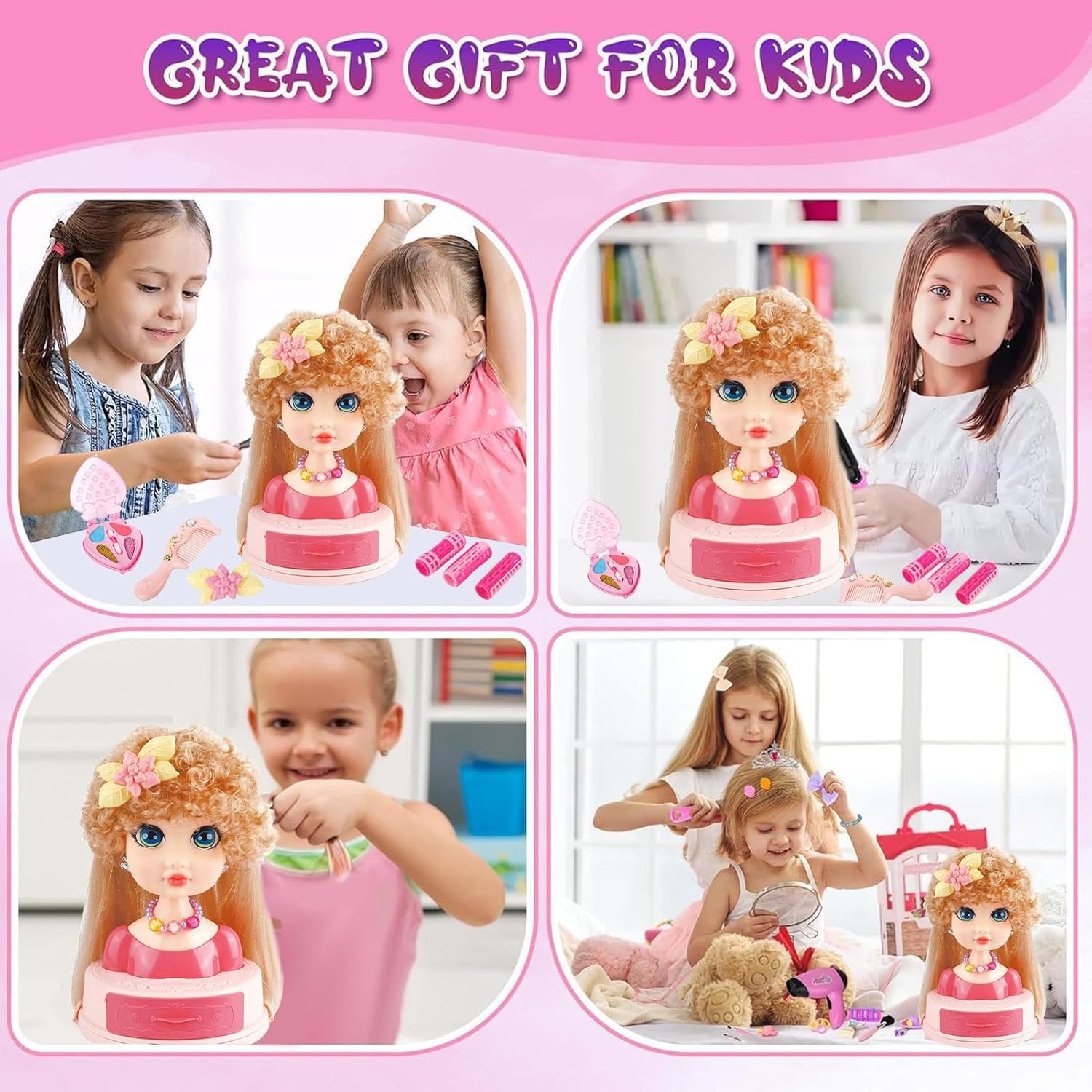 Realistic Practice Mannequin Head for Styling Fun: Designed specifically for young learners, this doll head soft, realistic synthetic hair that's perfect for braiding, curling, brushing, and styling, helping kids build hands-on confidence and creativity Complete Pretend Beauty Salon Set for Beginners: Includes a full set of accessories like hairpins, combs, and pretend makeup tools to create a full salon experience Great for 3–6-year-old girls learning through imaginative and interactive play Safe and Durable Materials for Young Children: Made from high-quality and synthetic fibers, this toy ensures safe play for young kids while offering lasting durability that withstands frequent styling and creative experiments Educational Toy Enhancing Fine Motor Skills: This hairstyling doll set promotes coordination and , allowing children to improve dexterity through fun activities like parting, braiding, and pinning hair in endless fun combinations Perfect Indoor Entertainment for Holidays and Birthdays: Whether it’s a rainy afternoon, , or special occasion, this beauty makes a charming gift for birthdays, Christmas, or playdates, keeping kids entertained and engaged indoors