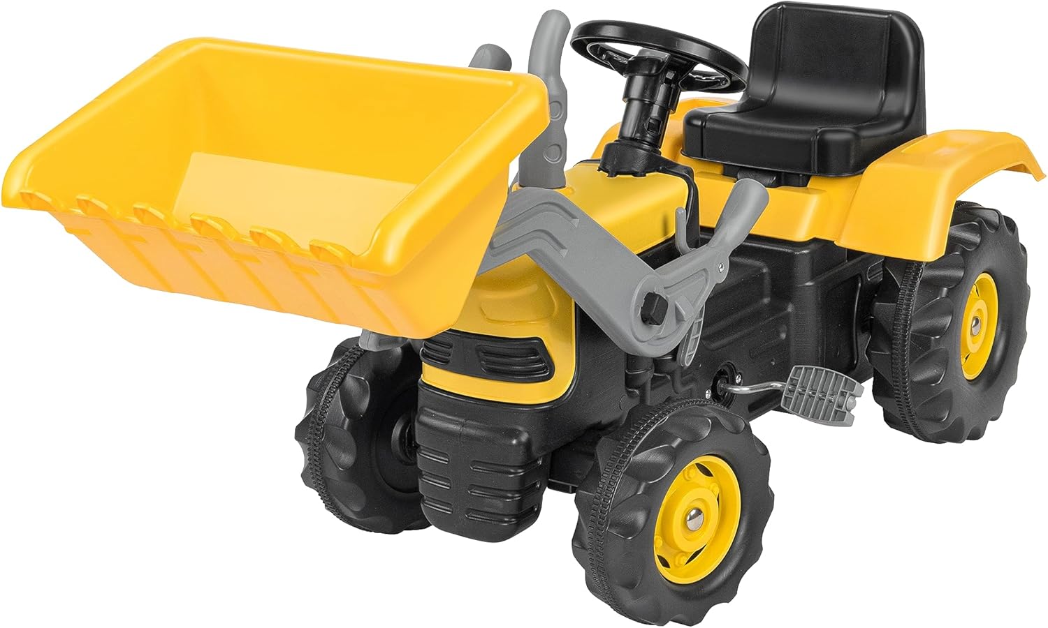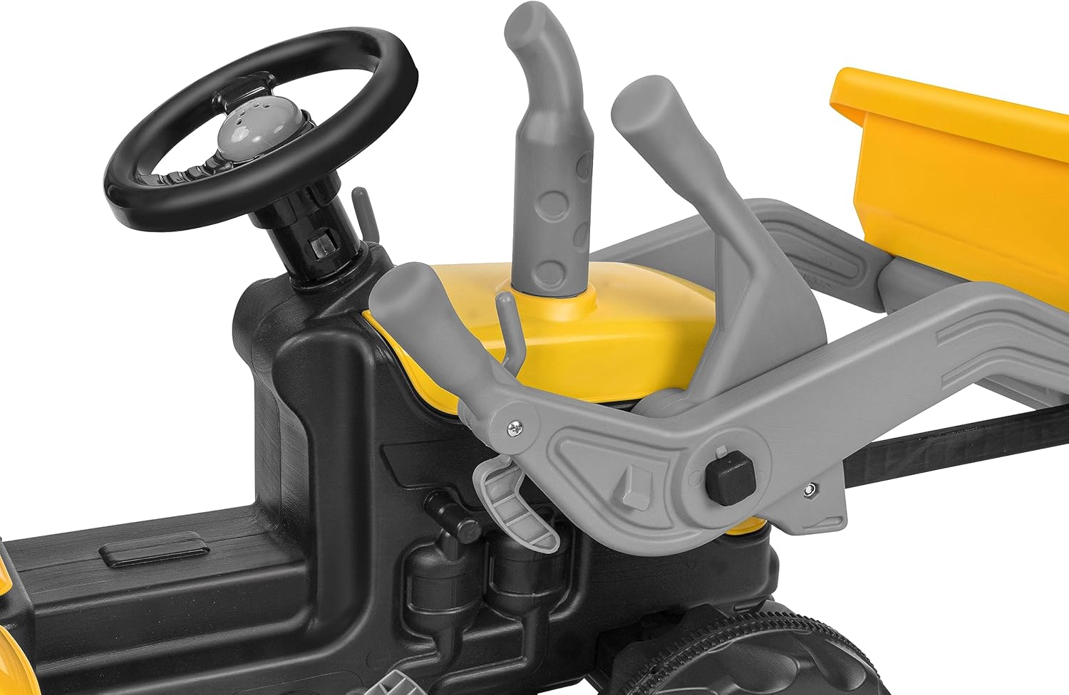 Trattore giallo a pedali con escavatore funzionante Tanti dettagli realistici proprio come un vero mezzo da cantiere 4 solide ruote sagomate per il massimo del grip Volante girevole con clacson Pedali sagomati per presa e comfort Comoda seduta Plastica resistente e sicura per esterno Facile da pulire