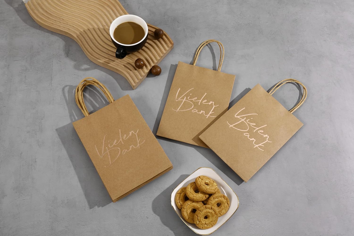 Contenuto della confezione: Di' "Grazie" in un modo molto speciale con il nostro set di 20 sacchetti regalo con manici. Materiale: i sacchetti sono realizzati in robusta carta kraft da 130 g/m², piacevole al tatto. Dimensioni: Le borse hanno una dimensione di 21 x 15 x 8 cm. Caratteristiche del prodotto: sui sacchetti regalo è stampata la scritta "Grazie" in fine goffratura color oro rosa. Le borse sono molto stabili e riutilizzabili. Utilizzo: questo set è adatto per Natale, compleanni, feste aziendali e tante altre occasioni. Puoi usarlo sia in ambienti privati che aziendali.