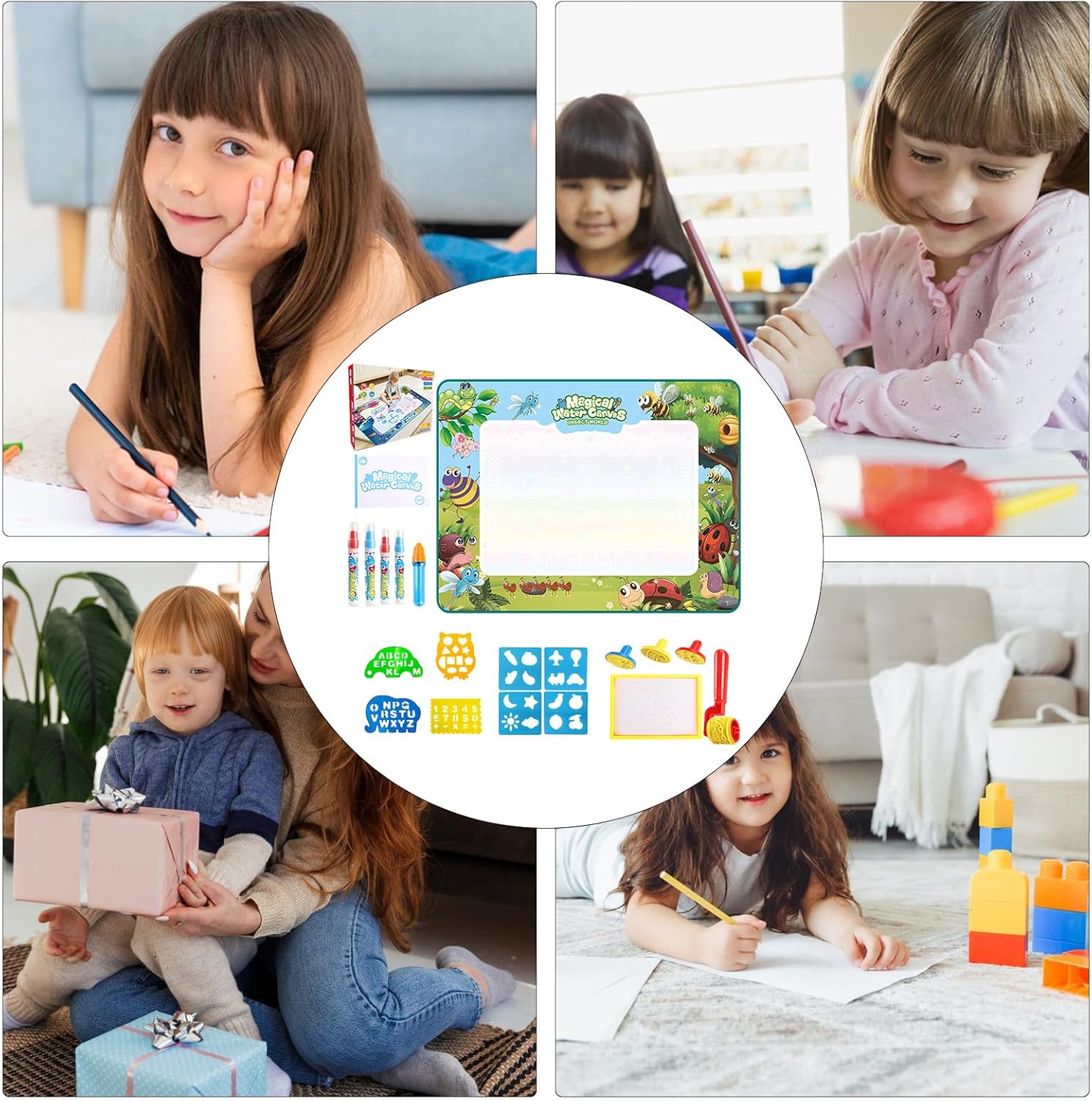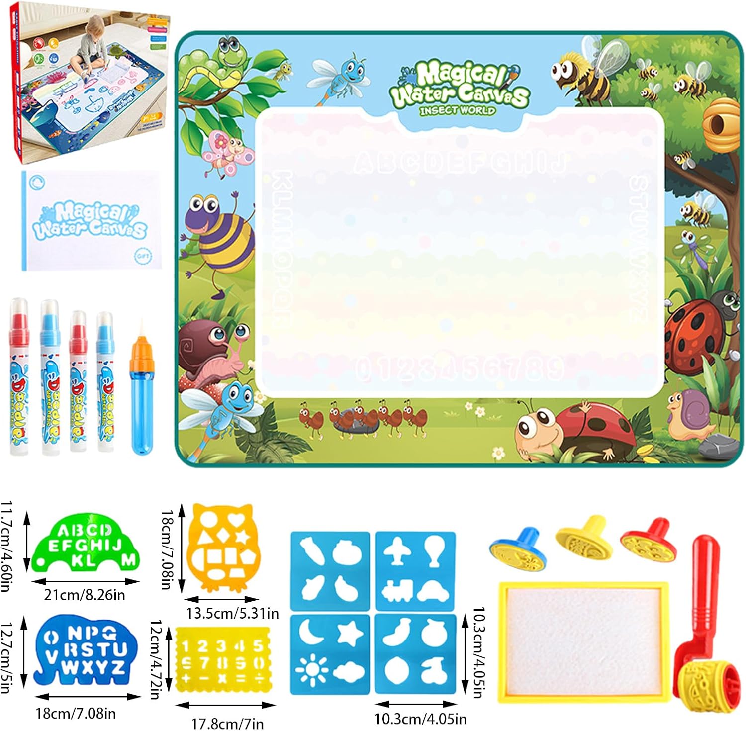 Materiali eccellenti: questo blocco da disegno per scarabocchi ad acqua è realizzato in tessuto non tessuto di poliestere di alta qualità, durevole, ecologico e sicuro per i bambini. Pulendolo con un panno umido lo mantiene pulito e igienico, garantendo più creatività e divertimento. Facile da usare: disegna sul blocco per scarabocchi ad acqua con la penna charm riempita con acqua pulita e guarda la tua d'arte scomparire dopo 5-10 minuti, pronta per una nuova creazione. Non sono necessari inchiostro, vernice o pastelli, acqua. Goditi un divertimento senza inchiostro e senza problemi con i tuoi bambini. Promuovi la crescita artistica: incoraggia la crescita artistica di tuo figlio con il nostro blocco da disegno con scarabocchi ad acqua, un'attività divertente ed educativa che sviluppa la coordinazione occhio-mano e la percezione del colore. Regalo adatto: sorprendi i tuoi bambini con questo blocco da disegno per scarabocchi ad acqua senza disordine. Non è necessario inchiostro o vernice, acqua. Riutilizzabile e facile da pulire, questo tappetino garantisce ore di intrattenimento creativo durante il Ringraziamento, Natale, festività speciali o compleanni. Facile da riporre: porta la tua creatività ovunque con il design pieghevole di questo blocco da disegno con scarabocchi ad acqua che lo rende facile da trasportare in zaino, permettendoti di usarlo sempre e ovunque ti senti ispirato.
