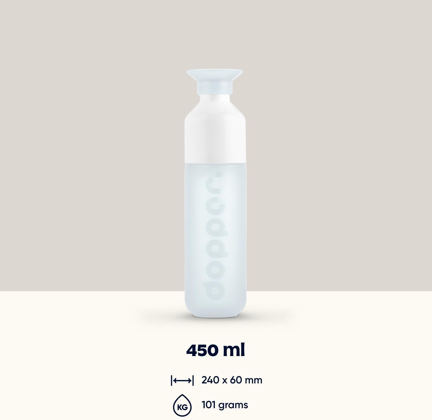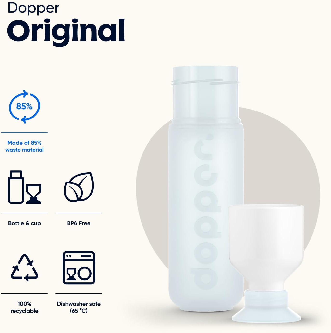 BOTTIGLIA DA 450ML, PERFEZIONE PURA - Riempibile all’infinito con acqua di rubinetto. La Dopper Original è lavabile in lavastoviglie (fino a 65 °C), priva di BPA e leggera da portare ovunque. BOTTIGLIA PER IL BENE - Dopper è una B Corporation certificata. Facciamo business per una missione. Con una Dopper eviti 104 bottiglie di plastica monouso all’anno. BOTTIGLIA E TAZZA - L'apertura garantisce un flusso d'acqua ottimale e facilità per bere. L'esclusivo e pluripremiato design in tre parti rende la Dopper facile da riempire, pulire e trasforma la metà superiore della bottiglia in una tazza. 100% MATERIALI RICICLABILI - 85% di materiali riciclati e produzione in una fabbrica olandese a energia rinnovabile. Diametro 6 cm - Altezza 24 cm - Peso 101 g - PP (bottiglia, tappo), Tritan Renew (tazza), TPE (guarnizioni). SOSTENIBILITÀ - Prima collezione di borracce al mondo con certificazione Cradle to Cradle Gold: dalla progettazione alla fine del ciclo di vita, soddisfa i più severi standard ambientali ed etici.