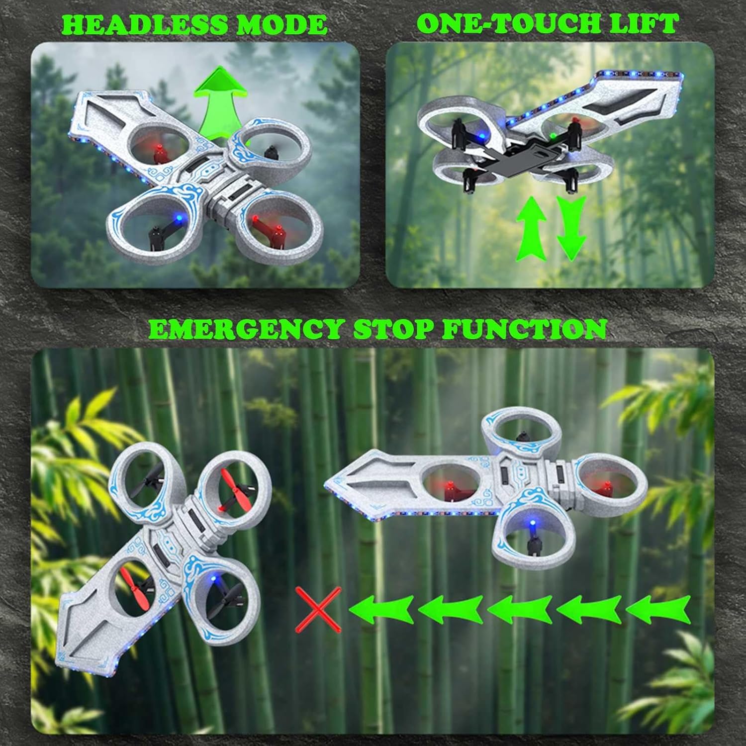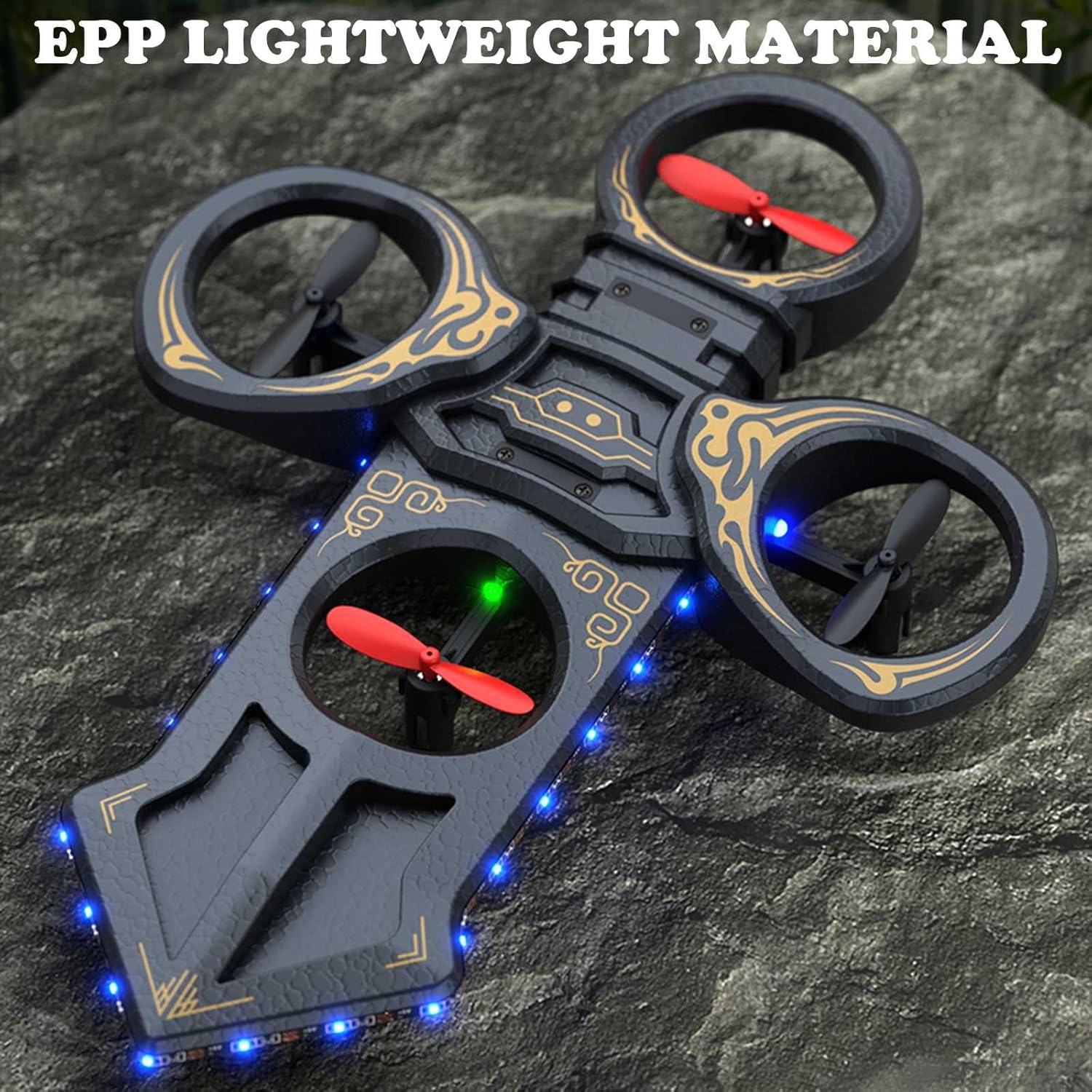 Questo aereo in schiuma telecomando presenta un design unico a forma di spada per voli accattivanti, arricchito con luci LED fredde per prestazioni notturne mozzafiato Goditi Nessun problema di volo con un solo tasto di decollo/atterraggio, giri a 360°, modalità senza testa e rotazione a un tasto, rendendolo perfetto per principianti ed esperti Realizzato in schiuma EPP e può resistere a molti impatti. Il sistema di auto-stabilizzazione e la grande ala consentono un volo lento Controlla senza sforzo salita/discesa, avanti/indietro e volo sul lato sinistro/destro per un'esperienza di volo fluida e reattiva Fornisce al pilota un'esperienza di volo perfetta, anche se sei un principiante, puoi anche controllarlo facilmente e goderti il volo