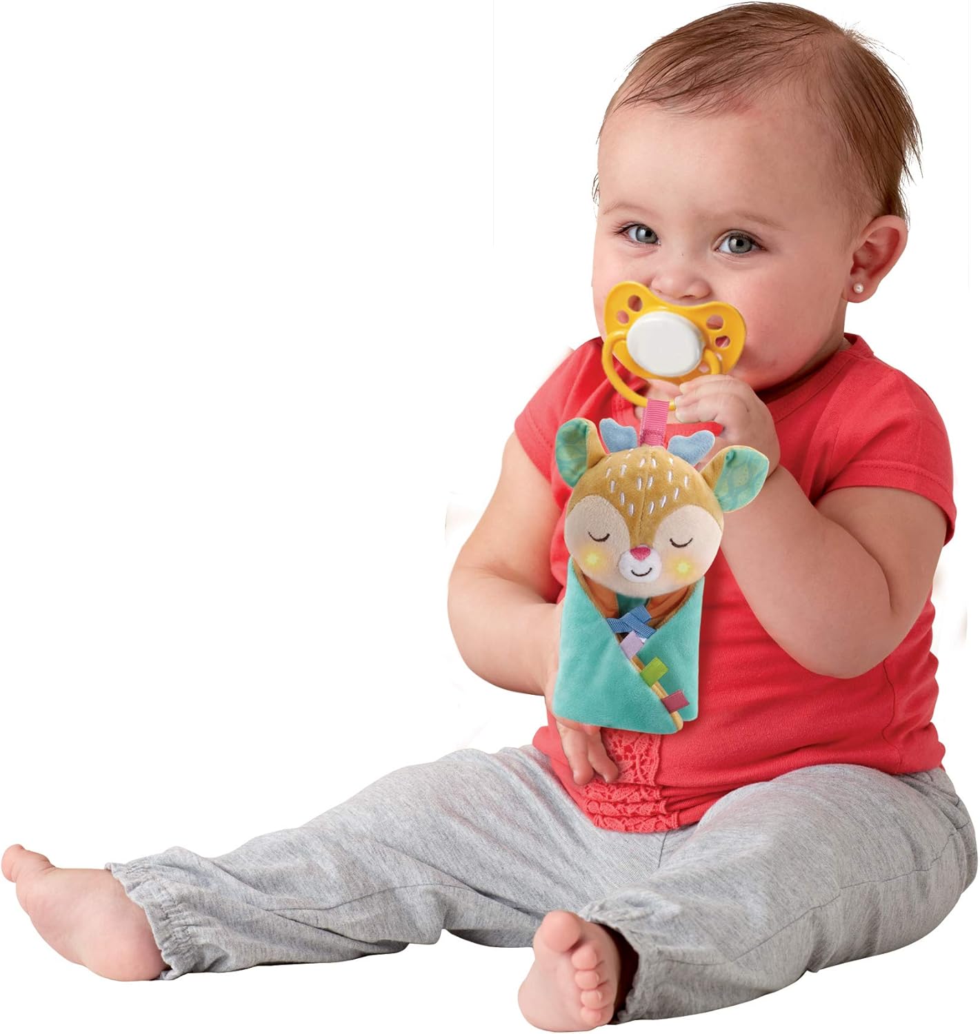 Versione spagnola Una morbida coperta di accompagnamento per riporre il ciuccio. Adorabile personaggio di cervo con doppia funzione: coperta con peluche e ciuccio Il naso della bambola si illumina al ritmo della musica e dei suoni. Diverse trame per stimolare il senso del tatto: nastri, fogli croccanti, silicone con motivi, tessuto, peluche Include massaggiagengive per alleviare il dolore alle gengive dall'uscita dei primi denti..Facile da lavare in lavatrice (il suo modulo elettronico è rimovibile)..*VTech si preoccupa del nostro pianeta. La confezione di questo giocattolo è composta da cartone riciclabile al 100%.