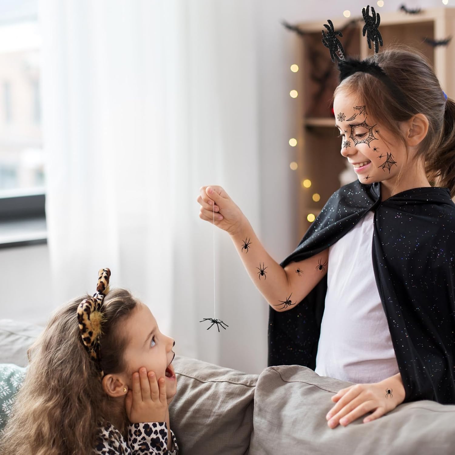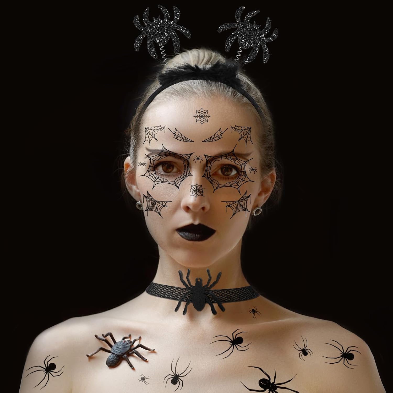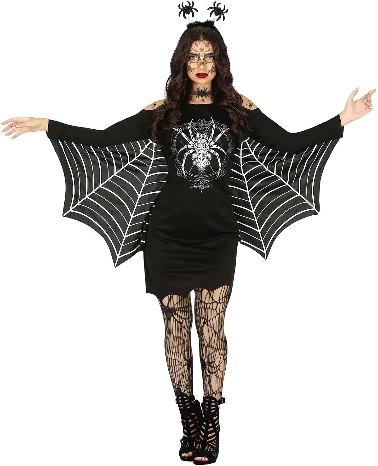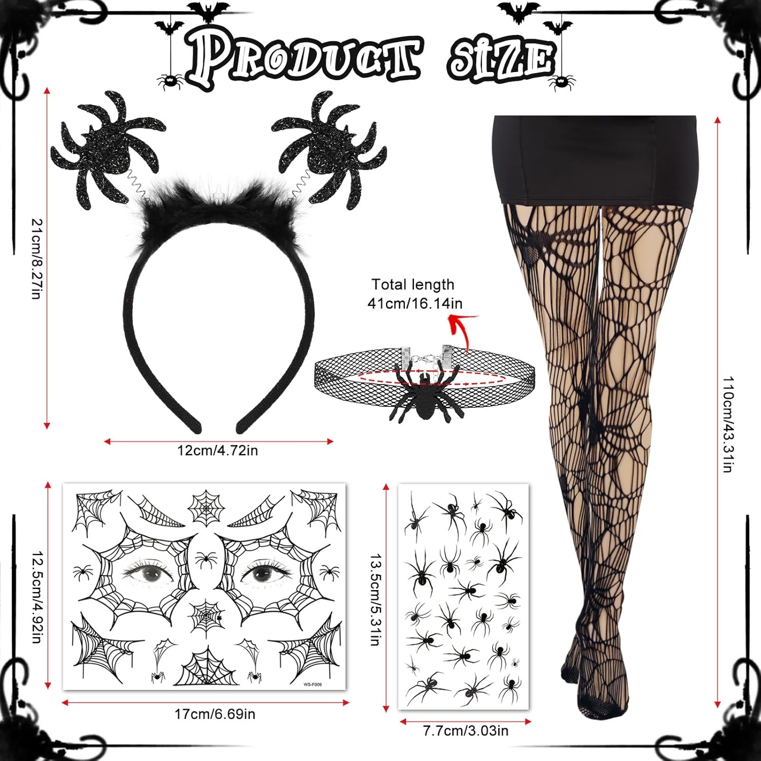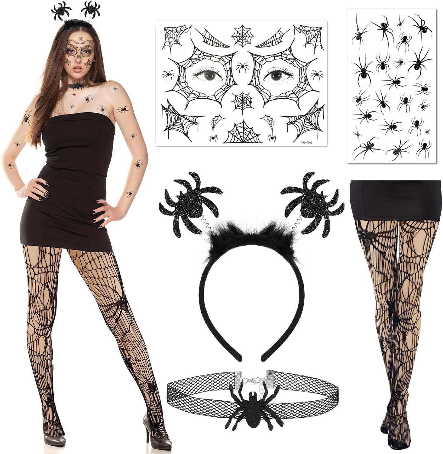 Accessori per il costume da ragno di Halloween: il set contiene una serie di articoli: 1 fascia per capelli di Halloween con ragno nero, 1 paio di collant di ragno di Halloween, 1 foglio di tatuaggi per il viso di ragno, 1 foglio di tatuaggi di ragno, 1 collana di ragno per idee per costumi di ragno di Halloween. Cerchietti per ragno nero: l'accessorio per capelli nero di Halloween mostra due ragni glitterati ed è decorato con pelliccia. Il copricapo di Halloween è comodo e sicuro, perfetto per le lunghe celebrazioni di Halloween. Questo copricapo da ragno di Halloween aggiungerà un tocco drammatico e inquietante al tuo costume, rendendolo il punto focale del tuo look. Tatuaggi temporanei di ragni neri: questo set include un tatuaggio sul viso di una ragnatela nera e un tatuaggio di un ragno nero con un disegno realistico di un ragno che può essere applicato sul viso o sul corpo, facile da applicare e rimuovere, perfetto come accessorio per il trucco del ragno di Halloween adatto. Collant neri a ragnatela: questi collant di Halloween presentano intricati motivi a ragnatela che corrono lungo le gambe, aggiungendo al tema spettrale del tuo outfit. Questi collant realizzati in materiale elastico di alta qualità garantiscono comfort e durata. Ti permettono di muoverti liberamente e goderti i tuoi festeggiamenti senza disagio. Collana con ragno nero: la collana di Halloween presenta un delicato design a ragno che è allo stesso tempo elegante e inquietante. È leggero e comodo da indossare, il che lo rende un'aggiunta ideale al tuo completo.