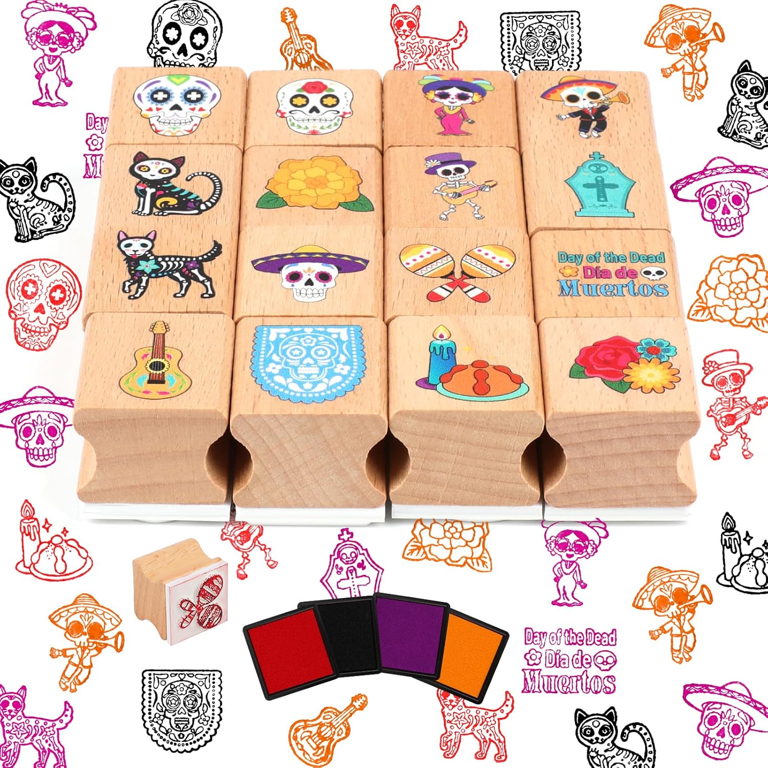 【Set di Timbri Día de los Muertos】16 timbri in legno per Giorno dei Morti: timbro Día de Muertos, timbro teschio di zucchero, timbro Catrina, timbro fiori di calendula, timbro scheletro, timbro Papel Picado, timbro sombrero messicano, timbro Pan de Muerto, timbro chitarra, timbro maracas... 【Alta Qualità】Timbri fai da te per il teschio Messicano realizzati in legno, riutilizzabili e resistenti. 4 tamponi di inchiostro per timbri (rosso, viola, nero, giallo), tamponi di inchiostro in spugna e materiale plastico. I timbri artistici messicani possono essere utilizzati su carta, legno, tessuto o body art, ecc. 【Artigianato Día de los Muertos】Timbri per catrina Messicana con tamponi di inchiostro adatti ai bambini, da stampare sulla carta da regalo del Dia de los Muertos, biglietti d'auguri per il Dia de los Muertos, album fai da te per il Dia de los Muertos, forniture per progetti artistici e artigianali per il Dia de los Muertos. 【Ampia Applicazione】Timbri di teschio ideali per bambini e adulti, forniture per attività artistiche e artigianali per il Giorno dei Morti, graffiti per il Giorno dei Morti, stampe per il Giorno dei Morti, regali artigianali per il Giorno dei Morti, bomboniere per la festa messicana. 【Acquista con Fiducia】Per qualsiasi problema con il nostro set di timbri per il Día de los Muertos, contattaci per assistenza. Per altri accessori per costumi del Día de los Muertos, cerchietto maschera del Día de los Muertos, tatuaggi decorazioni per il Dia de los Muertos, visita il negozio DPKOW.