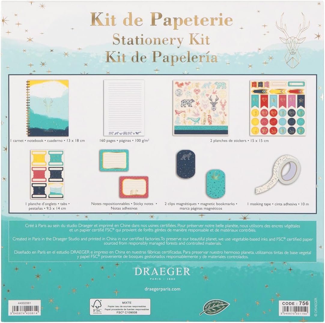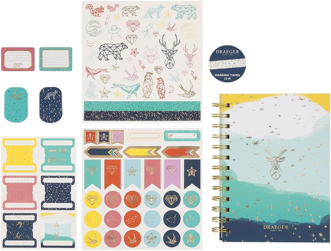 UN NOTEBOOK DA PERSONALIZZARE: Con il nostro kit di cancelleria, personalizza il tuo notebook a tua immagine! Questo kit può essere utilizzato per creare un bullet journal, un diario, un diario... Le possibilità sono infinite! Quaderno a spirale che misura 13 x 18 cm, 160 pagine e una grammatura di 100 g/m². UN KIT COMPLETO: Questo kit contiene tutto il materiale necessario per personalizzare il tuo quaderno: 1 quaderno, 6 schede in cartone, 2 clip magnetiche che possono essere utilizzate come segnalibri magnetici, 2 fogli di adesivi da 15 x 15 cm e 1 nastro adesivo da mascheratura da 1 cm x 10 m. UN REGALO IDEALE: regala questo kit di cancelleria per un compleanno, Natale o qualsiasi altra occasione. Questo kit, con graziosi design della nostra collezione di costellazioni, piacerà sicuramente! CARTA MISTA CERTIFICATA FSC: Per preservare il nostro bellissimo pianeta, utilizziamo inchiostri vegetali e carta certificata FSC proveniente da foreste gestite in modo responsabile e materiali controllati. DESIGNER, REGALI E ACCESSORI: Draeger ha scritto alcune delle pagine iconografiche più belle del XX secolo, lavorando per grandi nomi del lusso e collaborando con artisti rinomati come Dalì, Picasso, Cocteau e Matisse. Oggi Draeger continua a concentrarsi su prodotti di qualità, per offrire felicità ed emozioni: bellezza delle immagini, eleganza dei messaggi, nobiltà dei materiali e perfezione del design.