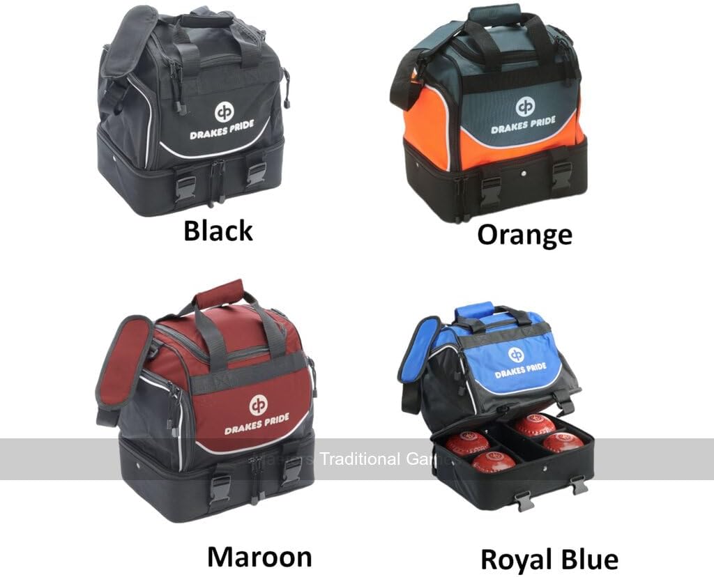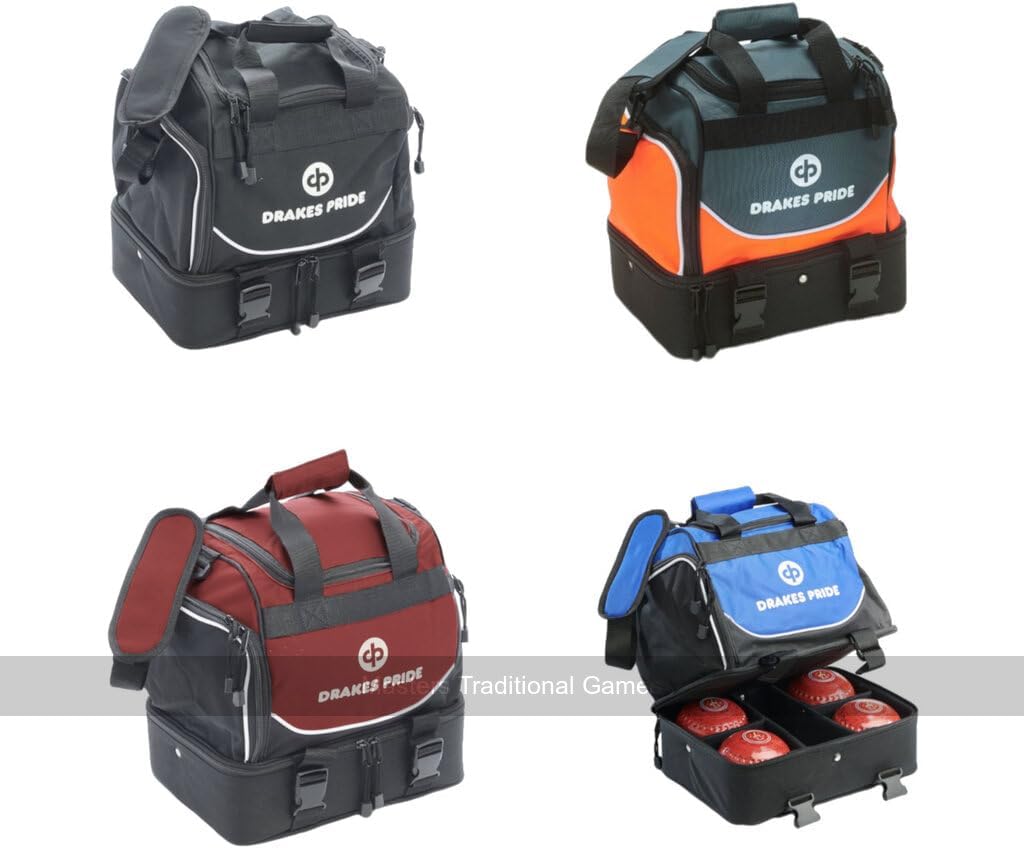 Lawn Bowls bag by leading brand Drakes Pride Holds 4 Lawn Bowls in bottom zip fastened section Side shoe / wet gear compartment. With detachable shoulder strap Durable and stylish kit bag for Lawn Bowls players Good choice of colours
