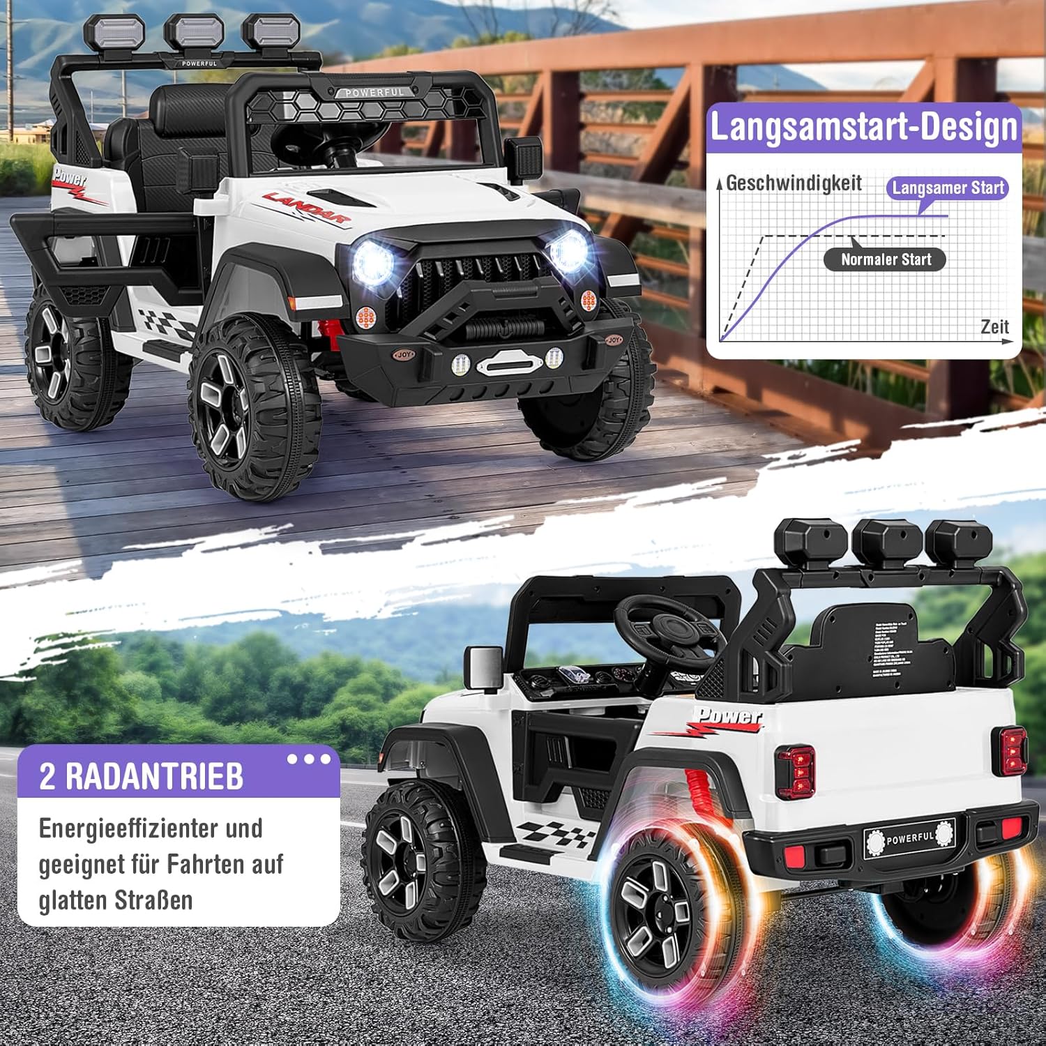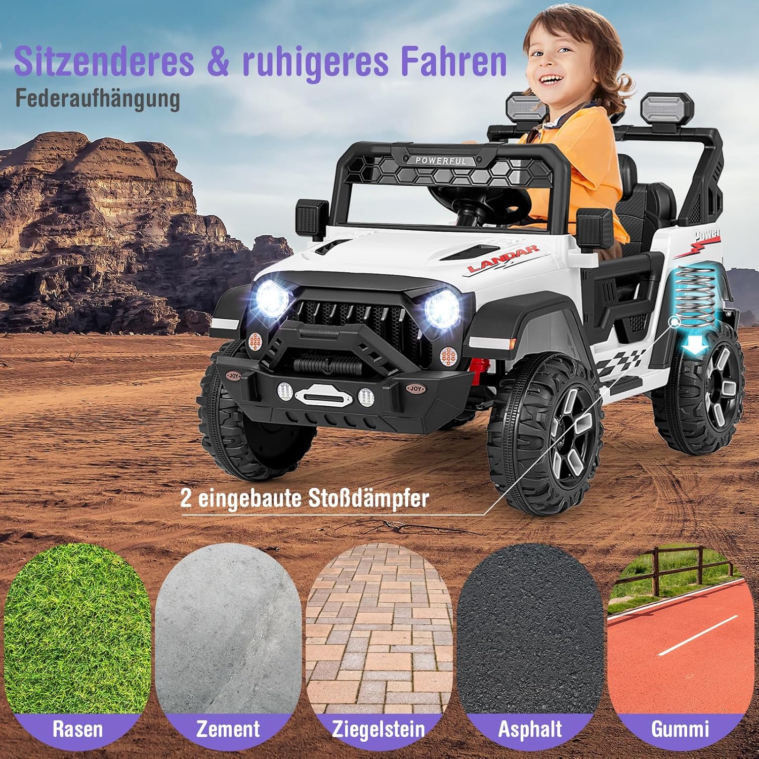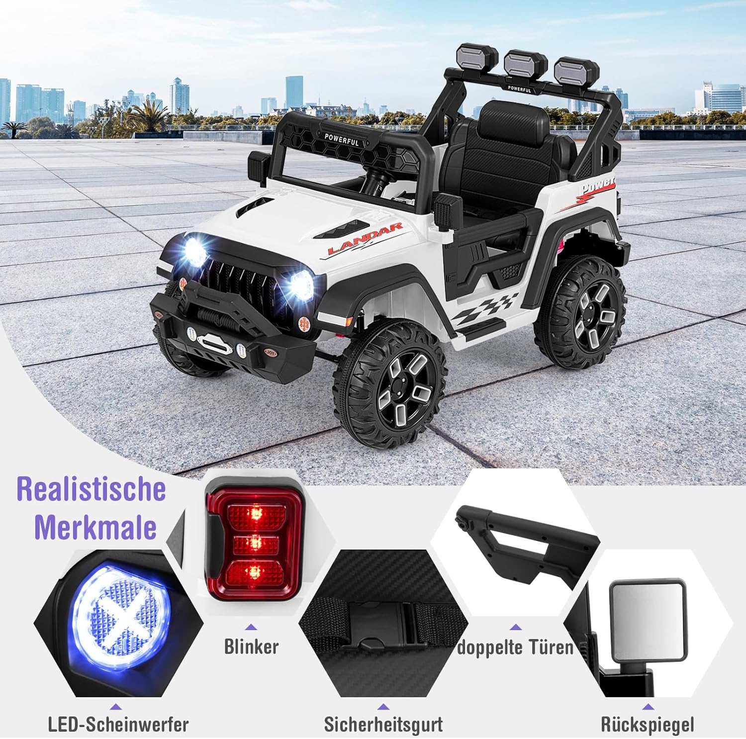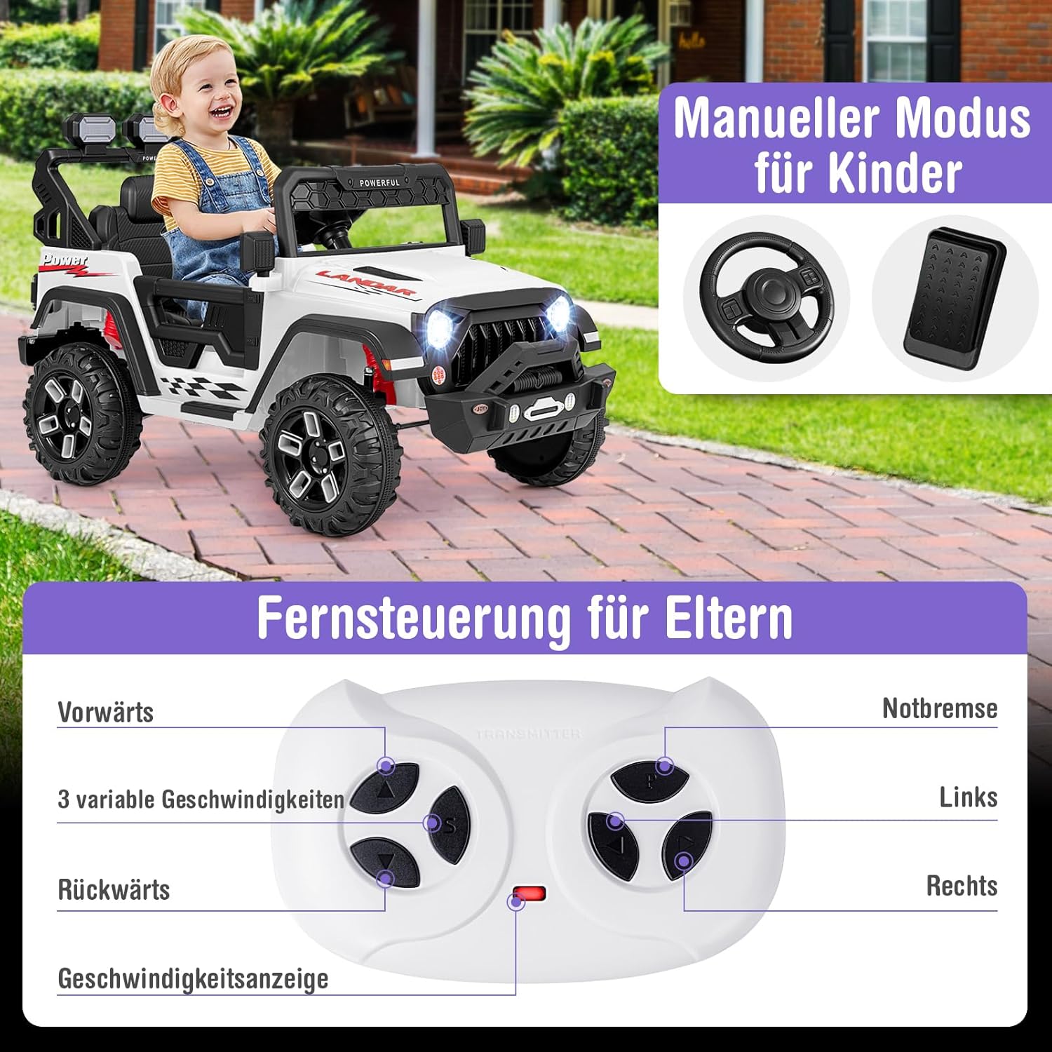 Esperienza di guida emozionante - Immergiti in un'esperienza di guida emozionante con un sedile spazioso, cintura di sicurezza e caratteristiche interessanti tra cui gli specchietti retrovisori girevoli. Questa auto elettrica per bambini è l'ultimo appuntamento di gioco su ruote e invita i piccoli avventurieri al posto di guida! Guida fluida in ogni momento: questa auto elettrica da 12 V ha una funzione di avviamento graduale e sospensioni che garantiscono una guida emozionante e fluida. Che si tratti di una festa in giardino o di un appuntamento di gioco nel parco, i bambini potranno godersi il viaggio. Due modalità di guida: i bambini possono controllare questa auto elettrica con il volante e il pedale dell'acceleratore a una velocità di 2-5 km/h. I genitori possono anche controllare il veicolo con il telecomando a 3 velocità regolabili (1-5 km/h) per migliorare l'interazione genitore-figlio. Molteplici funzionalità di intrattenimento: i bambini portano la musica e le luci in viaggio! Connessione wireless, musica, luci LED luminose e connessione per microfono trasformano ogni viaggio in una festa mobile. Questo veicolo elettrico è un grande successo e farà divertire ed emozionare i bambini. Costruzione sicura e durevole: l'auto elettrica per bambini è realizzata in PP e metallo di alta qualità, la struttura robusta garantisce stabilità e sicurezza e il sedile ampio e confortevole offre comfort. Può supportare un peso massimo di 30 kg. Nota: il telecomando richiede 2 batterie AAA (non incluse). E microfono non incluso. Per cambiare la modalità di guida, premere il pulsante in basso a sinistra del volante.