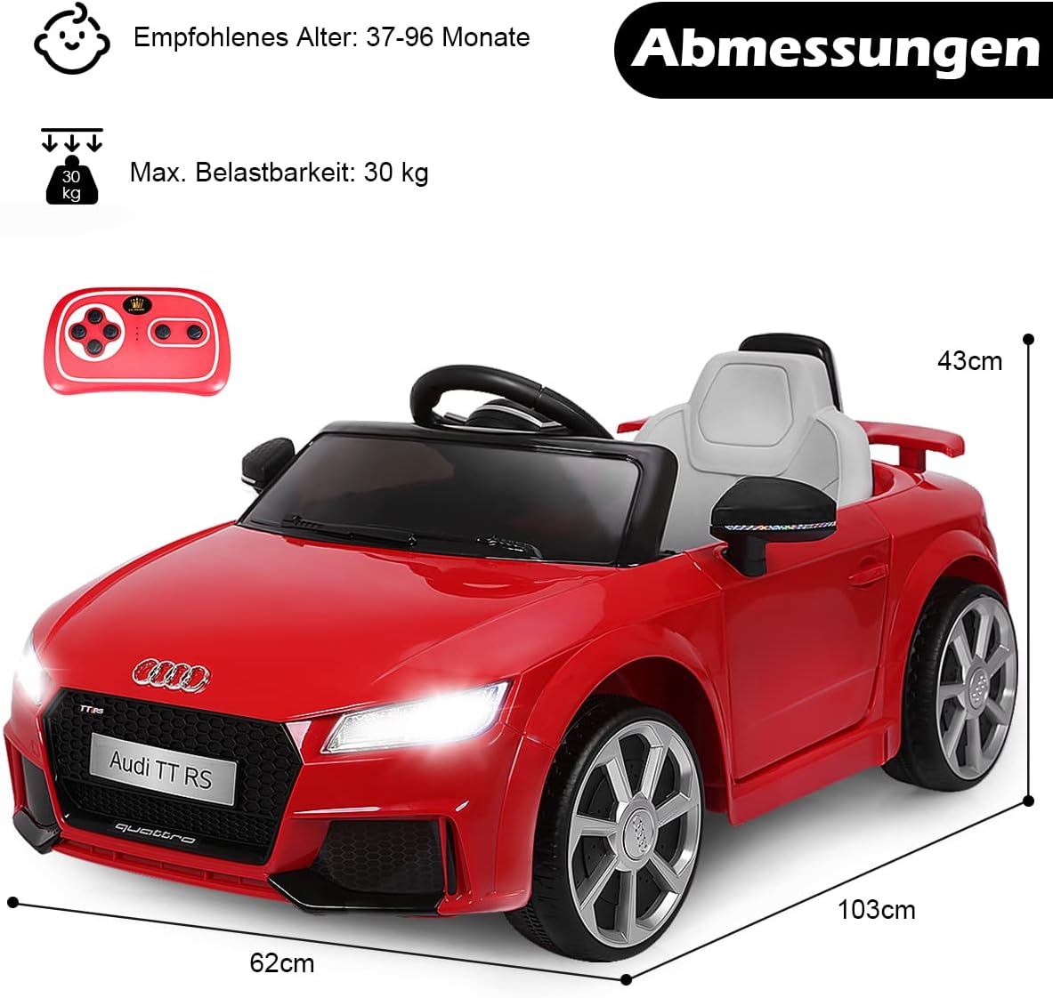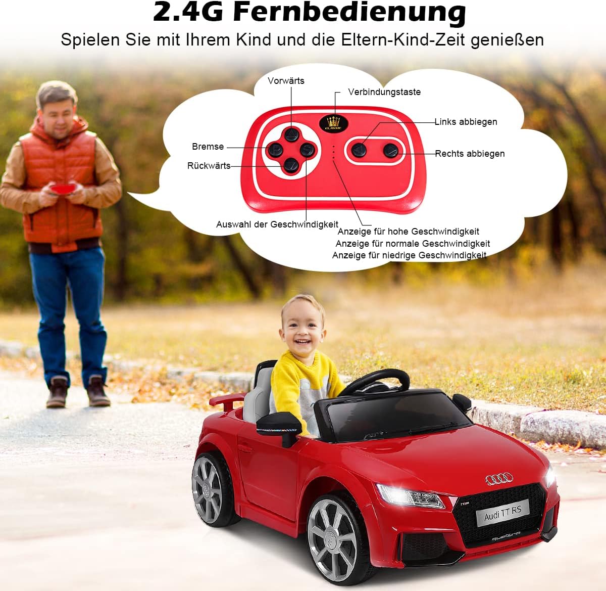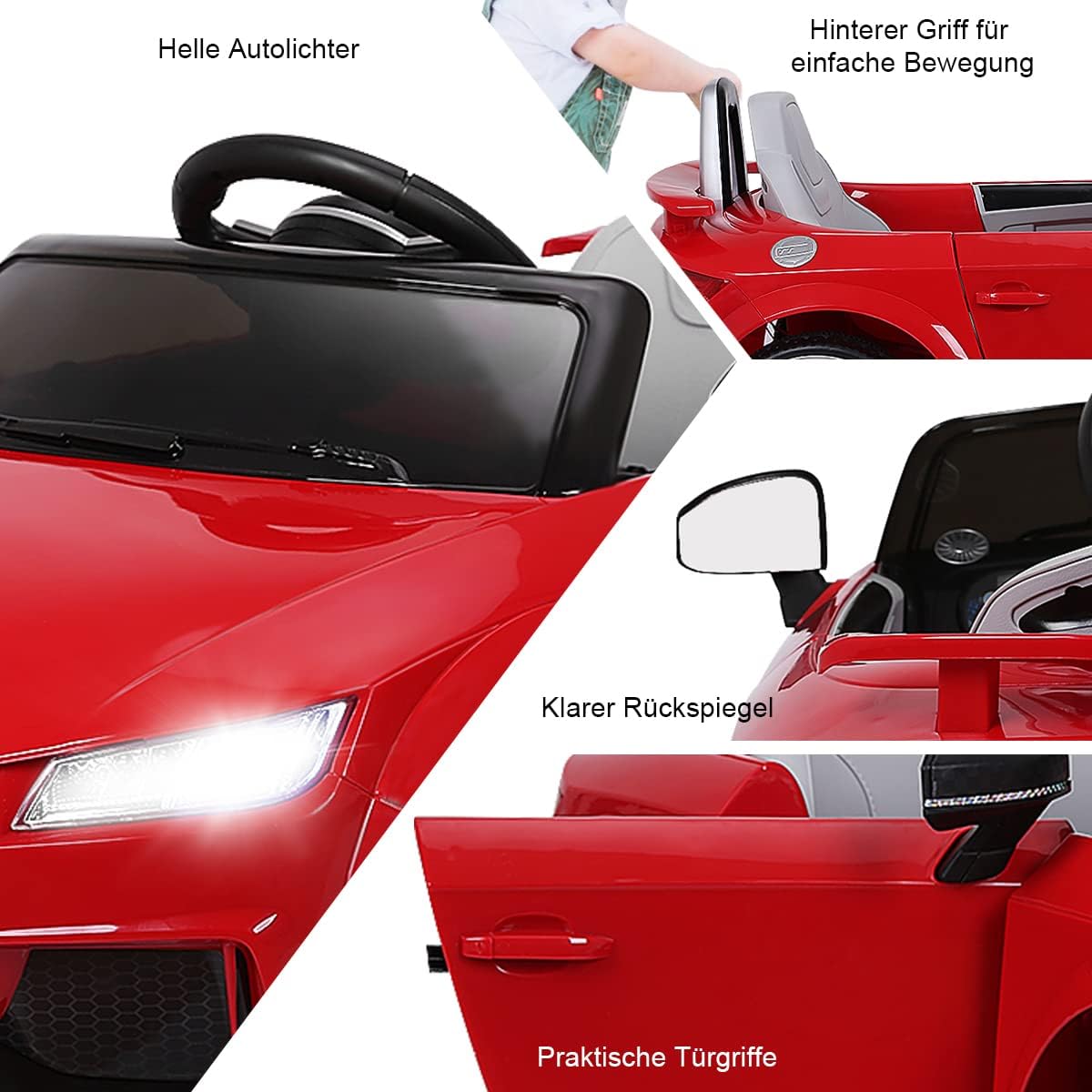 Esperienza realistica: se il bambino preme il logo sul volante durante la guida, verrà emesso il suono del clacson o del motore. Dopo che il bambino ha pedalato, l'auto può spostarsi avanti o indietro o girare a sinistra o a destra. Allo stesso tempo anche la velocità può cambiare. Caratteristiche interessanti: questo veicolo per bambini offre porte MP3 e USB, così i bambini non rimarranno mai senza la loro musica preferita. Come i veicoli stradali, anche i veicoli per bambini sono dotati di fari. Inoltre, il design a doppia porta garantisce un divertimento senza fine. Guida sicura - Grazie a quattro pneumatici più larghi e una cintura di sicurezza a 2 punti, i bambini si siedono più stabili e sicuri in macchina. Inoltre, la capacità di carico del passeggino può raggiungere i 30 kg. Inoltre, i genitori possono interrompere la trazione elettrica dell'auto in qualsiasi momento tramite il telecomando 2.4G per garantire una guida sicura dei bambini. Lungo tempo di guida: la nostra auto elettrica con indicatore di carica prolunga il tempo felice dei bambini. Anche nei fine settimana, 2 potenti motori di trazione e 2 batterie possono soddisfare la guida a lungo termine dei bambini. È lodevole che il materiale della macchinina per bambini sia ferro, PP, PE, il che rende l'auto più durevole e l'auto elettrica ha anche una maggiore durata. Il miglior regalo per i bambini: l'auto elettrica per bambini ripristina il vero aspetto secondo standard elevati, in modo che i bambini guidino con passione. Il bambino ha quindi più tempo per le attività all'aperto, il che va a beneficio della sua salute. Allo stesso tempo, questo è un regalo che non deluderà mai i bambini.