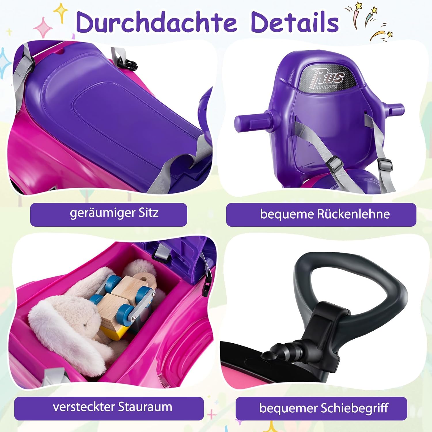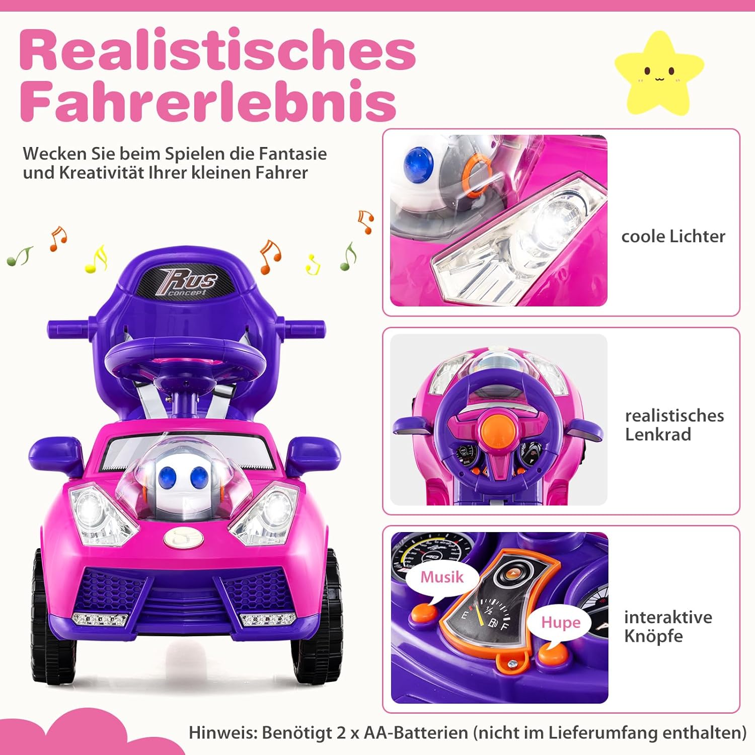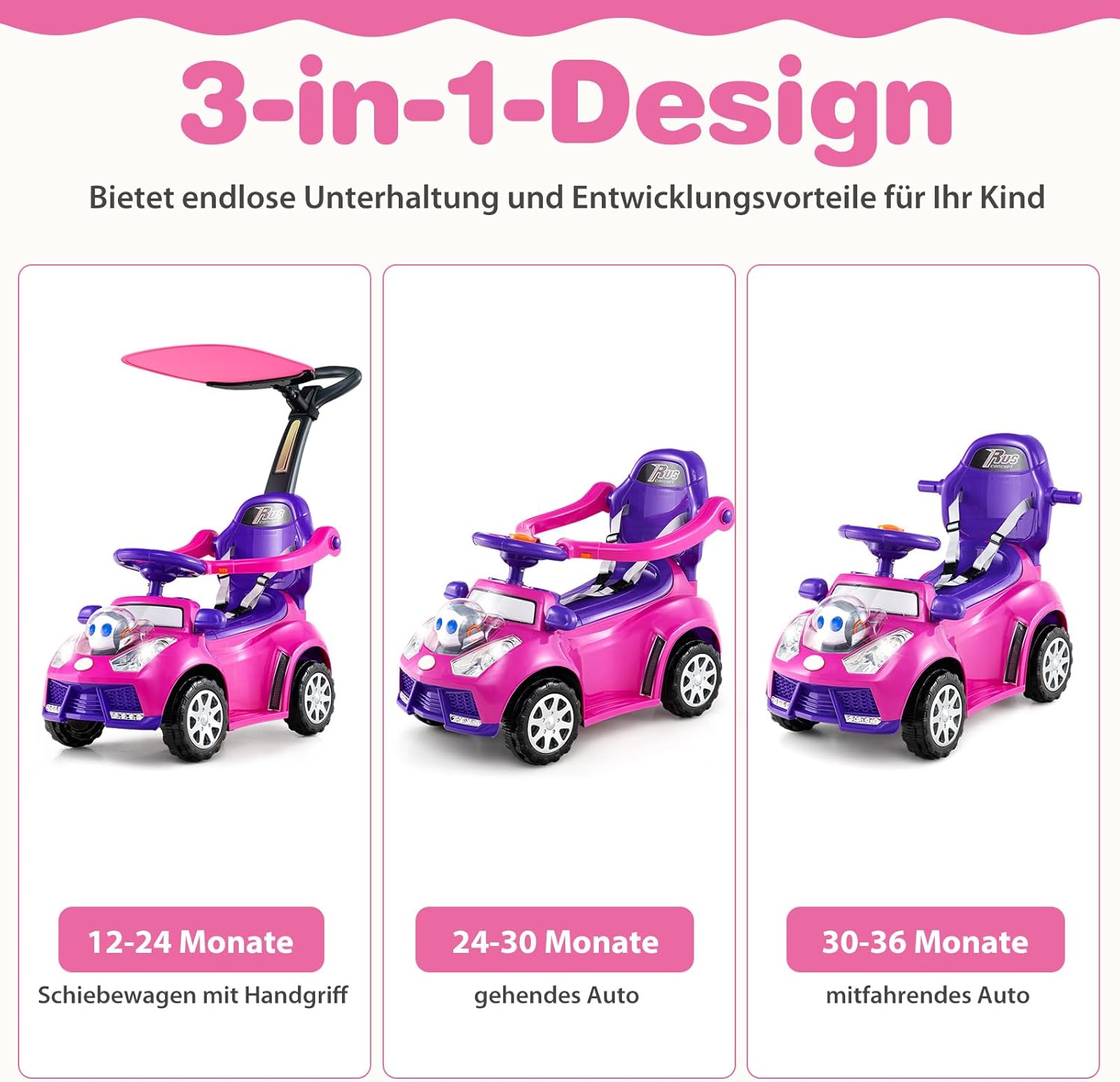 Design versatile 3 in 1: l'auto a spinta multifunzionale può essere dotata di una barra di spinta e di una barra di sicurezza per diventare un'auto a spinta. Senza la barra di spinta, diventa un passeggino che rende divertente la guida, impara a camminare e i bambini più grandi possono controllare liberamente da soli la macchina a spinta. Guida interattiva: dotato di volante funzionante, luci accattivanti, musica incantevole e un giocoso suono di clacson, il push runner offre un tempo di gioco completamente coinvolgente che stimola i sensi. Nota: richiede 2 batterie AA (non incluse). Tettuccio regolabile e ruote durevoli - Il nostro veicolo da cavalcare è dotato di tettuccio regolabile che protegge il tuo bambino dalla luce solare diretta. Inoltre, questa vettura è dotata di ruote antiscivolo e resistenti all'usura per una guida fluida. Caratteristiche di sicurezza migliorate - L'auto a spinta è dotata di parapetti per braccioli rimovibili, un'affidabile cintura di sicurezza e una staffa antirollio per proteggere i tuoi bambini durante le loro avventure avventurose e offrirti sicurezza mentre tuo figlio gioca. Spazio nascosto: scopri la comodità di un'efficiente organizzazione dei giocattoli con lo scomparto nascosto situato sotto il sedile del passeggino per bambini. È un posto perfetto per riporre i giocattoli e gli utensili preferiti di tuo figlio.
