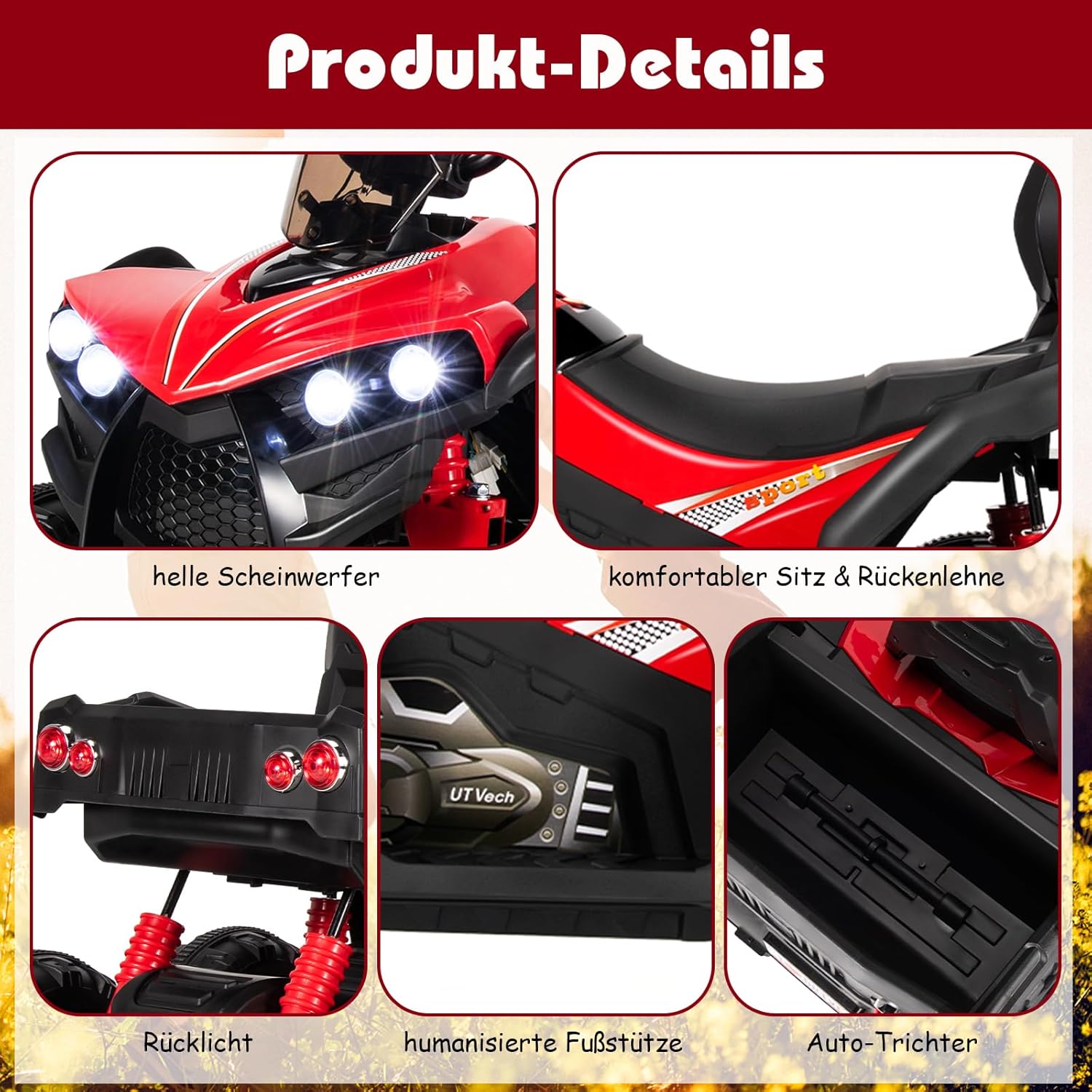 Guida sicura: il design ad avvio lento dell'auto per bambini impedisce un'accelerazione improvvisa che può far oscillare l'auto, causando lesioni indesiderate al bambino. Inoltre il pedale del freno e la maniglia per la frenata forniscono un'ulteriore garanzia di guida sicura per il tuo bambino. Sedili comodi - Il sedile spazioso e lo schienale ergonomico offrono al tuo bambino una comoda posizione seduta. Inoltre, il robusto telaio in metallo offre una capacità di carico fino a 30 kg, così il vostro bambino potrà sedersi stabilmente sopra. Ruote durevoli e ammortizzanti: le ruote resistenti all'usura si adattano bene a varie superfici come strade in cemento, strade in mattoni e marciapiedi. Inoltre, le ruote con funzione di ammortizzatore garantiscono uno scorrimento fluido e uniforme. Più divertimento da giocare: i fari e le luci posteriori del quad elettrico per bambini forniscono la giusta illuminazione di notte o in condizioni di scarsa illuminazione. Inoltre, le porte USB e cavo permettono di collegare diversi dispositivi elettronici in grado di riprodurre facilmente musica o storie, aumentando il piacere di guida del bambino. Regalo perfetto - Alimentato da un potente motore, il quad elettrico per bambini consente al bambino di provare un piacere di guida libero e divertente.