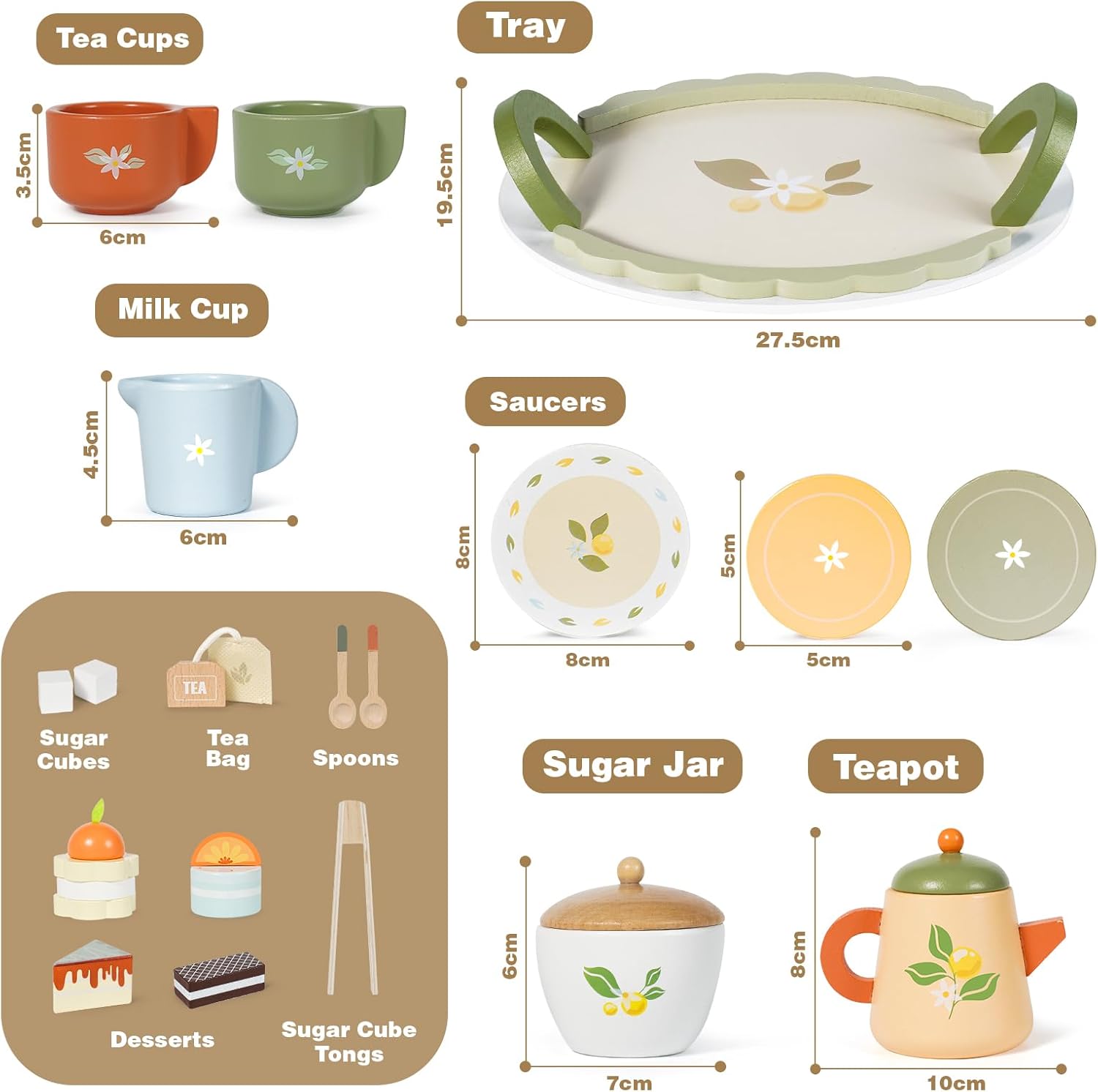 [Set da Tè Giocattoli in Legno] Tutto per il gioco di finzione: 2 tazze da tè, 1 teiera, 1 lattiera, 1 vassoio, 3 piatti, 1 zuccheriera e realistici biscotti e dessert finti. Ideale per fantasiose feste del tè con questo servizio da tè per bambini. [Design sicuro e adatto ai bambini piccoli] Questo servizio da tè in legno per bambini piccoli è progettato per un gioco sicuro e pratico ed è realizzato con bordi lisci e arrotondati e materiali atossici. Ha le dimensioni perfette per essere impugnato ed esplorato dalle manine dei più piccoli. [Vivace e organizzato] I colori vivaci e adatti ai bambini ispirano la creatività, mentre il vassoio incluso mantiene questo servizio da tè in legno per bambini piccoli in ordine durante il gioco e lo stoccaggio. Design semplice e pratico per allegre feste del tè. [Capacità motorie e creatività] Il servizio da tè in legno aiuta i bambini a esercitarsi a versare, condividere e raccontare storie, supportando lo sviluppo della motricità fine e il gioco di ruolo creativo. [Regalo perfetto] Confezionato con cura e pronto per essere regalato, questo set da tè per bambini è un grazioso regalo di compleanno, per le feste o per un'occasione speciale. Incoraggia l'interazione sociale e il gioco creativo.